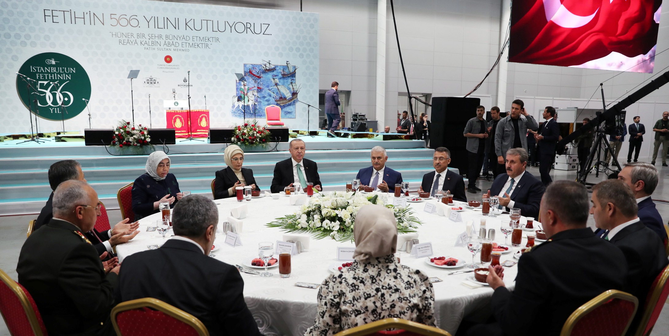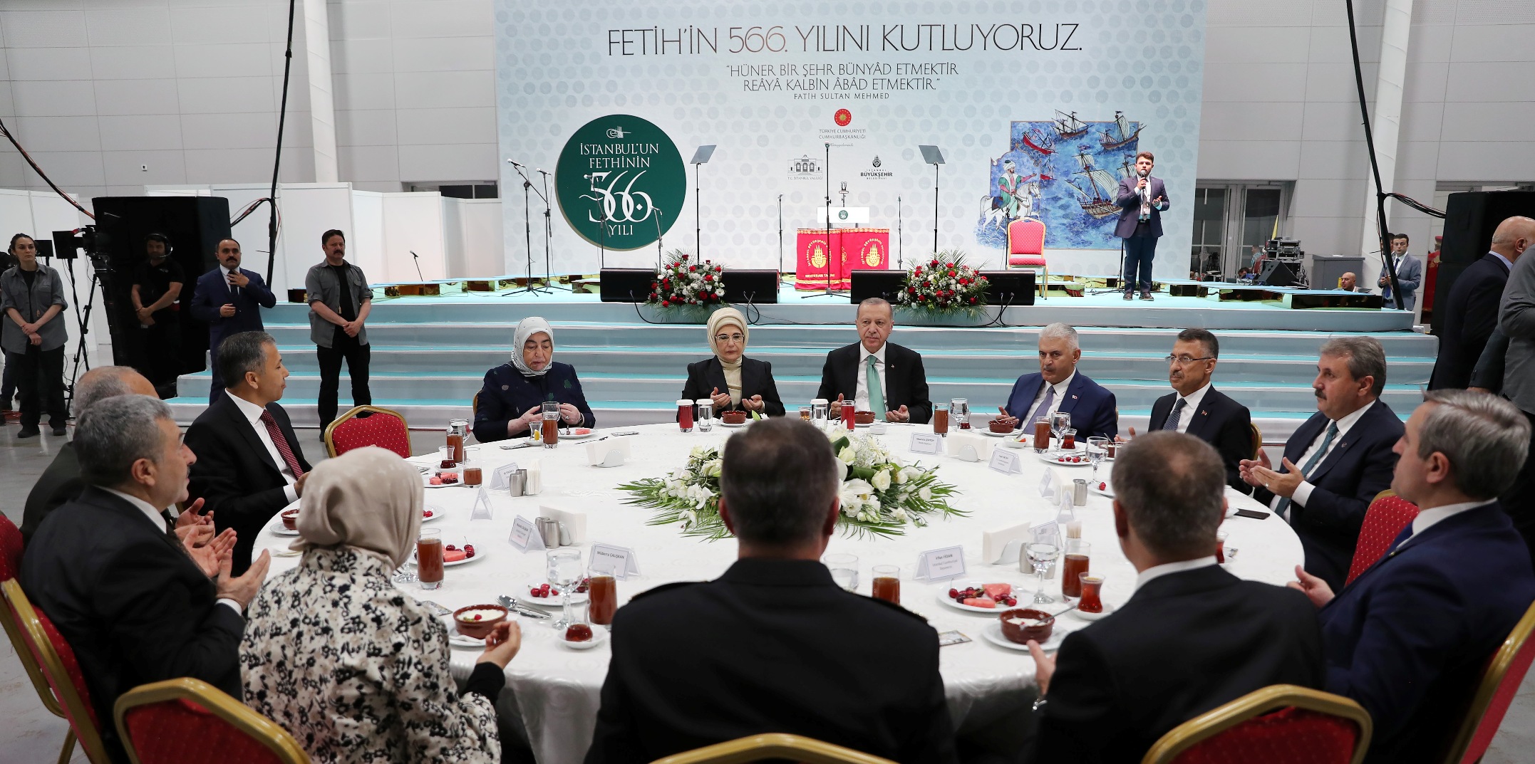 Cumhurbaşkanı Erdoğan, Türkiye'yi ve İstanbul'u 2053 vizyonuna beraberce taşıyacaklarını dile getirerek, "2023, Türkiye'nin inşallah 100. yıl dönümü olacak. 100. yıl dönümünde de 1919 Samsun'a çıkışı nasıl kutladıysak, inşallah 2023'ü de öyle kutlayacağız. Bir kez daha İstanbul'un fethinin 566. yıl dönümünü tebrik ediyorum. Fatih Sultan Mehmet Han'ın şahsında tüm İstanbul fethinin şehitlerine, gazilerine şahsım, milletim, ümmet adına rahmet diliyorum. Ecdadın her bir kahramanını tazimle, rahmetle, hürmetle yad ediyorum. Şimdiden Ramazan Bayramı'nızı kutluyorum." şeklinde konuştu.
