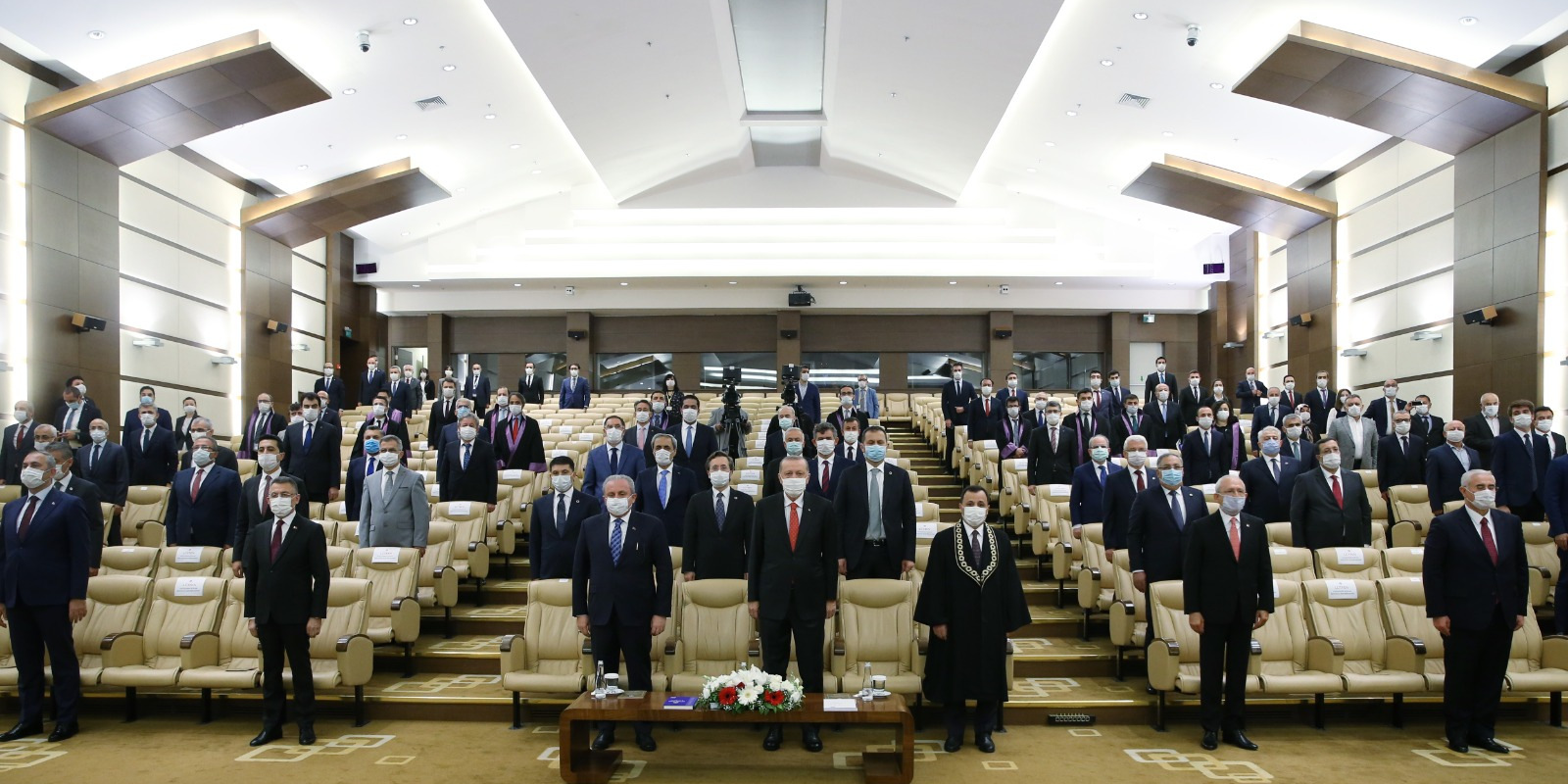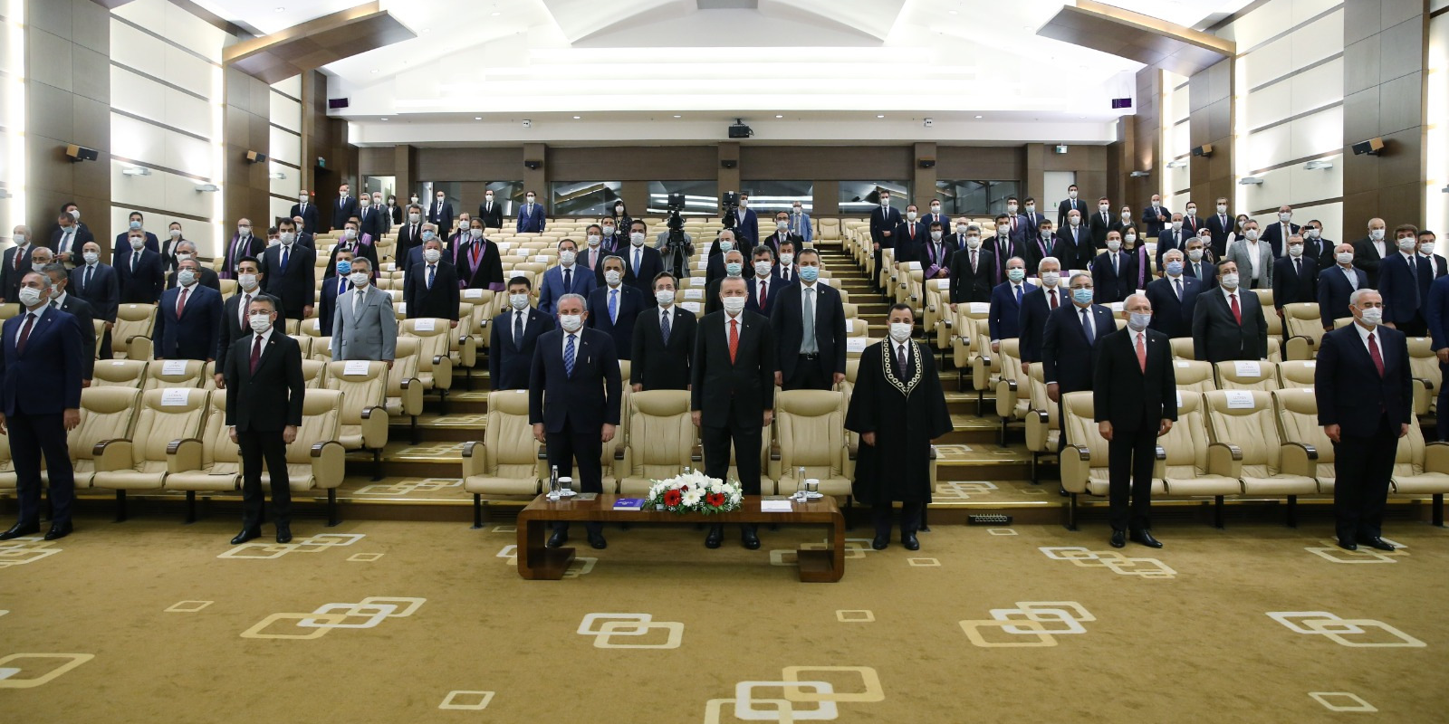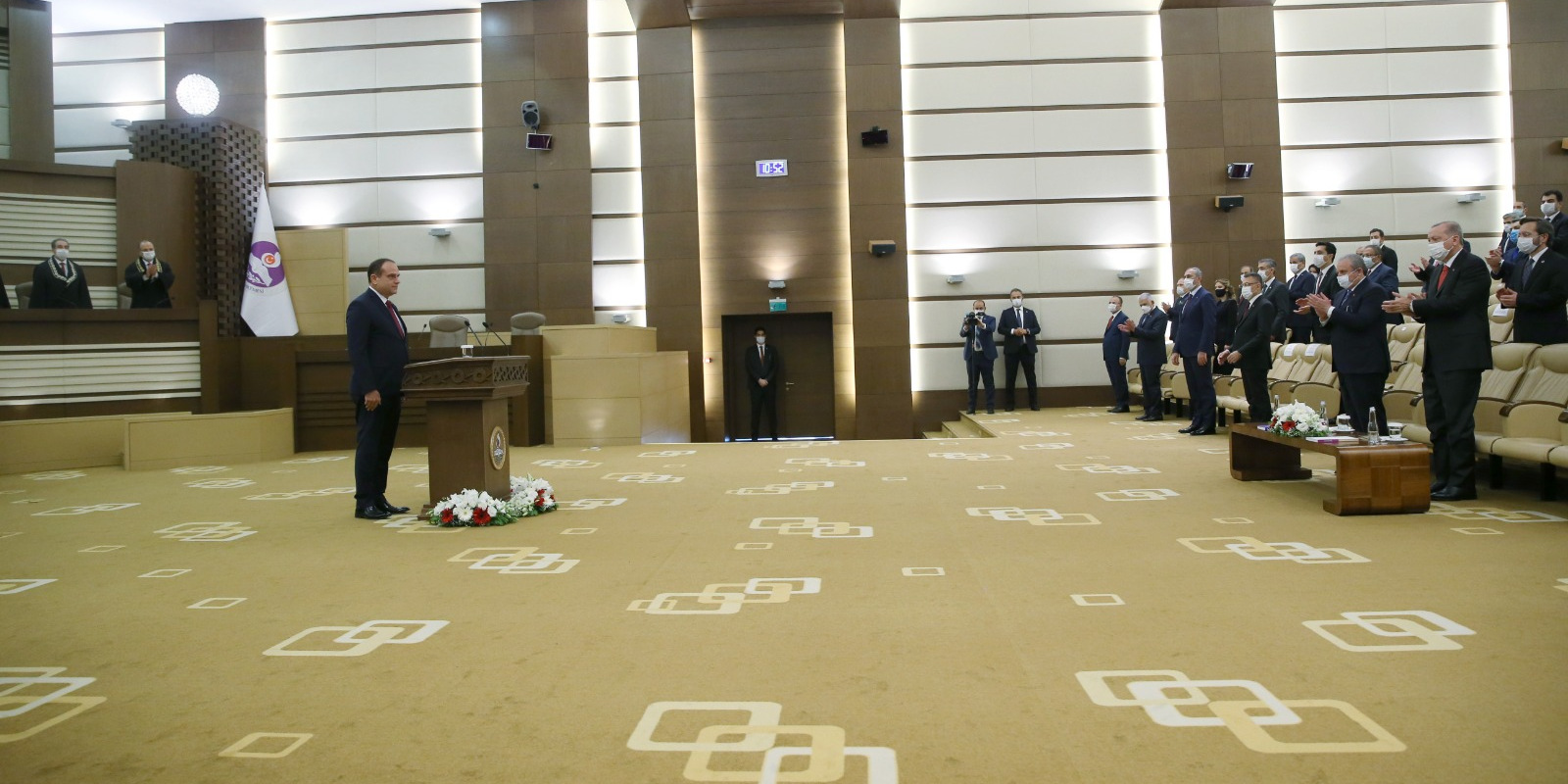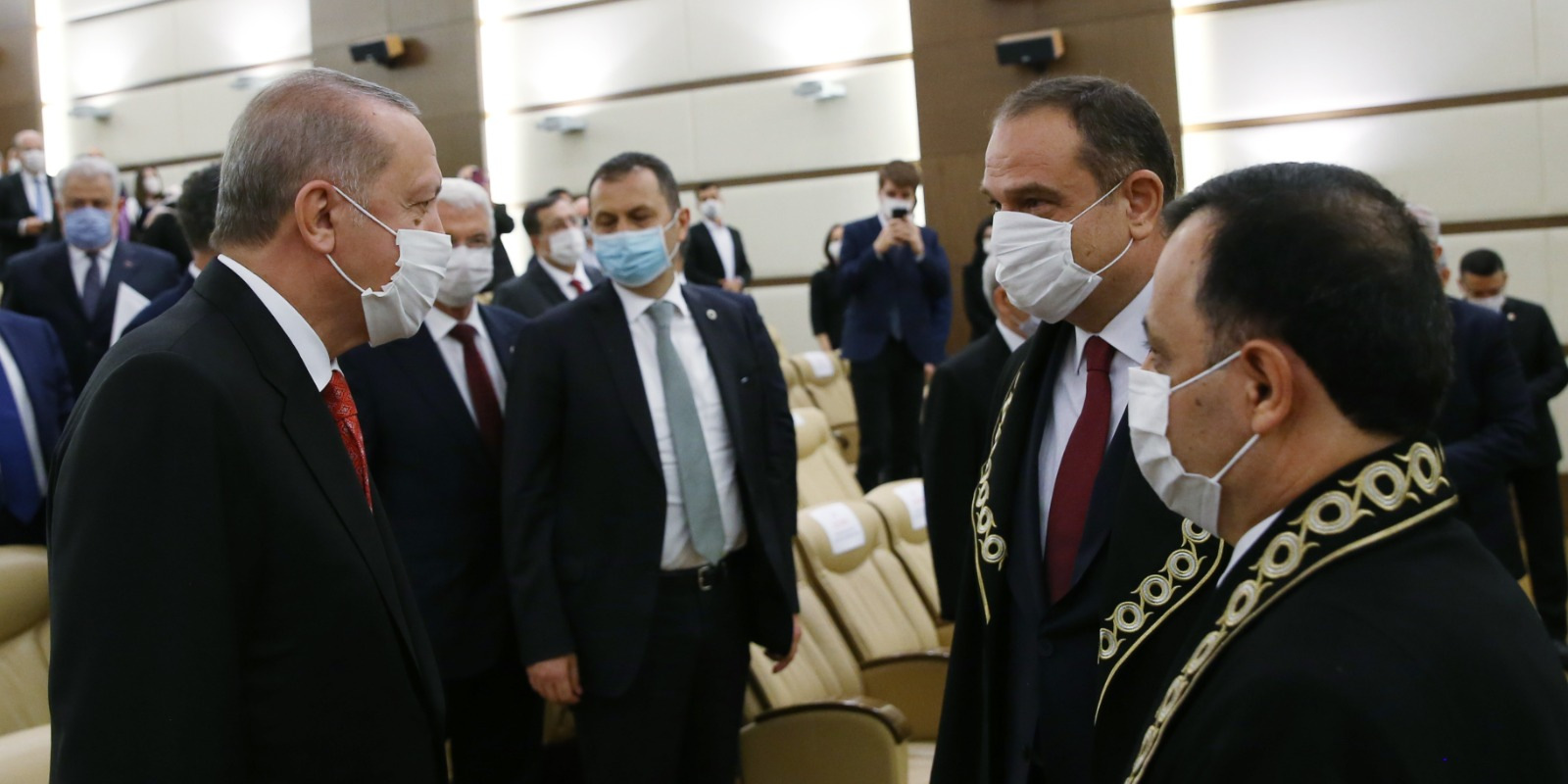 Anayasa Mahkemesi’nde gerçekleştirilen törene gelişinde Anayasa Mahkemesi Başkanı Zühtü Arslan tarafından karşılanan Cumhurbaşkanı Erdoğan, daha sonra törenin düzenlendiği salona geçti.