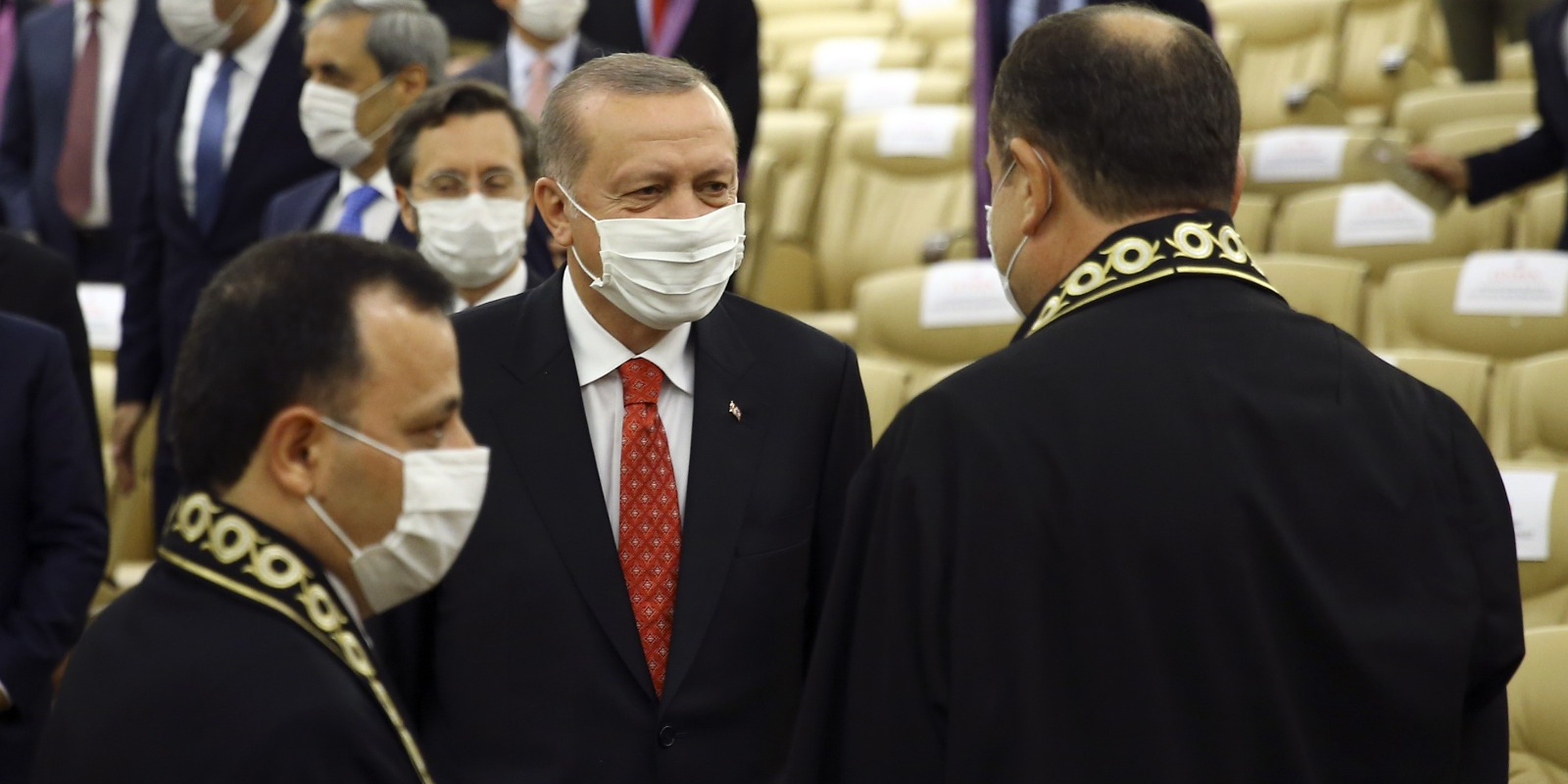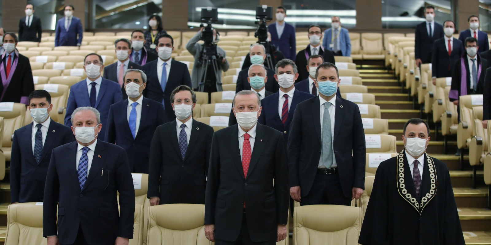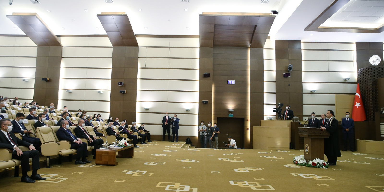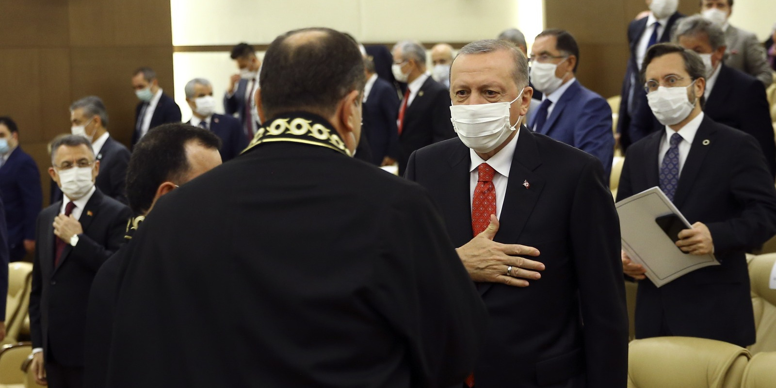 Anayasa Mahkemesi’nde gerçekleştirilen törene gelişinde Anayasa Mahkemesi Başkanı Zühtü Arslan tarafından karşılanan Cumhurbaşkanı Erdoğan, daha sonra törenin düzenlendiği salona geçti.