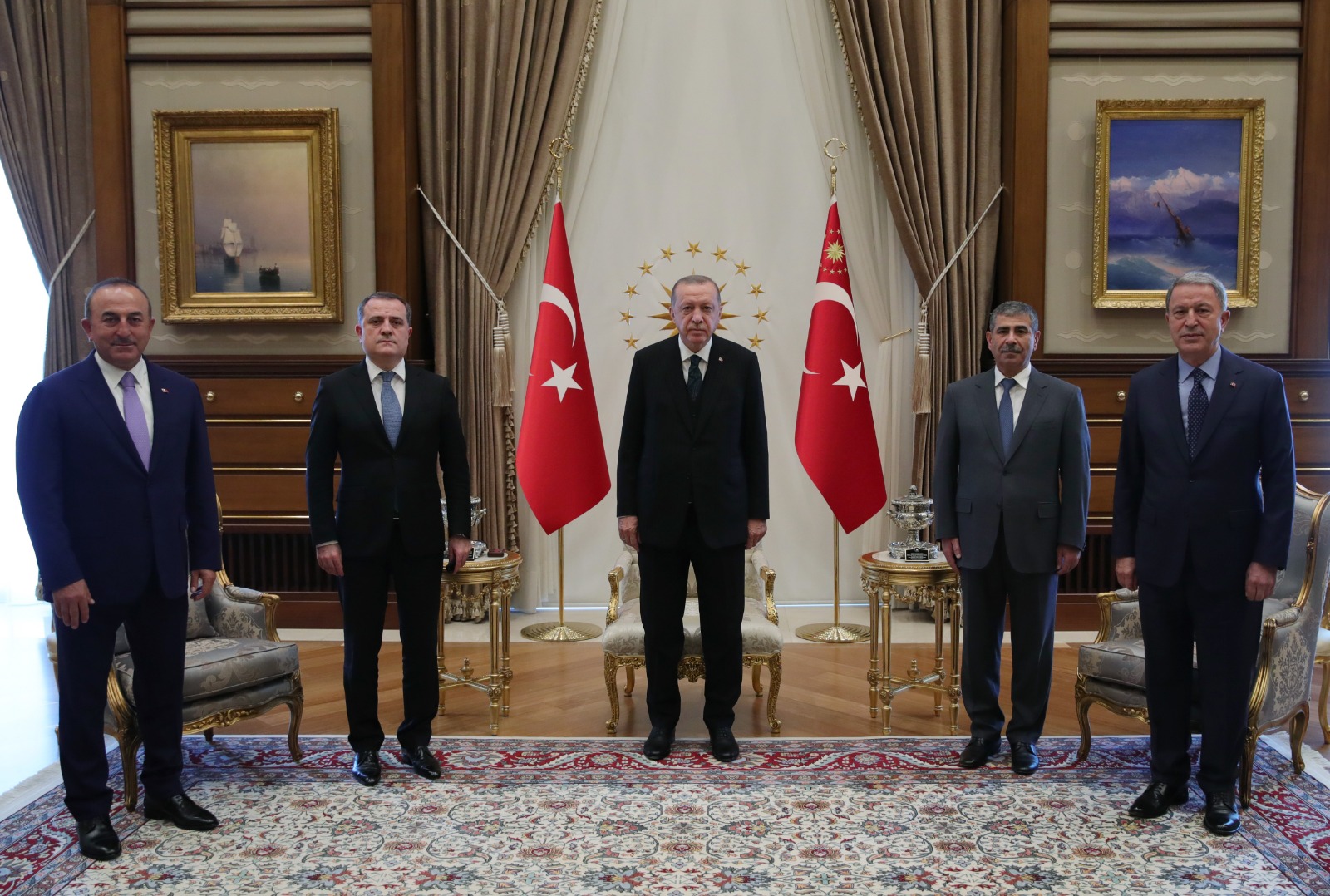 Cumhurbaşkanı Recep Tayyip Erdoğan, Azerbaycan Dışişleri Bakanı Ceyhun Bayramov ile Savunma Bakanı Zakir Hasanov'u kabul etti. Cumhurbaşkanlığı Külliyesi'ndeki kabul, 45 dakika sürdü.