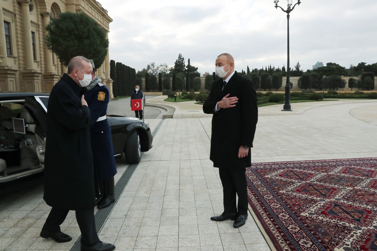 Gençlik Sarayı'nda gerçekleştirilen karşılama töreninde Azerbaycan Cumhurbaşkanı Aliyev, Cumhurbaşkanı Erdoğan'ı makam aracından inişinde karşıladı.