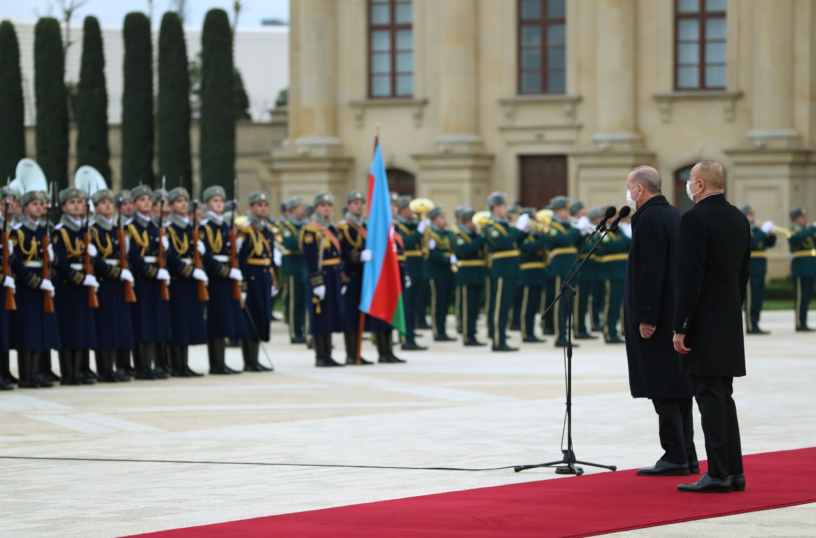 Cumhurbaşkanı Erdoğan ve Azerbaycan Cumhurbaşkanı Aliyev'in tören alanındaki yerlerini almasının ardından iki ülke milli marşları çalındı.
