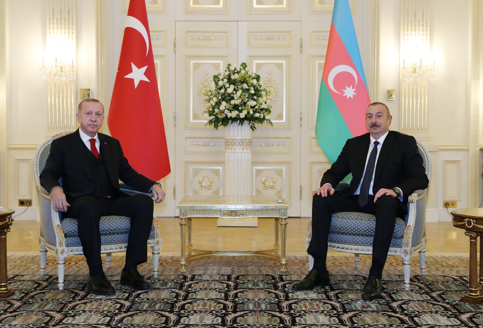 Heyetlerin takdiminin ardından askeri geçit törenini izleyen Cumhurbaşkanı Erdoğan ve Azerbaycan Cumhurbaşkanı Aliyev, daha sonra baş başa görüşmeye geçti.