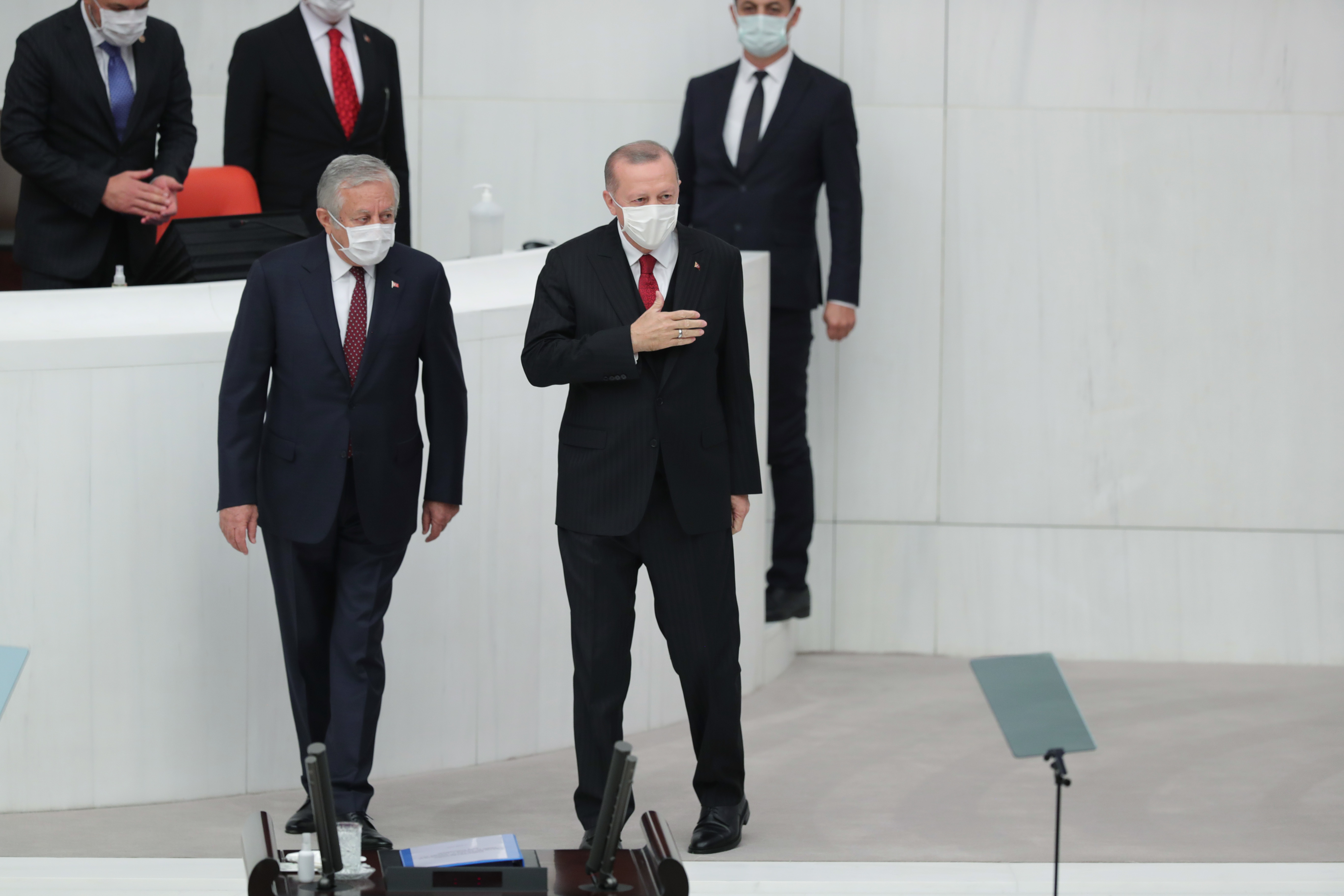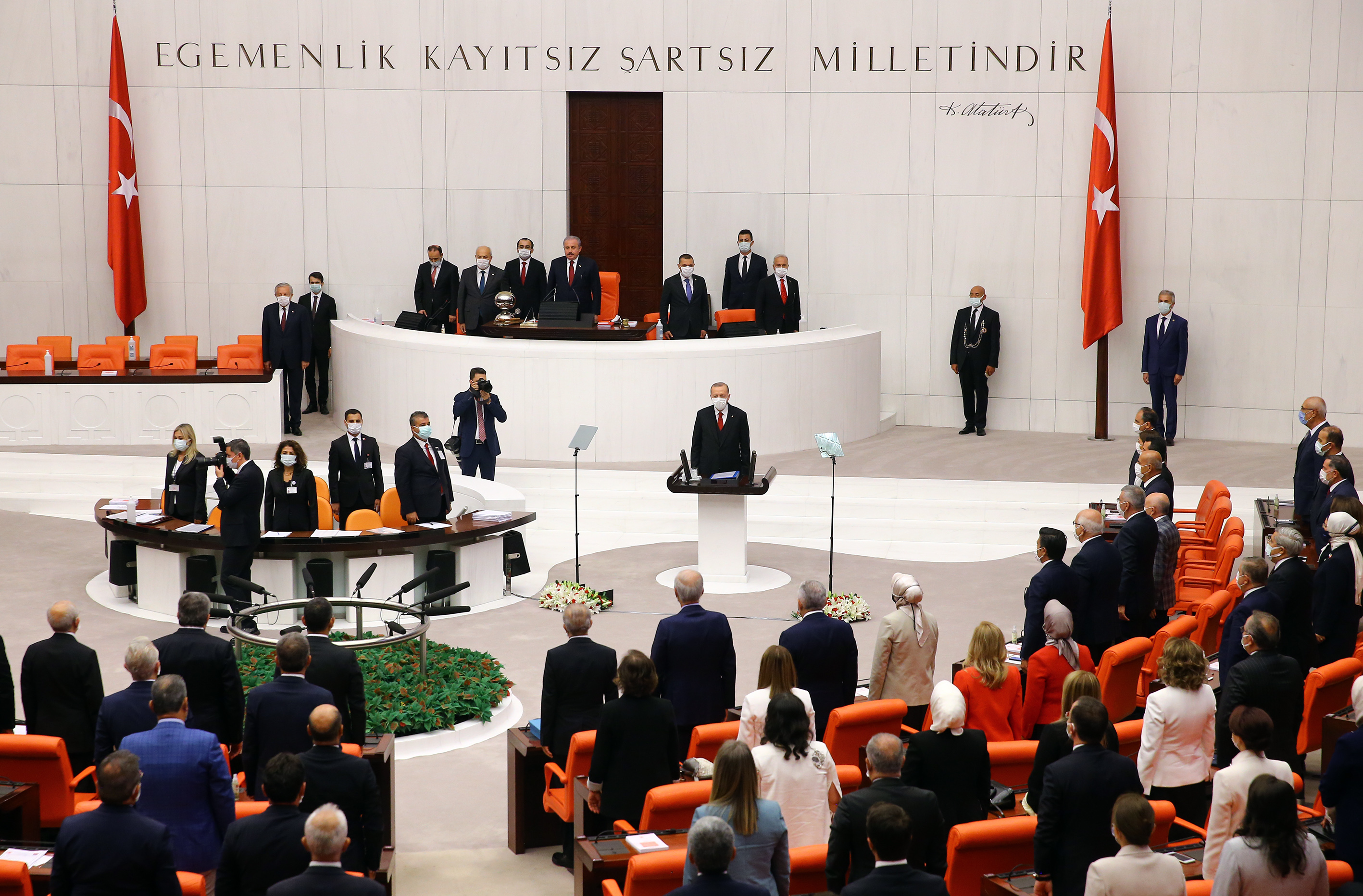 "Bu yılın ilk çeyreğinde elde ettiğimiz yüzde 4,4 oranındaki büyüme oranı, hedeflerimize doğru kararlılıkla ilerlediğimizin işaretiydi. Dünyanın tamamıyla birlikte ülkemizi de etkisi altına alan koronavirüs salgınına, işte böyle bir iklimde yakalandık. Salgın sürecinde, elbette önceliğimiz milletimizin sağlığını korumaktı. Bunun yanında, açıkladığımız destek paketleriyle ekonomimizin salgından en az hasarla çıkmasını temin etmeye çalıştık. Bugüne kadar açıkladığımız desteklerin ve paketlerin toplam ekonomik büyüklüğü 495 milyar lirayı, yani milli gelirimizin yaklaşık yüzde 10'unu bulmuştur. Sosyal koruma kalkanı çatısı altında milletimize ve ekonomimize 35 milyar lirayı aşkın karşılıksız ödeme yaptık."