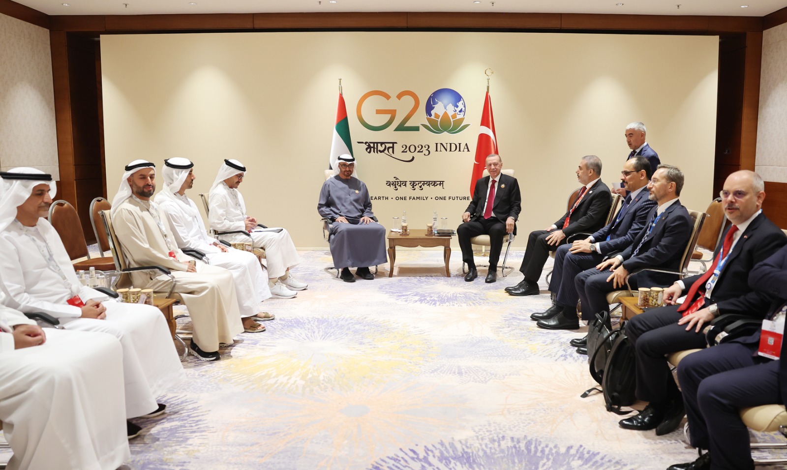 Cumhurbaşkanı Recep Tayyip Erdoğan, 18'nci G20 Liderler Zirvesi dolayısıyla bulunduğu Hindistan’ın başkenti Yeni Delhi'de, Birleşik Arap Emirlikleri (BAE) Devlet Başkanı Şeyh Muhammed Bin Zayed Al Nahyan ile bir araya geldi.
