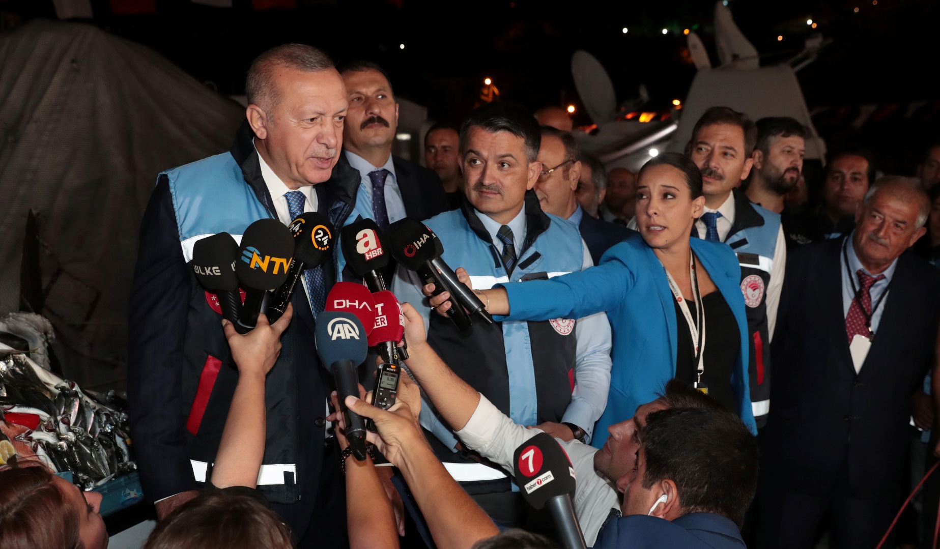 Üzerinde Cumhurbaşkanlığı forsu bulunan su ürünleri kontrol yeleği giyen Erdoğan, gazetecilerin sorularını yanıtladı.