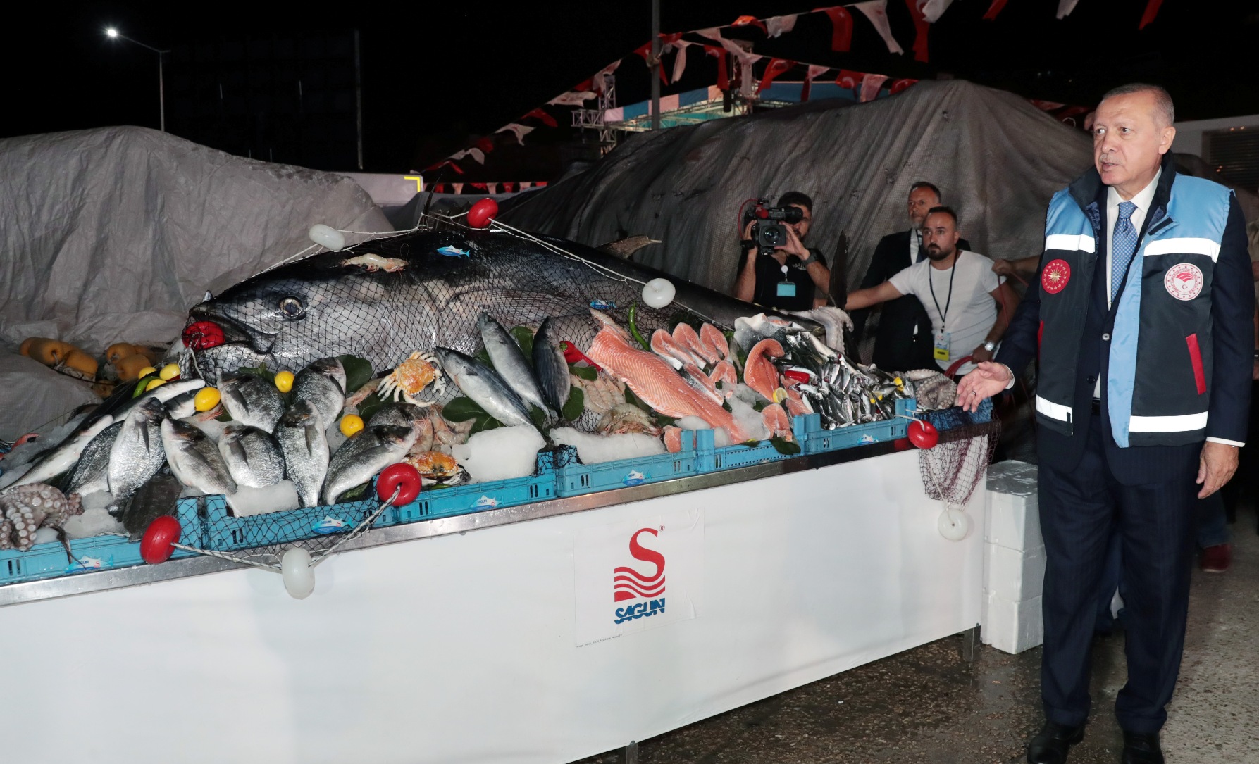 Bu yıl hangi balıkların bol olduğununu yetkililere soran Erdoğan, "Gökten ne yağar ki yer kabul etmez? Biz Allah'tan gelene 'Eyvallah' diyoruz. Orkinosu kendimiz yemiyoruz, ihraç ediyoruz. Bir de orkinosta konserve olayımız bayağı iyi. Japonya'ya ihracatımız var. Orkinosun da gerçekten konservesi süper. Yolculuklarda tavsiye ederim. Sanal yetiştiricilik olayı, turistik yerlerde sıkıntı üretiyor, turistik yerlerden uzak olursa güzel ama turistik yerlere yakın olduğu zaman orada bana gelen şikâyetleri söylüyorum, kirlilik üretiyor. Çiftlik olayında böyle bir durum söz konusu. Ne kadar uzak olursak turizmi de o kadar koruma altına almış oluruz." ifadelerini kullandı.