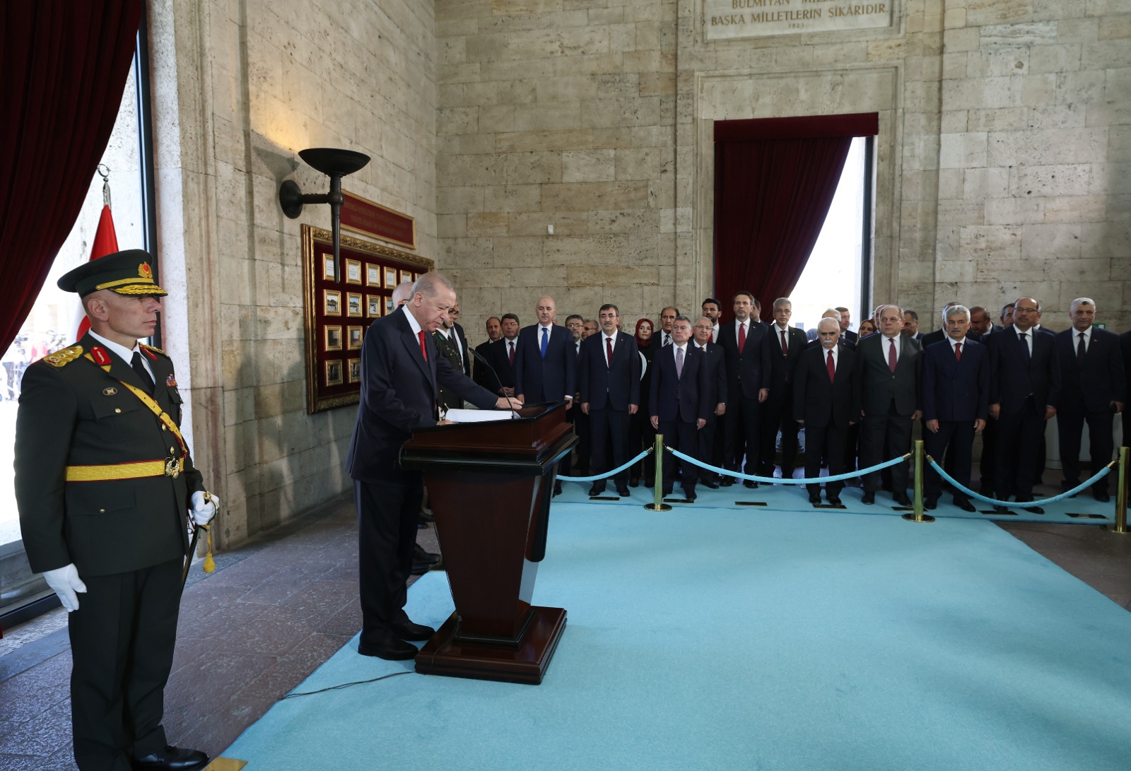 Cumhurbaşkanı Erdoğan, Atatürk'ün mozolesine ay yıldız motifli çelenk bıraktı.