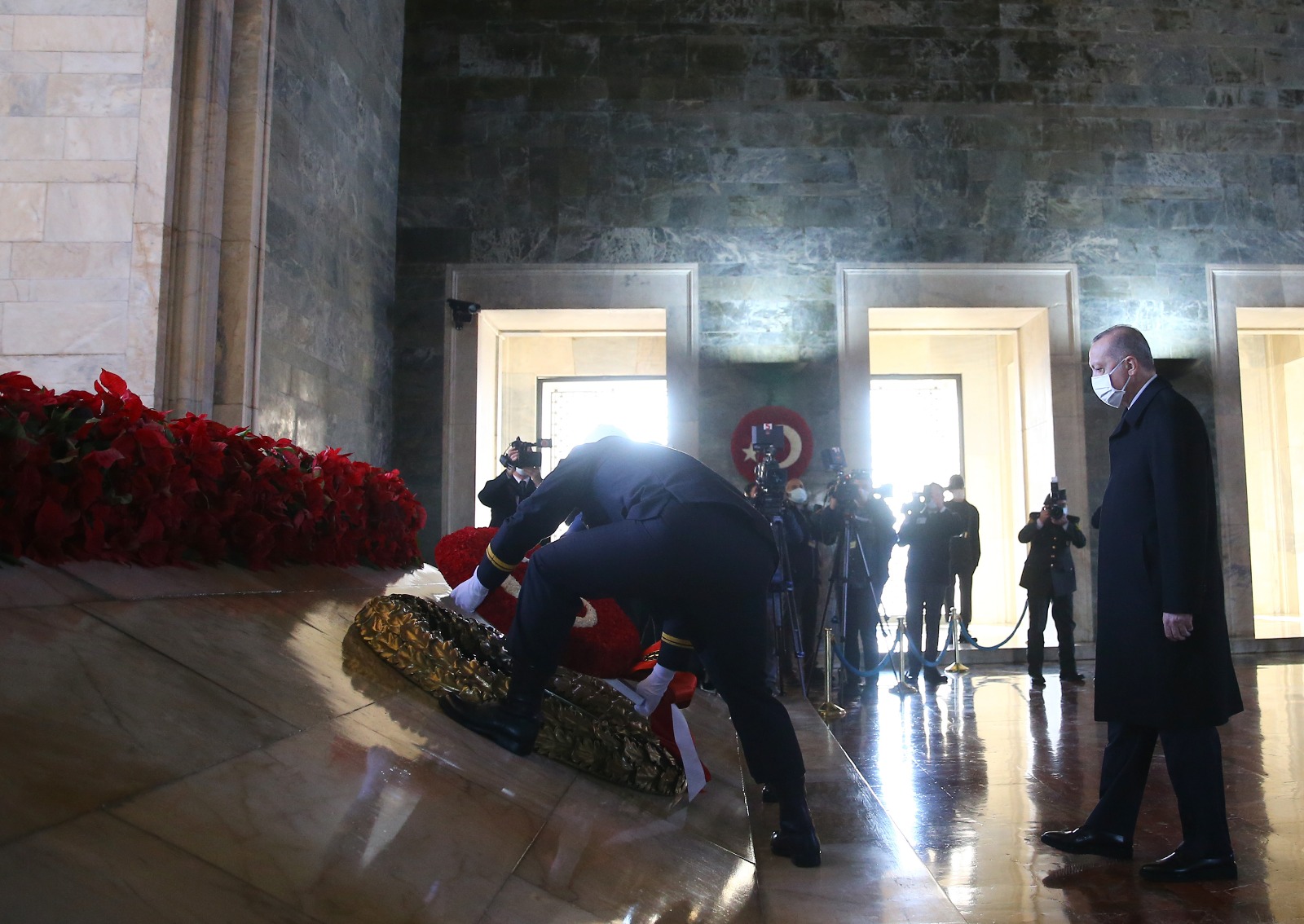 Cumhurbaşkanı Erdoğan, kırmızı beyaz karanfillerden oluşan ay yıldızlı çelengi, Atatürk'ün mozolesine bıraktı. Atatürk'ün 82 yıl önce vefat ettiği saat olan 09.05'te saygı duruşunda bulunuldu ve ardından İstiklal Marşı okundu.