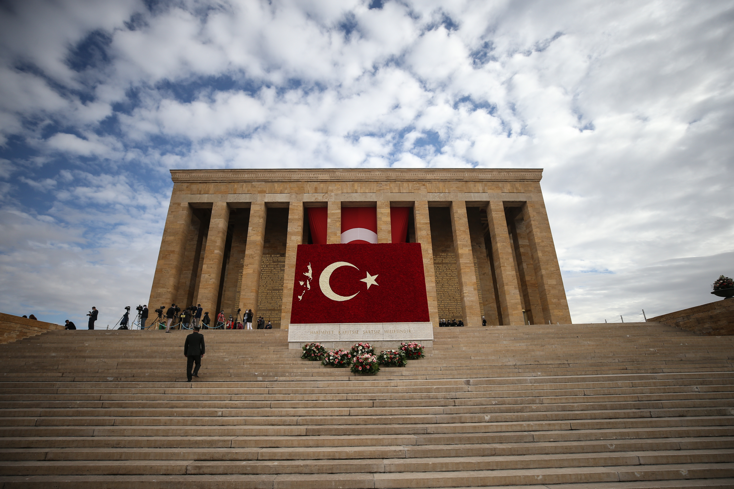 Erdoğan'ın, üzerinde ay yıldız bulunan çelengi Atatürk'ün mozolesine bırakmasının ardından, saygı duruşunda bulunuldu ve İstiklal Marşı okundu.