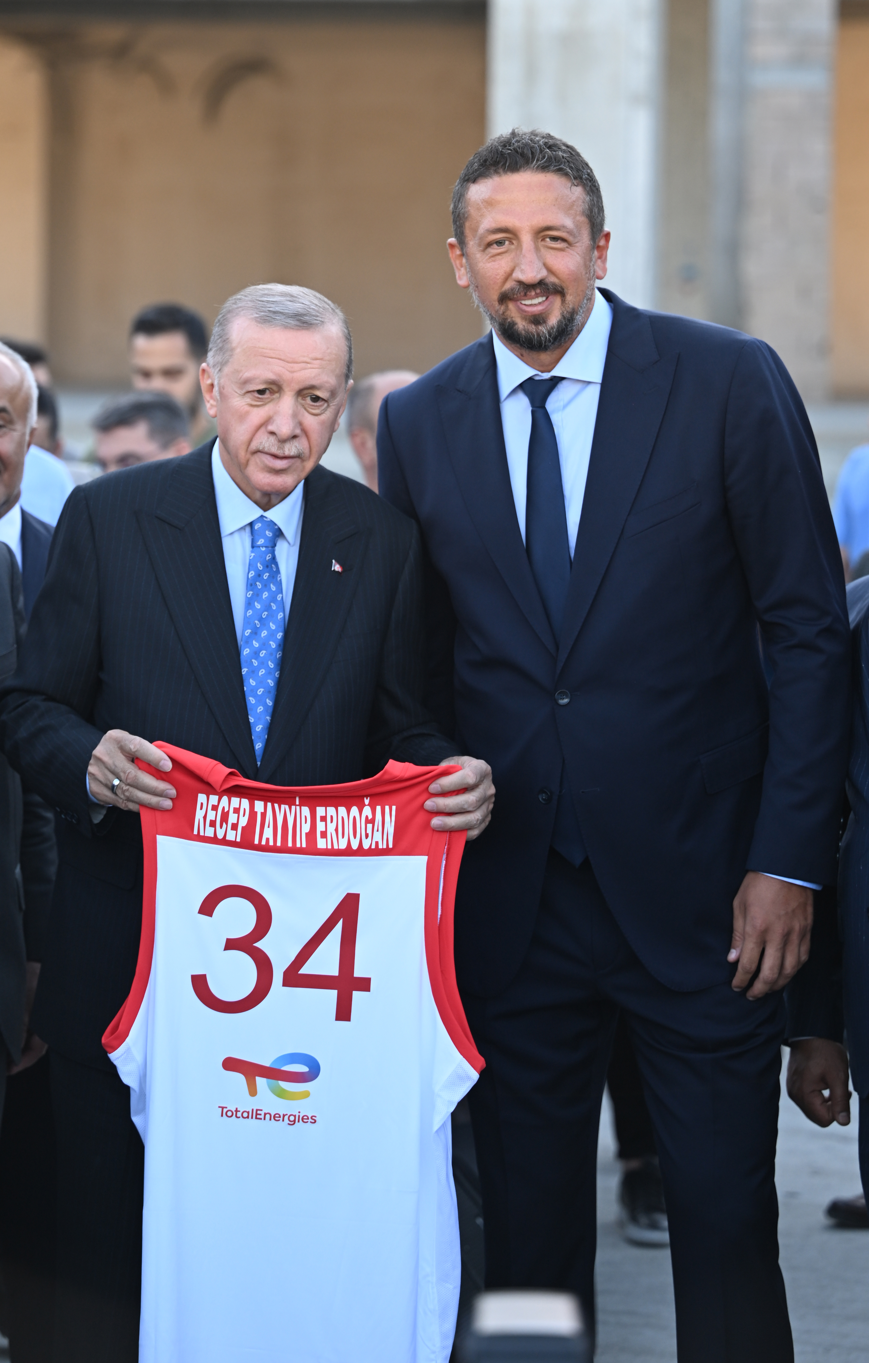 Cumhurbaşkanı Erdoğan, açıklamalarının ardından gazetecilere basketbol topu hediye etti.