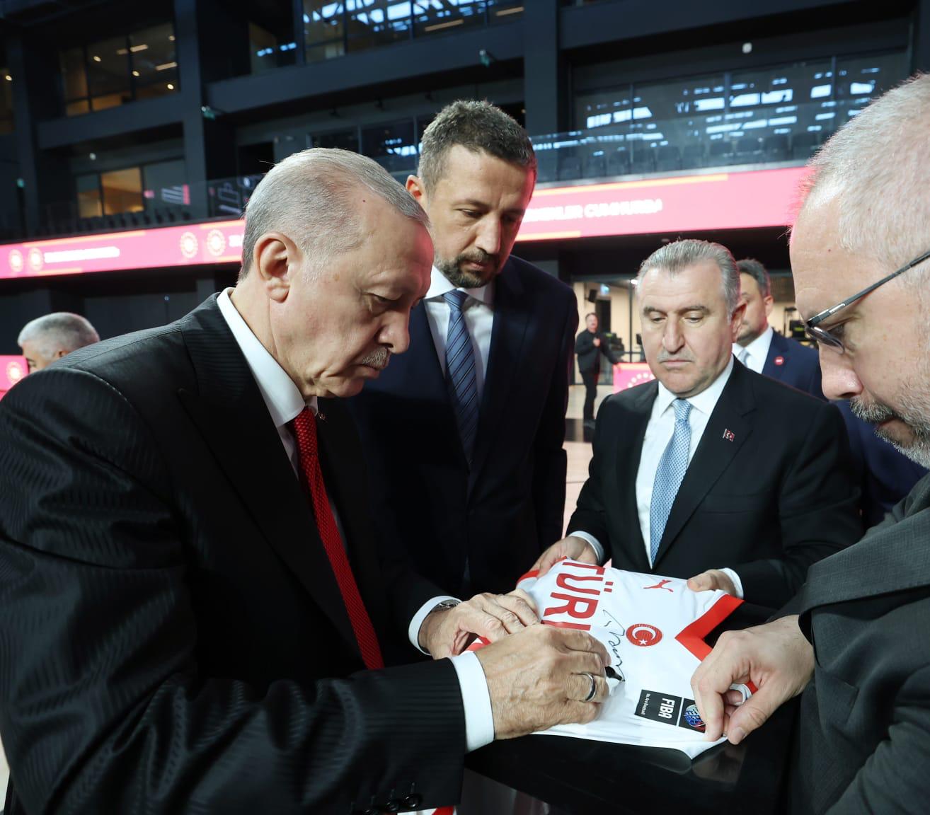 Sahada bulunanlarla atış yapan Cumhurbaşkanı Erdoğan, ardından üzerinde adının yazdığı Basketbol Millî Takımı forması ile basketbol toplarına imza attı.