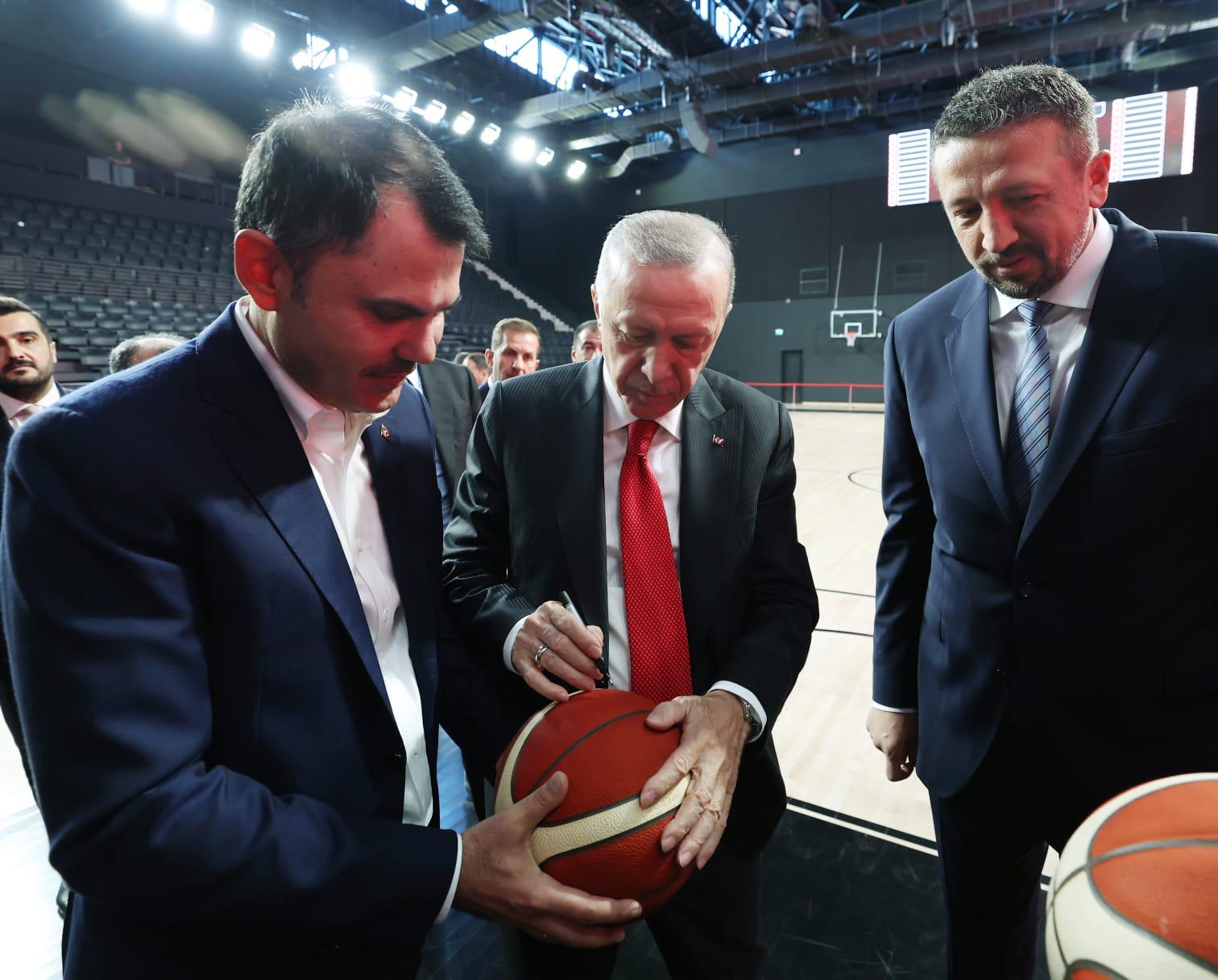 Tesisin özelliklerini TBF Başkanı Türkoğlu'ndan dinleyen Cumhurbaşkanı Erdoğan, AK Parti milletvekili Mustafa Varank'ın elindeki basketbol topunu Bakan Bak'a attı.