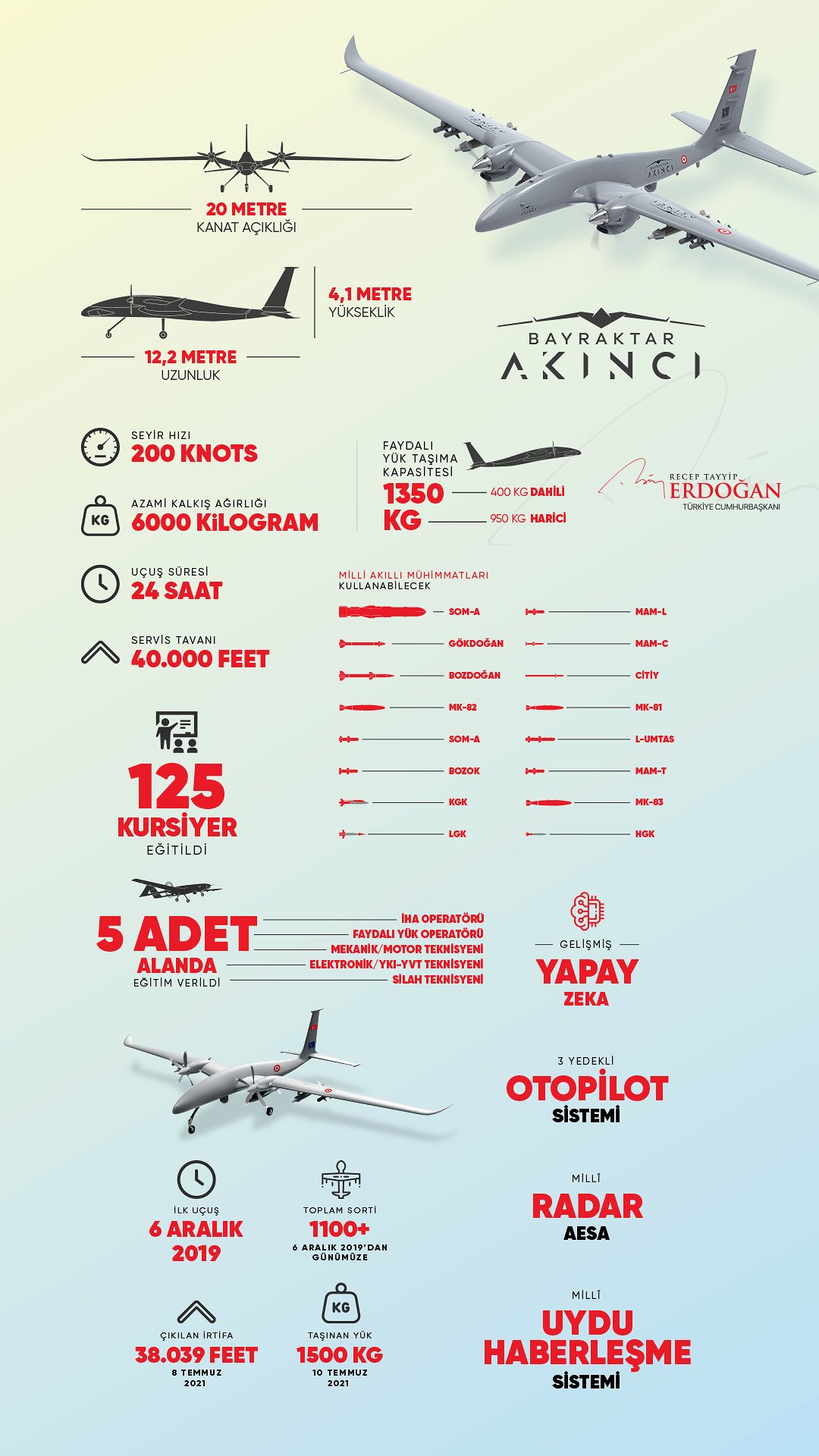 Cumhurbaşkanı Recep Tayyip Erdoğan, Baykar tarafından yerli ve milli imkanlarla geliştirilen ve Türk Silahlı Kuvvetleri envanterine giren Bayraktar AKINCI Taarruzi İnsansız Hava Aracının (TİHA) özelliklerinin yer aldığı grafik paylaştı.