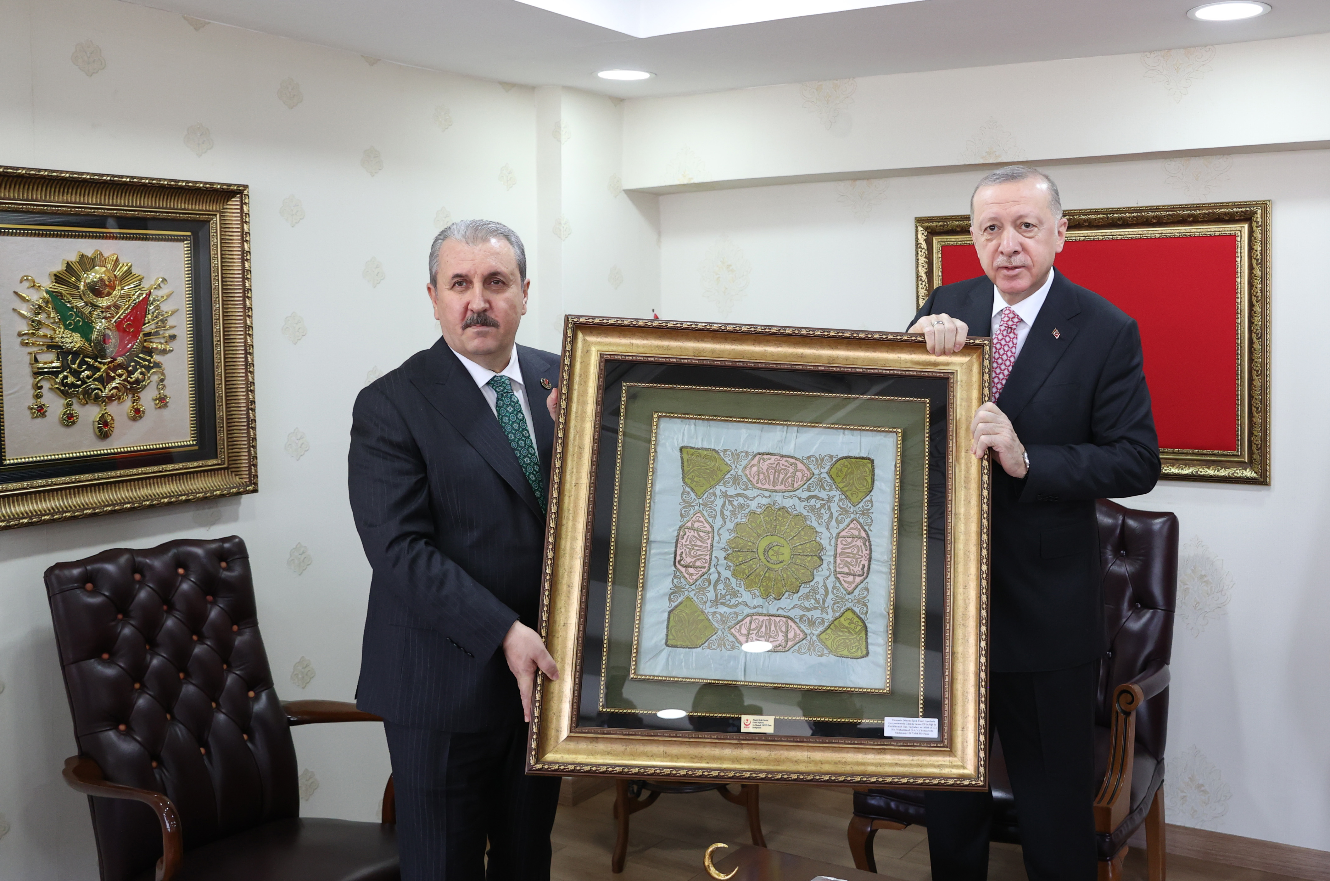 Destici, Cumhurbaşkanı Erdoğan'a ipek üzeri ayetlerle çevrelenmiş gümüş sırma el işçiliği ile yapılan Abdülhamit Han'ın tuğrası ve Allah, Muhammed lafzılarının yer aldığı 150 yıllık tablo hediye etti.