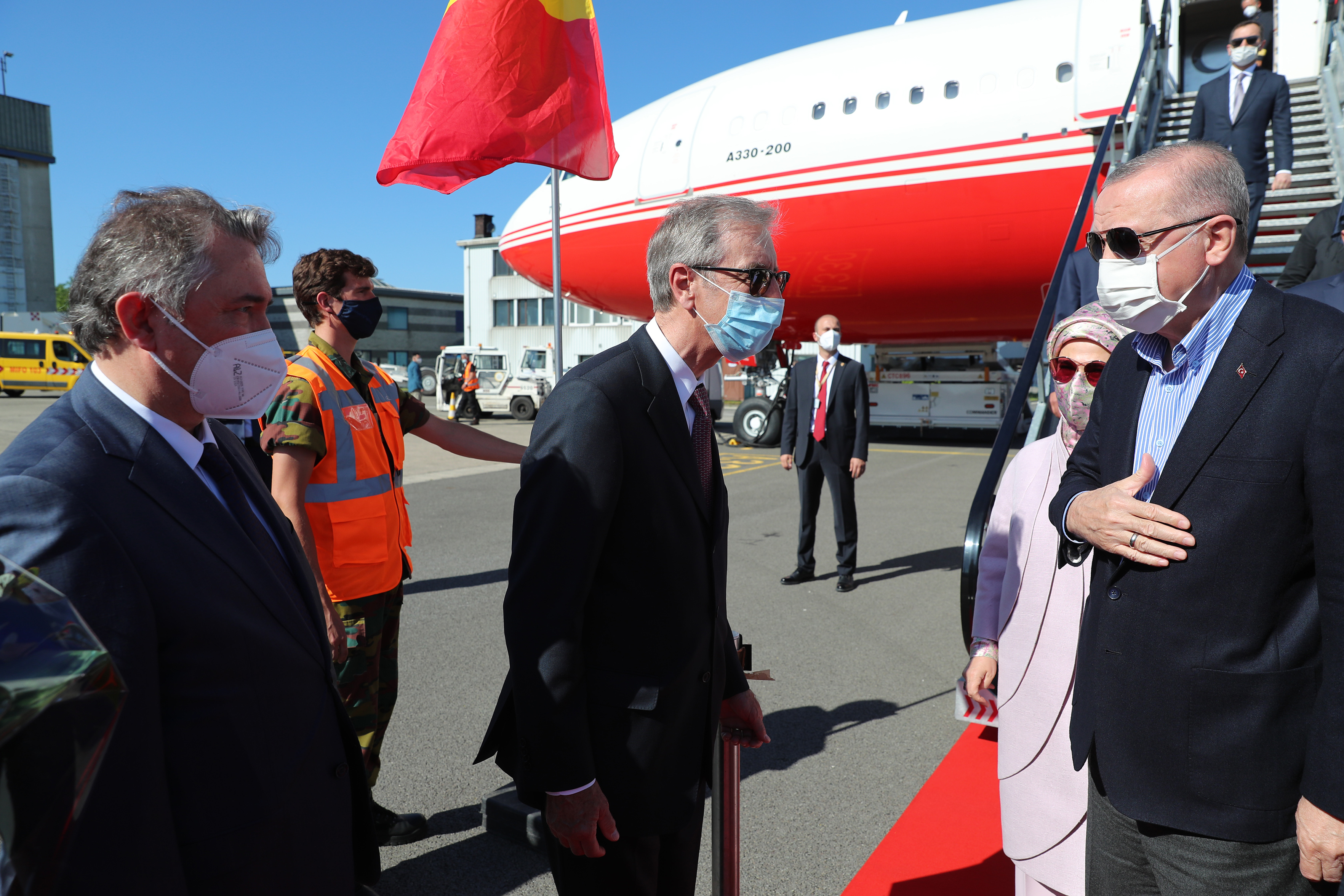 Cumhurbaşkanı Erdoğan'ı Brüksel Melsbroek Havalimanı'nda Türkiye'nin NATO Daimi Temsilcisi Basat Öztürk, Avrupa Birliği Daimi Temsilcisi Mehmet Kemal Bozay, Brüksel Büyükelçisi Hasan Ulusoy, Türk Askeri Temsil Heyeti Başkanı Tümgeneral İsmail Üner, Brüksel Başkonsolosu Umut Deniz ve diğer yetkililer karşıladı.