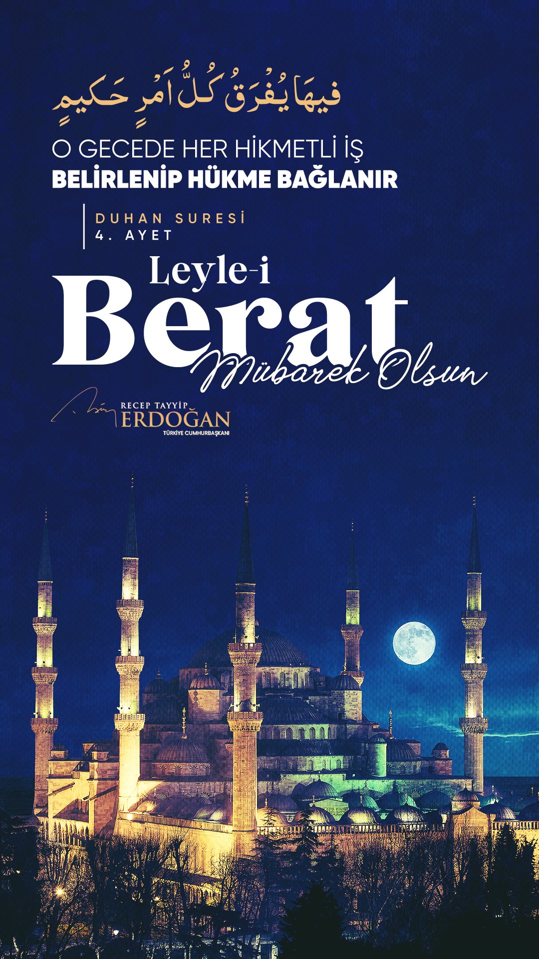 Cumhurbaşkanı Erdoğan, kutlama mesajında, "Milletimizin ve tüm İslam âleminin, bu gece idrak ettiğimiz, Ramazan-ı Şerif'in müjdecisi Leyle-i Berat'ını tebrik ediyorum. Bu mübarek gecenin ülkemize, milletimize ve tüm insanlığa hayırlar getirmesini Allah'tan niyaz ediyorum." ifadelerini kullandı.