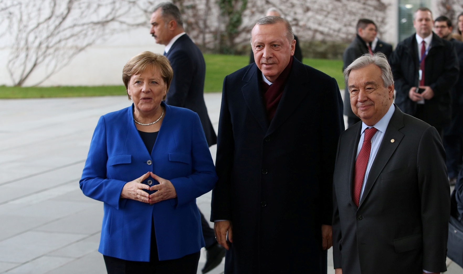 Cumhurbaşkanı Erdoğan’ı Almanya Başbakanlığına gelişinde Almanya Başbakanı Merkel ve Birleşmiş Milletler Genel Sekreteri Antonio Guterres karşıladı.