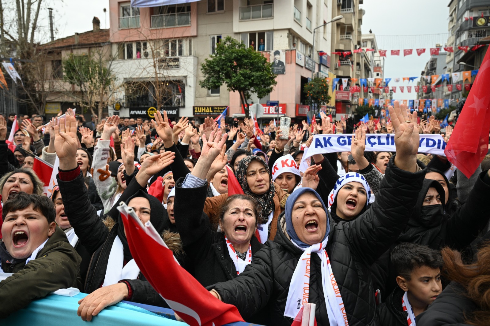 Alana "Bir doğru altı yanlışı götürür", "Bahar gelsin ovamıza incir, nar yiyeceğiz 14 Mayıs'ta Müdüre, 'Bay bay Kemal' diyeceğiz", "Durduracaklarmış durdurtmayız, yıkacaklarmış yıktırtmayız biz AK Kadınlar buradayız" ve "Menderes'i astınız, sesimizi kestiniz, tek Reis'e değil ki milletedir kastınız" ile üzerinde Cumhurbaşkanı Erdoğan ve merhum Başbakan Adnan Menderes'in fotoğrafı üzerine "Yeter söz milletin, yeter söz Türkiye'nin" yazılı pankartlar asıldı.
