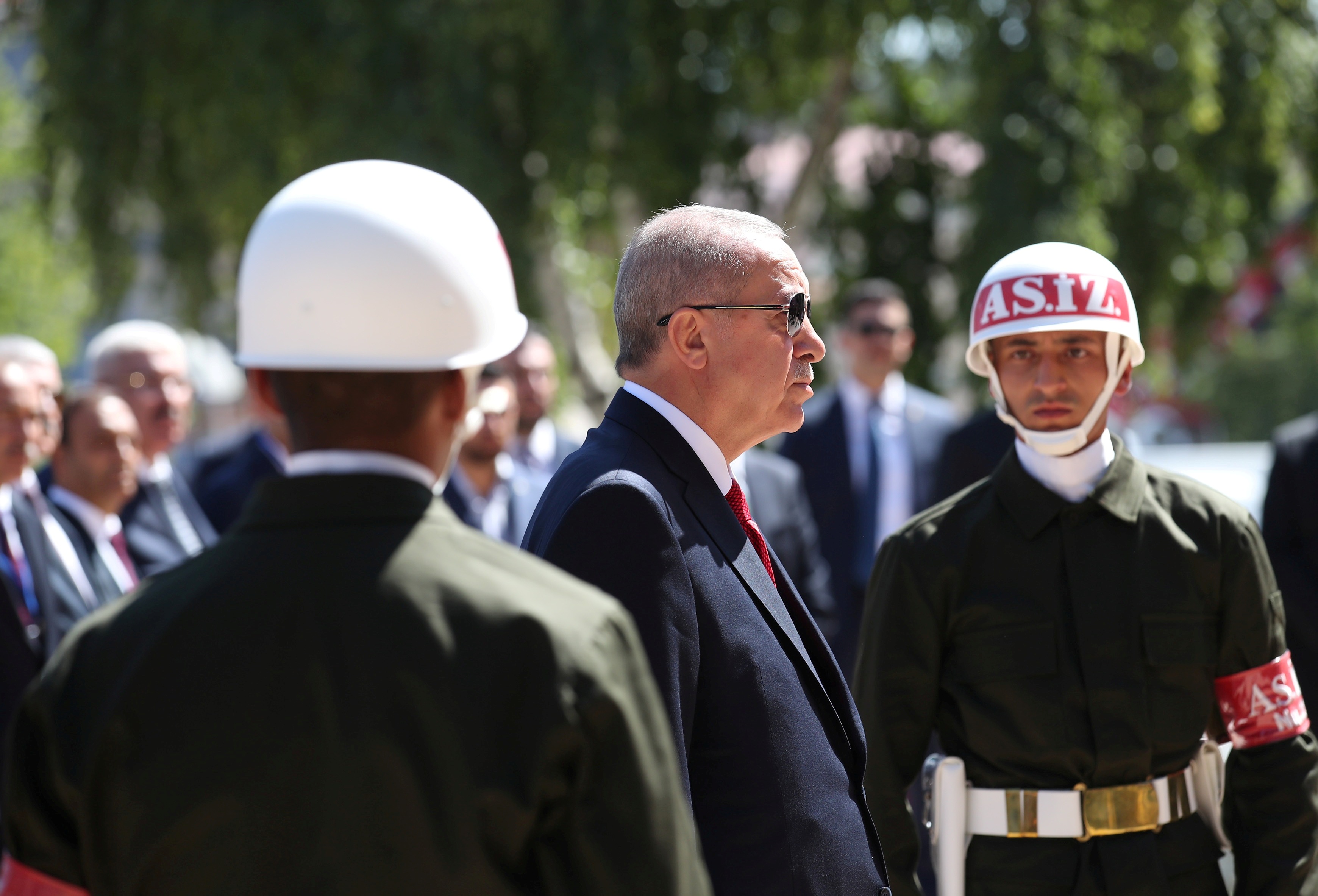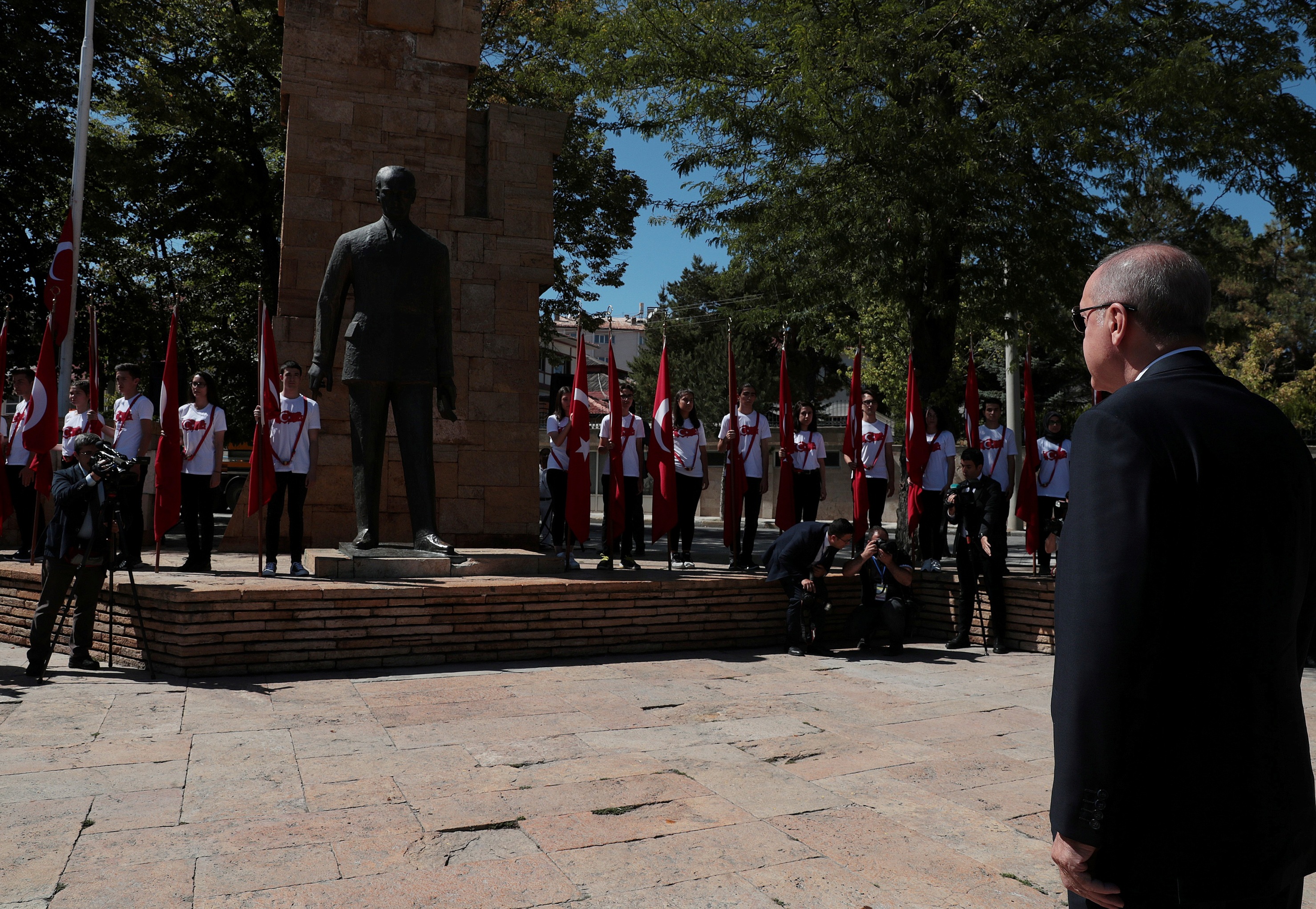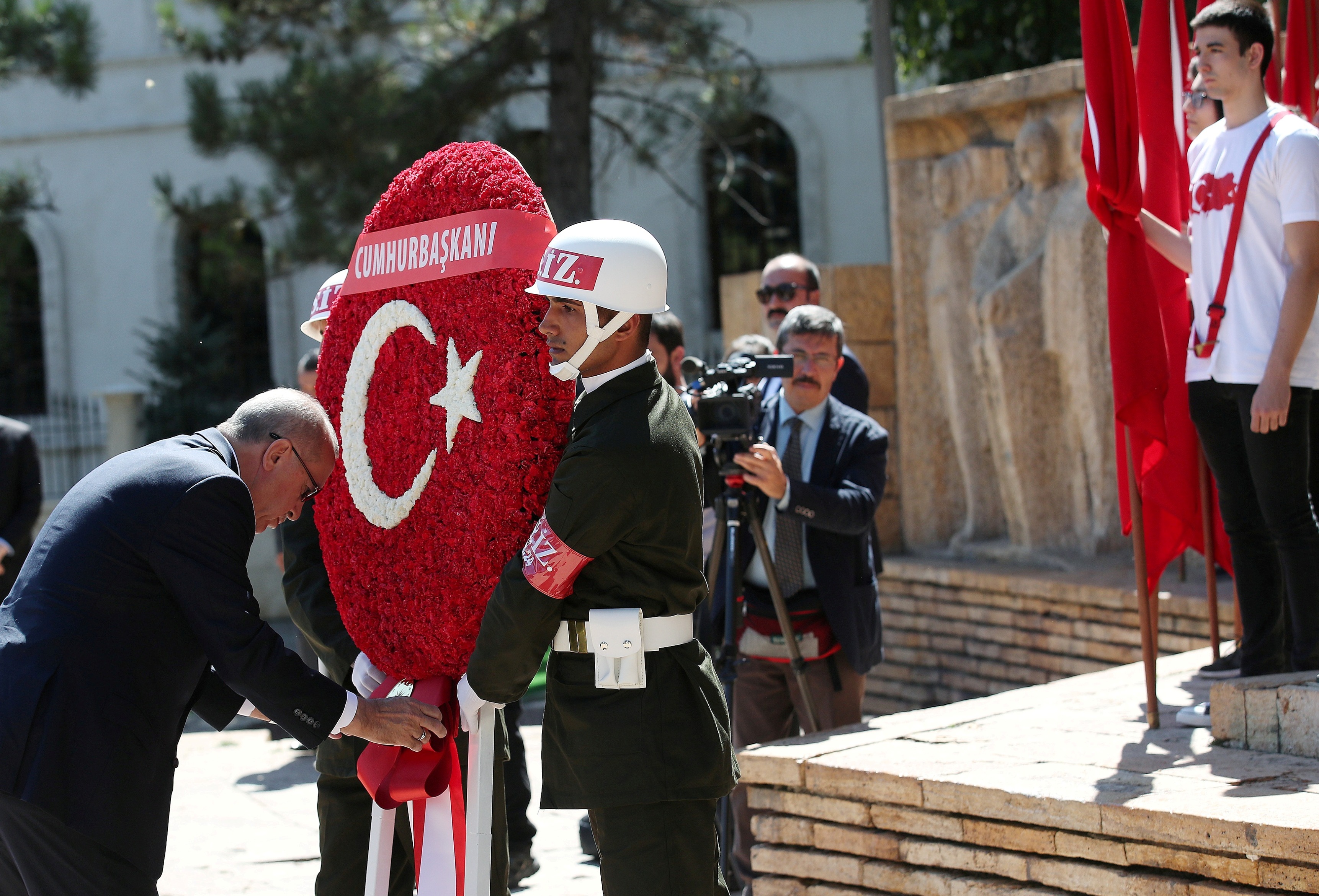 Erdoğan, etkinlikler kapsamında ilk olarak Cumhuriyet Meydanı'ndaki Atatürk Anıtı'na çelenk koydu.
