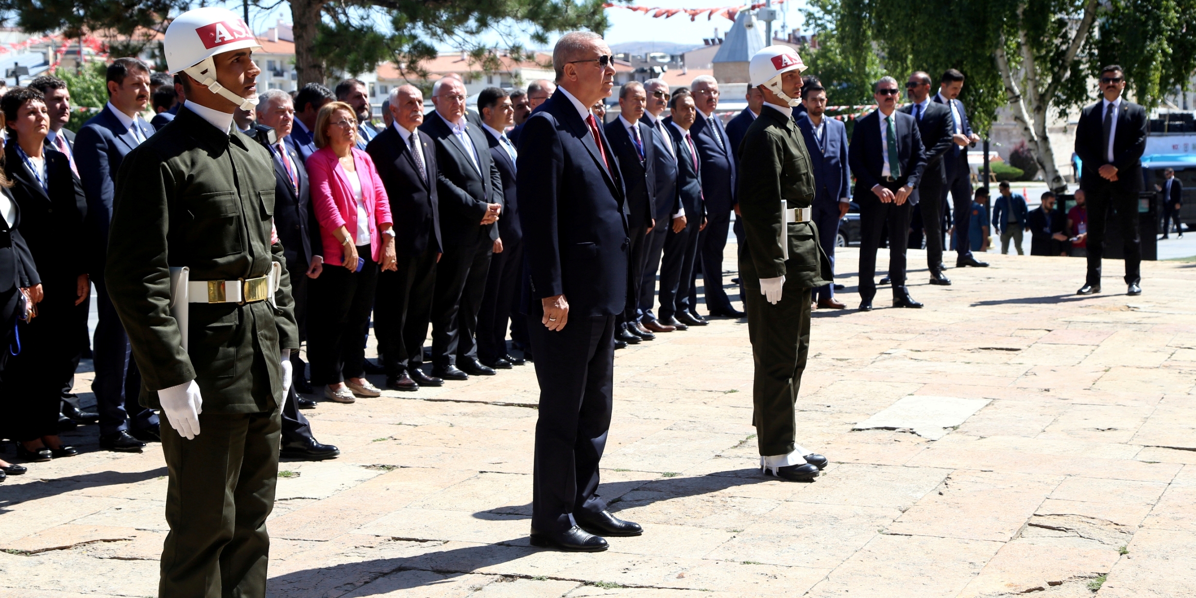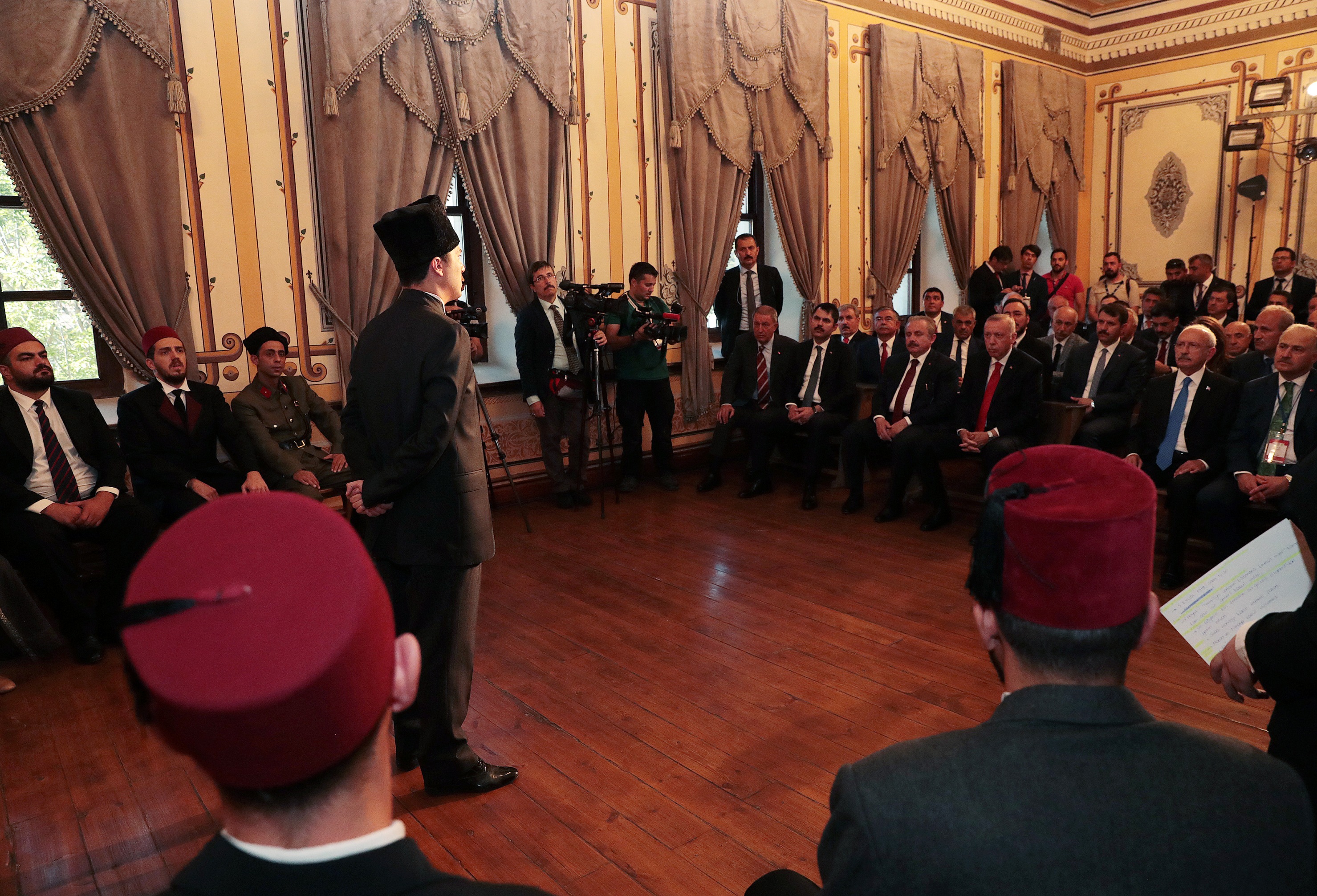 Cumhurbaşkanı Erdoğan ve beraberindekiler daha sonra saygı duruşunda bulunarak İstiklal Marşı'nı okudu. Cumhurbaşkanı Erdoğan, çelenk sunma programının ardından kongrenin yapıldığı Atatürk Kongre Müzesi'ne geçti. Erdoğan, kongrenin yapıldığı tarihi salondaki sıraya oturarak, tiyatro oyuncuları tarafından Sivas Kongresi'nin temsili olarak canlandırılmasını izledi. Oyunun ardından Erdoğan, Mustafa Kemal Atatürk'ü canlandıran Sivas Devlet Tiyatrosu sanatçısı Abdülsamet Sünbül ile diğer oyuncuları kutladı.