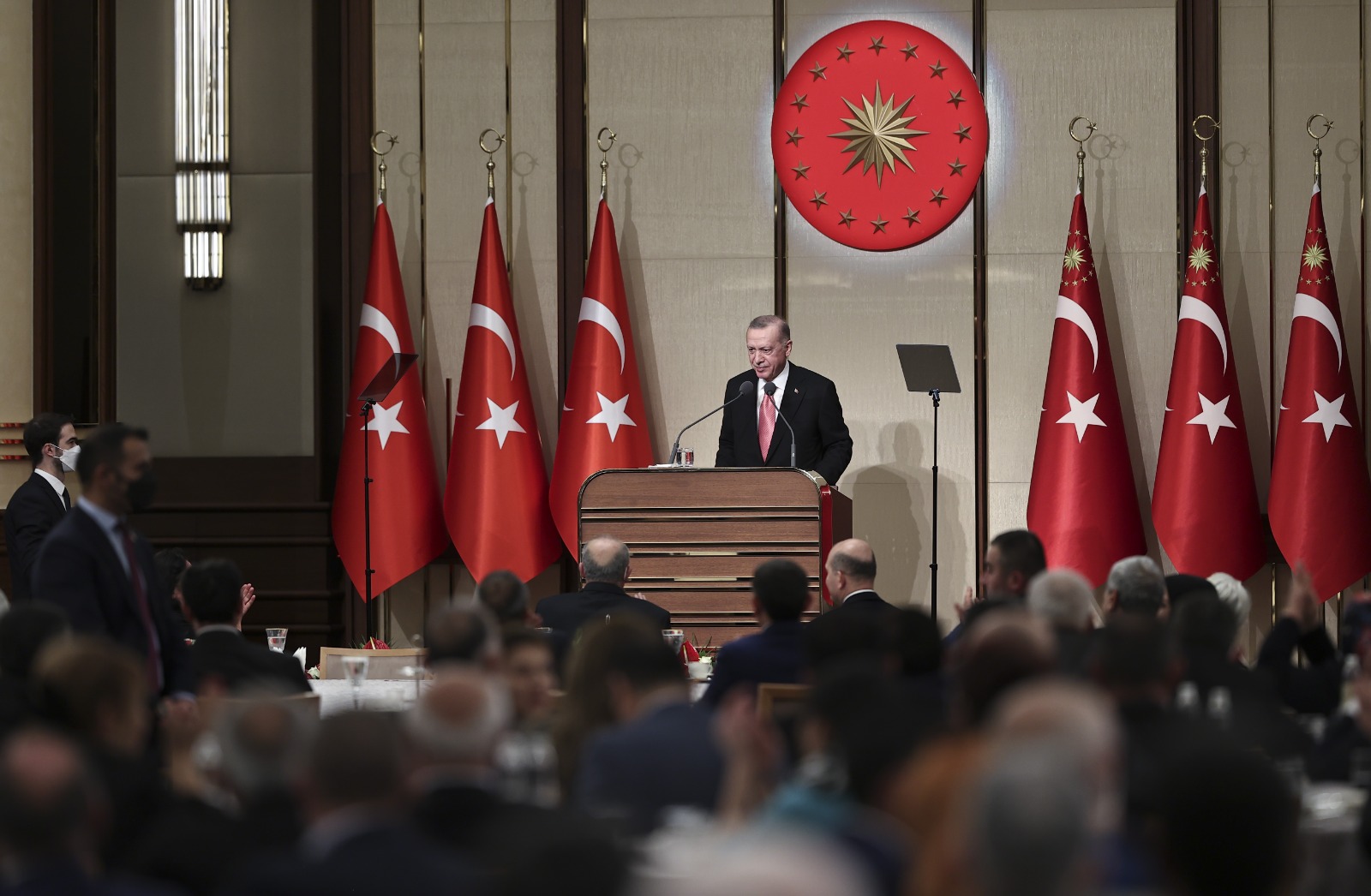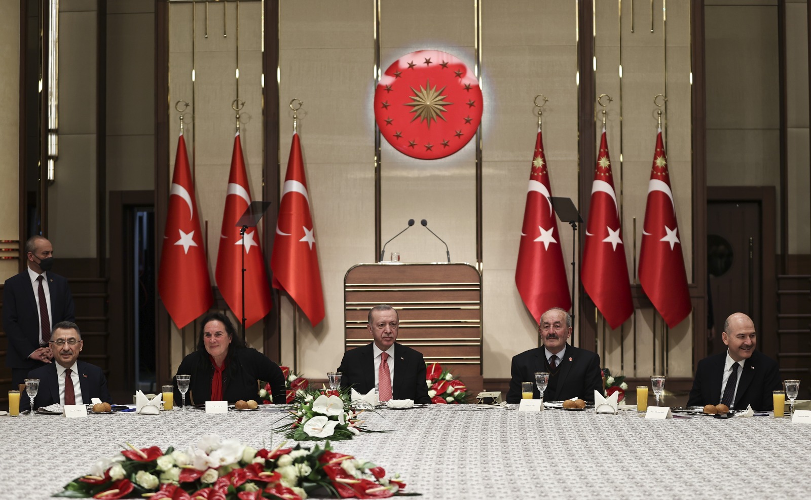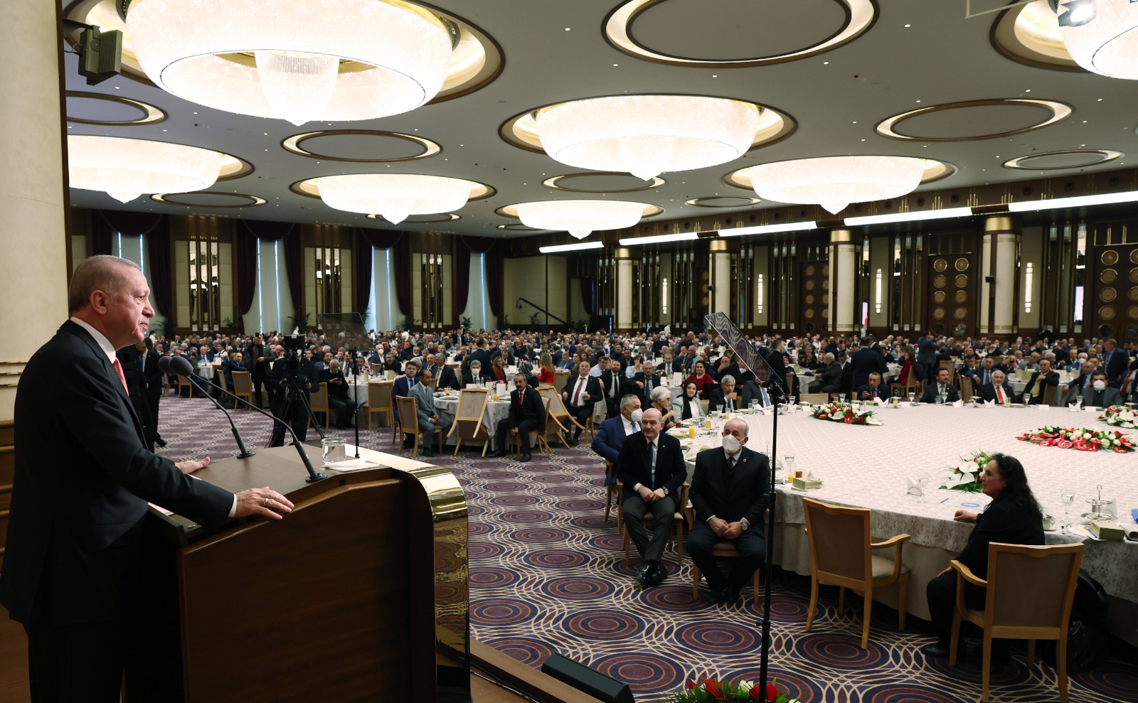 Yaklaşık 2,5 yıllık bir aranın ardından tekrar muhtarlarla birlikte olmaktan ve hasret gidermekten duyduğu bahtiyarlığı ifade eden Cumhurbaşkanı Erdoğan, "Muhtarlarımıza bir teşekkür borcumuz da var, onu da ifade etmeden geçemeyeceğim; birlikte olamadığımız süre boyunca gerek koronavirüs salgınına gerek sel ve yangın felaketlerine karşı verdiğimiz mücadelede muhtarlarımız hep ilk saflarda yer aldılar. Salgın sürecinde valiliklerimiz ve kaymakamlıklarımızla yakın iş birliği hâlinde filyasyon ekiplerinde, Vefa gruplarında, denetim ekiplerinde aktif görev alan tüm muhtarlarımıza şahsım, milletim adına şükranlarımı sunuyorum. Devletin, ülkenin en ücra köşelerine kadar uzanan elleri olan muhtarların ne kadar önemli ve kritik işlevlere sahip olduğunu bu felaketler vesilesiyle herkesin yakından gördüğüne inanıyorum. Bugün bir kez daha tüm kalbimle hissettik ki muhtarlar candır." diye konuştu.