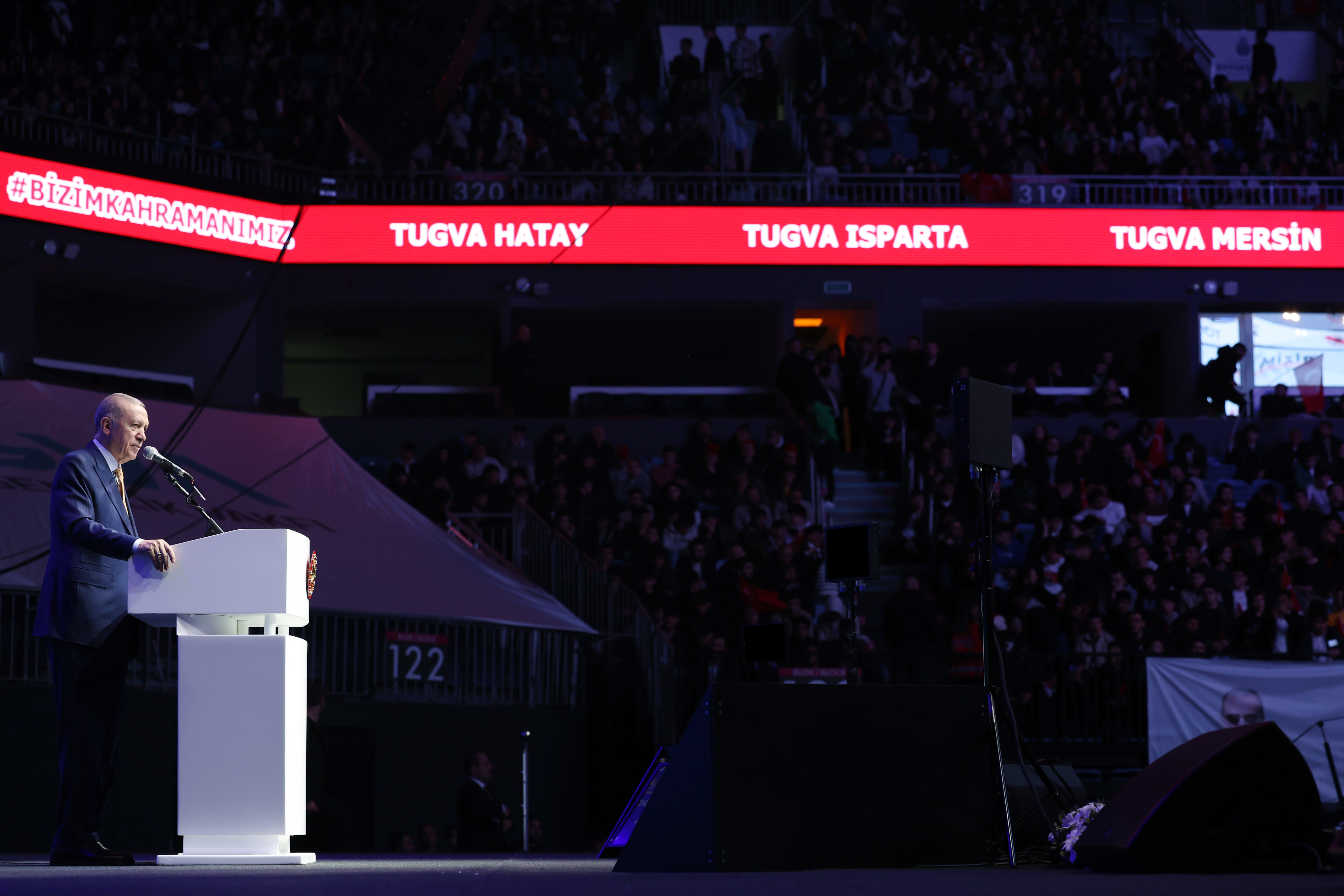"Şimdi bu çelikten iradeyi daha da yükseltme vaktidir. Ne diyor şair? 'Sanmasın kimseler bu aşkı yorgun/Bizim yüreğimiz millete vurgun/Türkiye Yüzyılı gençliği ile Ankalar misali doğarız her gün.' Evet, her gün yeniden doğarak Türkiye Yüzyılı yürüyüşümüzü kesintisiz sürdüreceğiz. Gençlerimizin hem fiziki hem manevi hem ruhi gelişimini en üst seviyede temin ederek Cumhuriyet'imizin ikinci asrına damgamızı vuracağız. Medeniyetimizi ihya ederek bir büyük atılımı beraberce gerçekleştireceğiz."