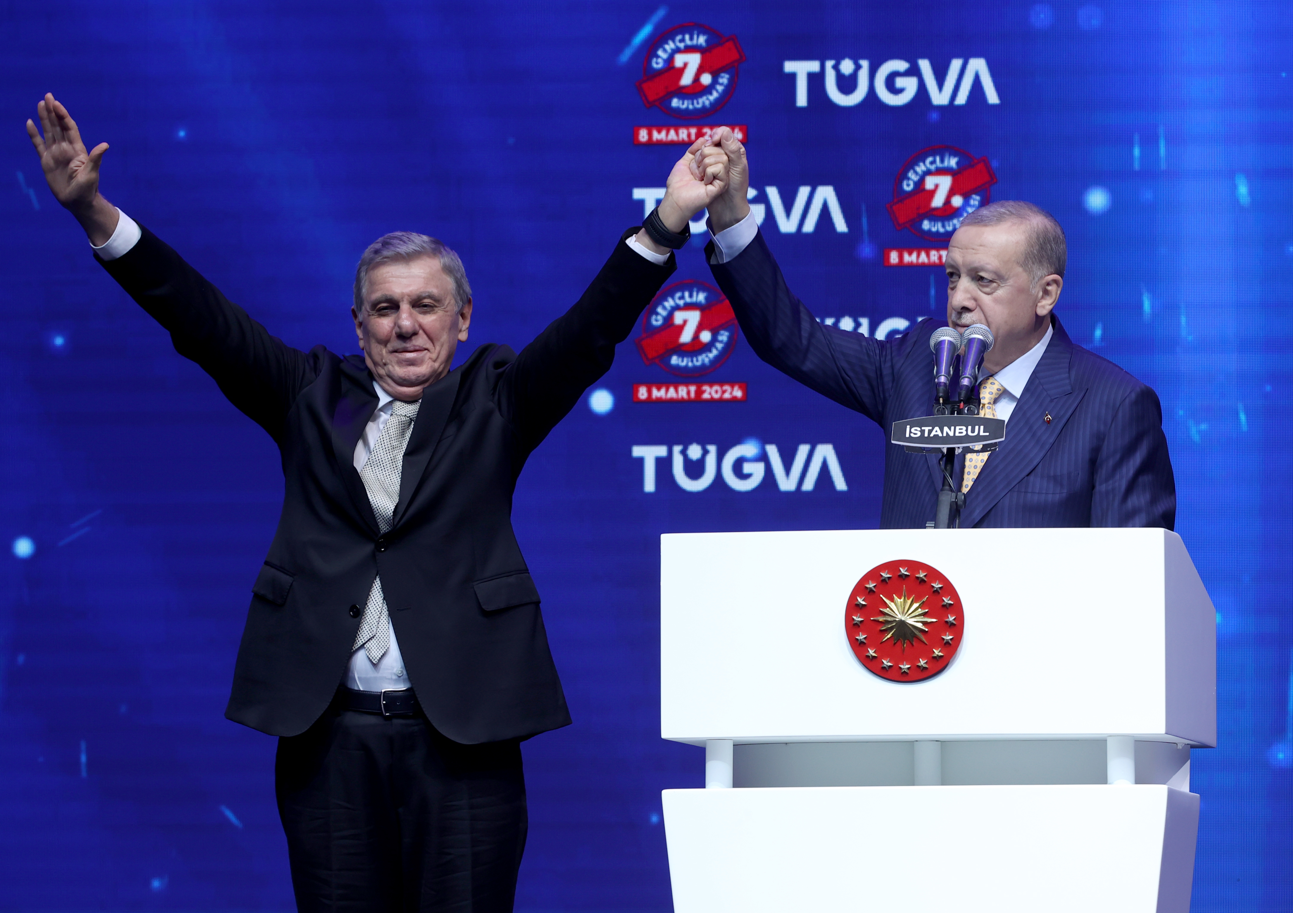 Ardından sahneye gelen Özdemir ile katılımcıları selamlayan Cumhurbaşkanı Erdoğan, "İnşallah hedefimiz, Bakırköy'de de AK Parti olarak bu seçimleri almak." diyerek sözlerini tamamladı.