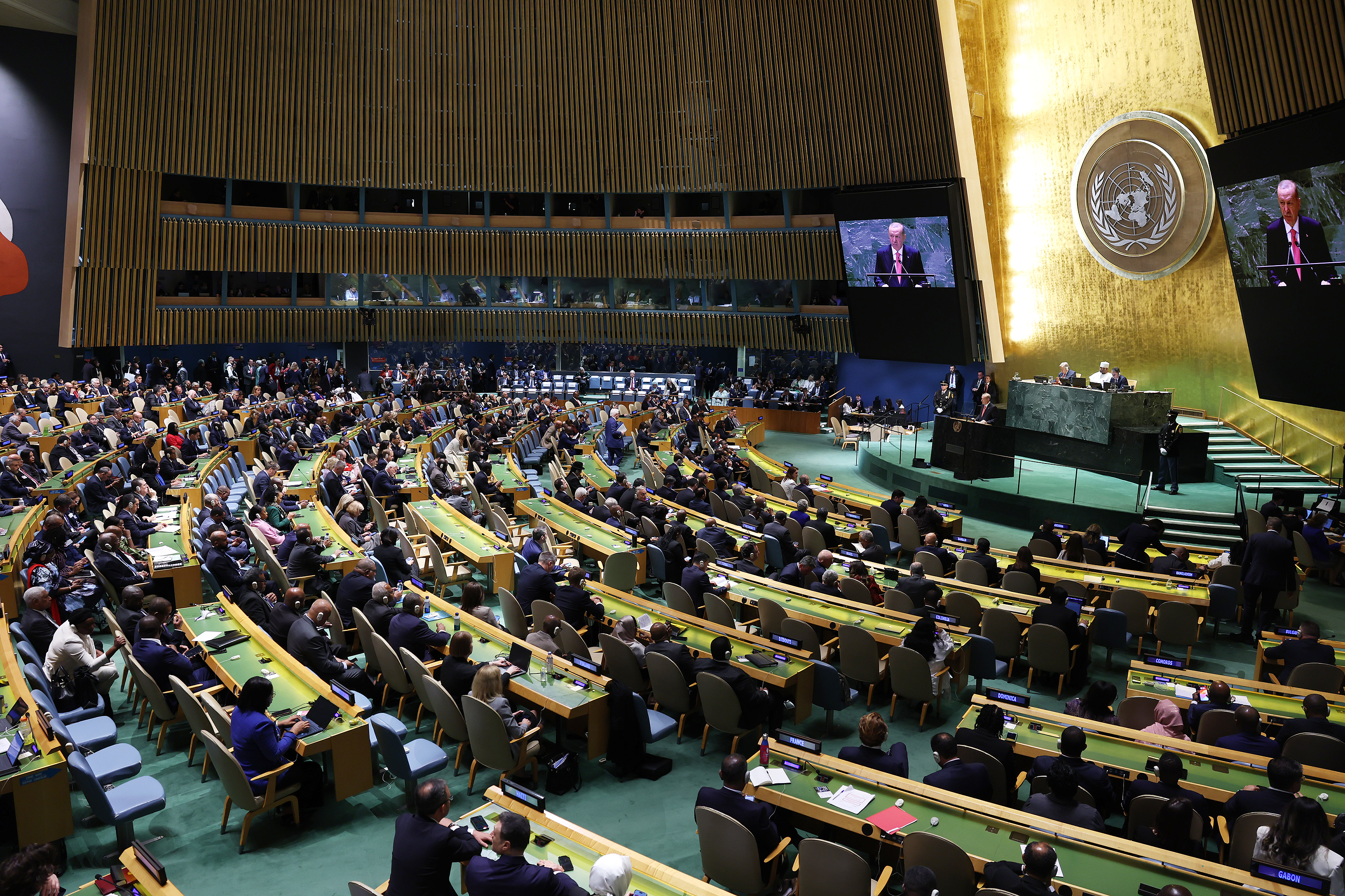Birleşmiş Milletlerin kuruluşuyla birlikte küresel istikrara, huzura ve adalete dair beklentilerin yeniden yeşerdiğini, barış umutlarının yeniden filizlendiğini dile getiren Cumhurbaşkanı Erdoğan, "Ancak üzülerek görüyoruz ki son yıllarda Birleşmiş Milletler kuruluş misyonunu ifa etmekte yetersiz kalıyor. Giderek işlevsiz, hantal ve atıl bir yapıya dönüşüyor. 'Dünya Beşten Büyüktür' şiarının temsil ettiği değerlere, bugünlerde daha çok daha fazla ihtiyaç duyuyoruz." dedi.