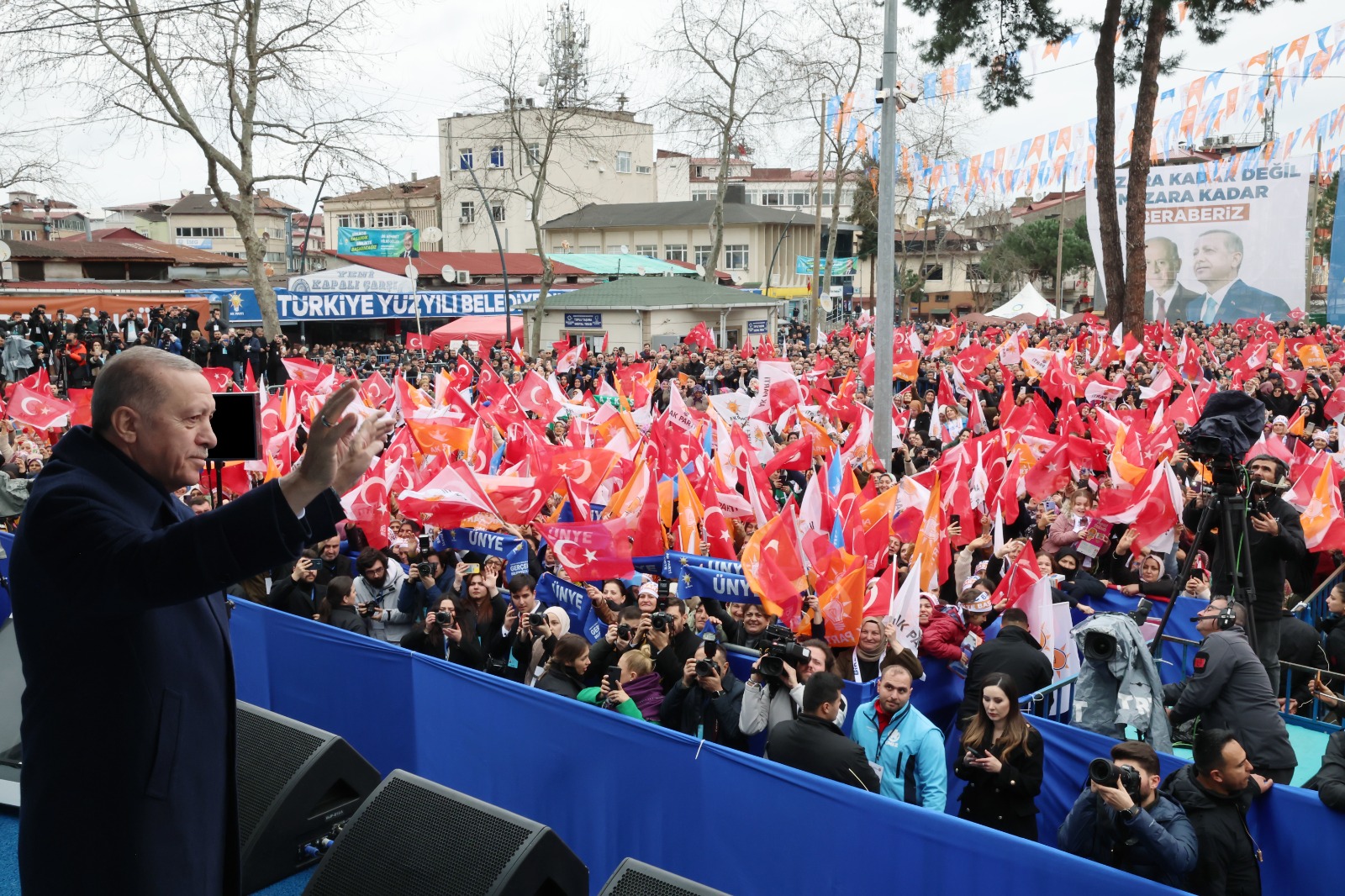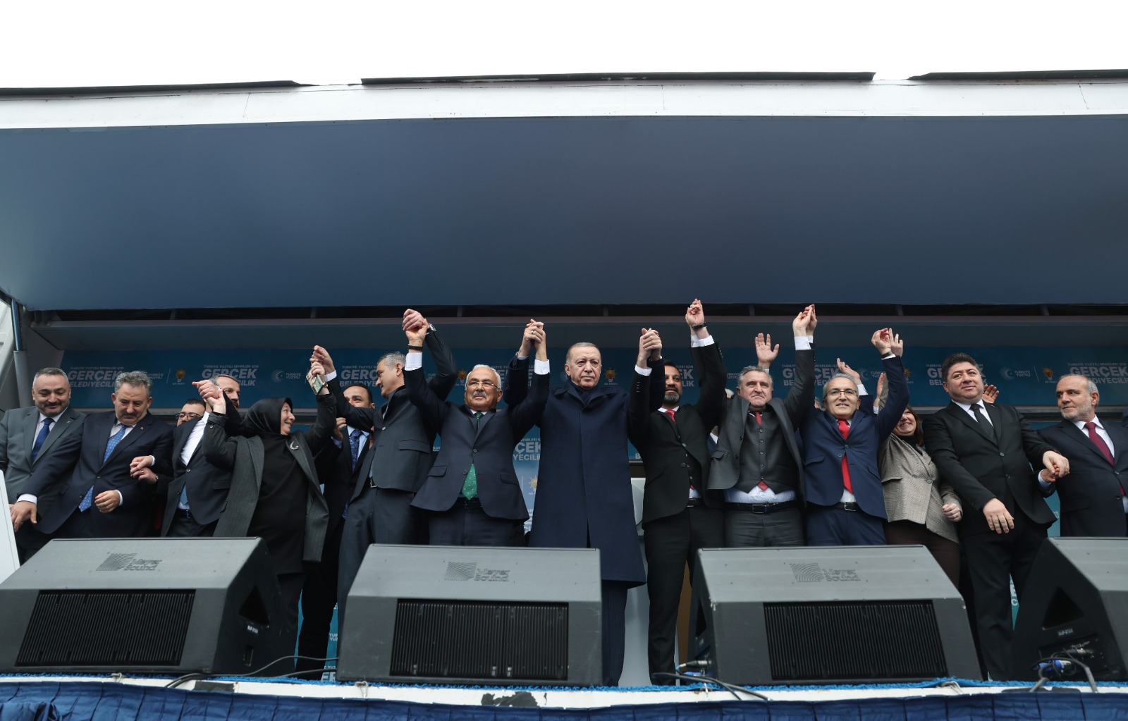 Her fırsatta, siyasetlerinin eser ve hizmet siyaseti olduğunu vurguladıklarını belirten Cumhurbaşkanı Erdoğan, "Bizim ne dünün CHP'si gibi arkamızda tek parti faşizminin utancı var, ne de bugünün CHP'si gibi kendi iç kavgasından başını kaldıramayan yalan üzerine kurulu bir siyasetimiz var. Biz tüm samimiyetimizle ve gücümüzle ülkemizin önünde yeni ufuklar açmanın, şehirlerimizi de bu vizyona ayak uyduracak yönetimlere kavuşturmanın gayreti içindeyiz. Bu anlayışla hasret gidermek ve vatandaşımızın sandıkta desteğini istemek için gittiğimiz hemen her şehirde rakiplerimize meydan okuyoruz." ifadelerini kullandı.