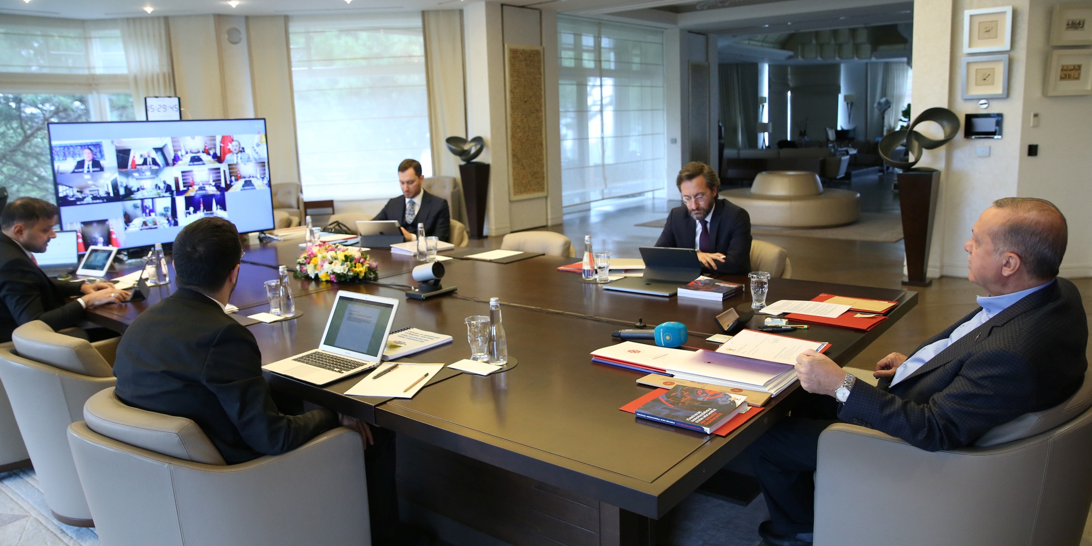 Türkiye'nin dünya genelinde olduğu gibi koronavirüs salgını ile yoğun mücadele içerisinde olduğunu belirten Cumhurbaşkanı Erdoğan, "Temelde bir sağlık sorunu olan bu salgın, ekonomik sonuçları itibarıyla da İkinci Dünya Savaşı'ndan sonraki en büyük kriz haline dönüşmüştür. Özellikle gelişmiş ülkelerin böyle kapsamlı bir kriz karşısında yaşadıkları çaresizlik, gelecekle ilgili tüm öngörülerin yeniden yapılmasını zorunlu kılıyor." ifadelerini kullandı.