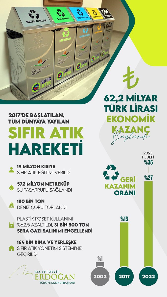 Cumhurbaşkanı Erdoğan, 2017'de başlatılan ve tüm dünyaya yayılan "Sıfır Atık Hareketi"ne ilişkin verileri de paylaştı.