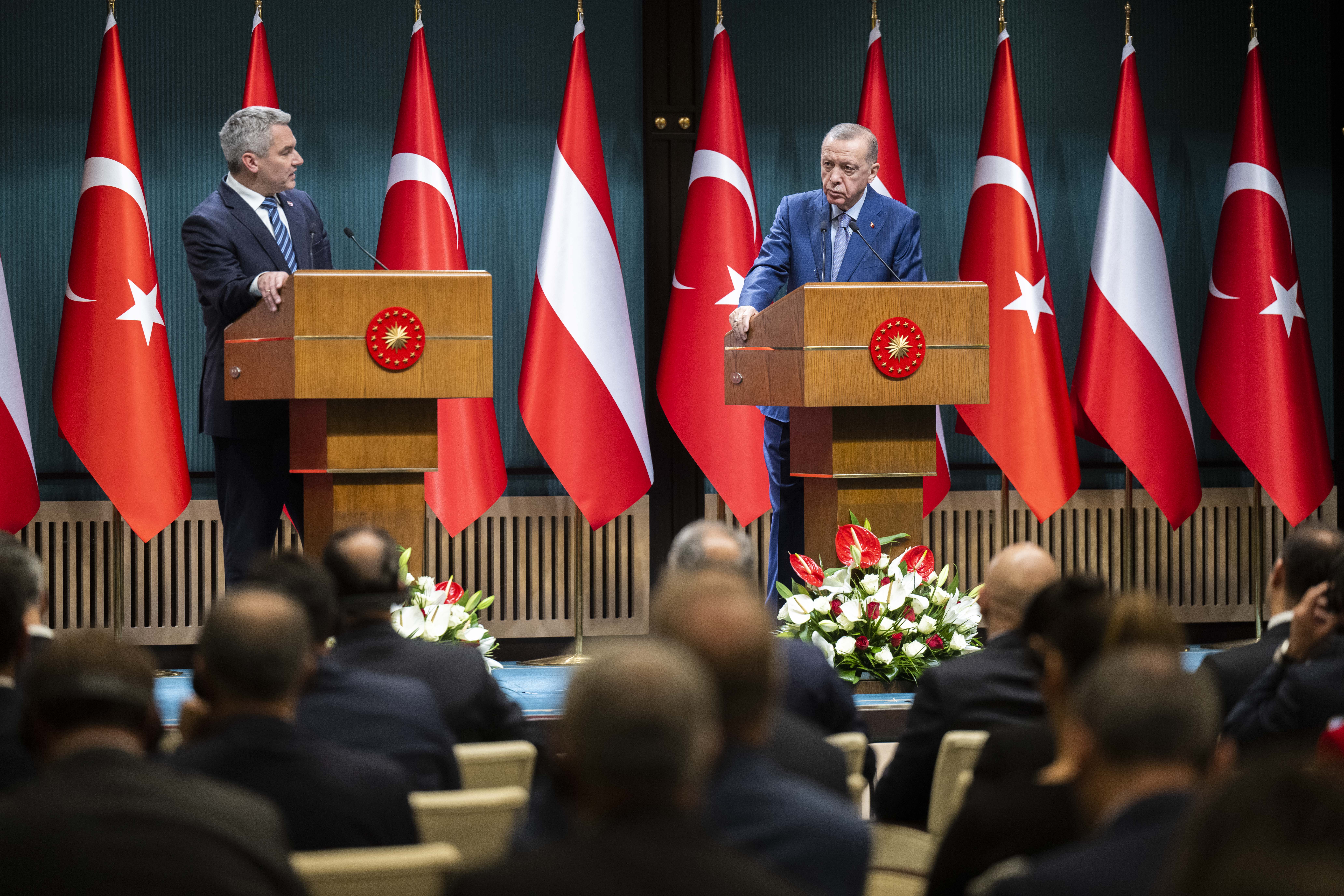 Cumhurbaşkanı Erdoğan ile Türkiye'ye resmi ziyarette bulunan Avusturya Başbakanı Karl Nehammer'in, Cumhurbaşkanlığı Külliyesi'ndeki baş başa görüşmesinin ve iki ülke heyetlerinin de bir araya gelmesinin ardından iki lider ortak basın toplantısı düzenledi.