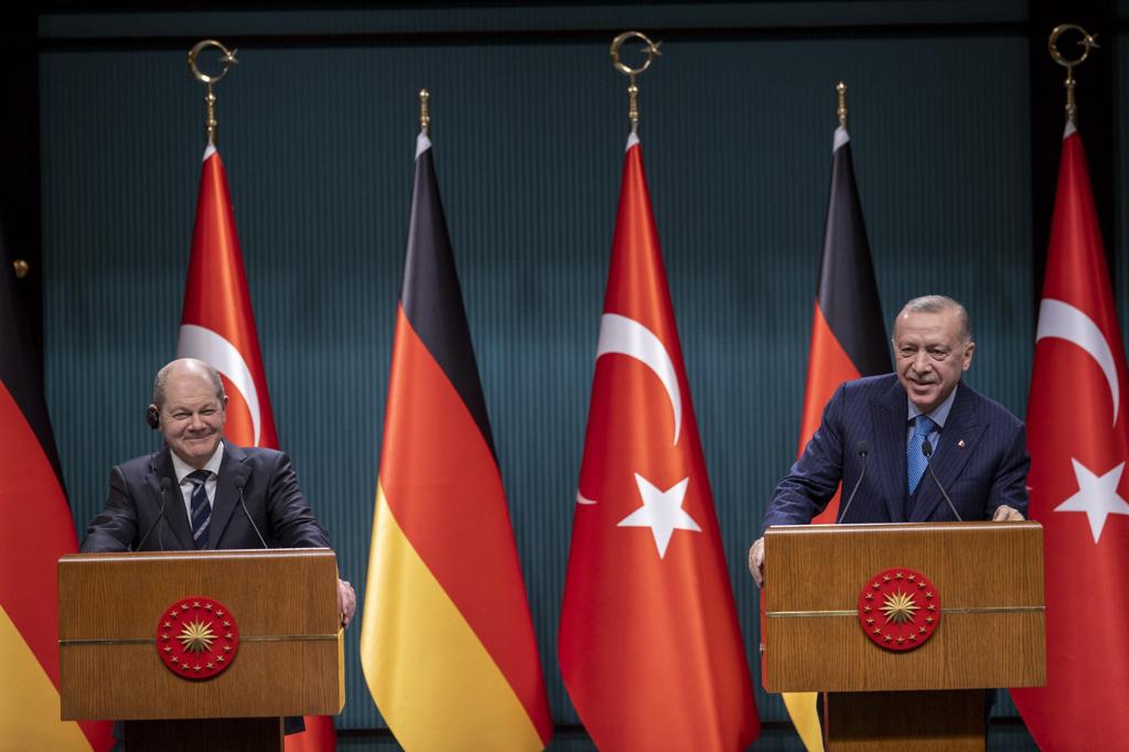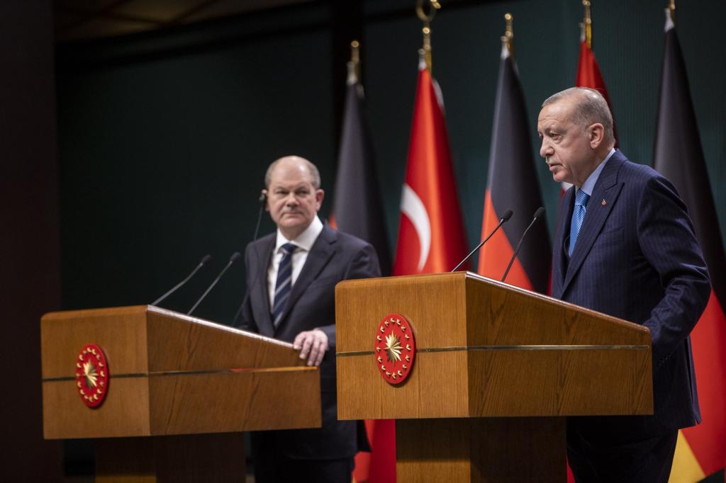 Dost ve müttefik Almanya Federal Cumhuriyeti'nin Şansölyesi Scholz'ün Türkiye'ye ilk resmî ziyaretini gerçekleştirdiğini belirten Cumhurbaşkanı Erdoğan, son derece dinamik ve güçlü olan Türk-Alman ilişkilerinin boyutları ve yoğunluğunun emsalsiz olduğunu vurguladı. Cumhurbaşkanı Erdoğan, Scholz ile yakın diyalog ve iş birliğini sürdürmekte kararlı olduklarının altını çizdi.