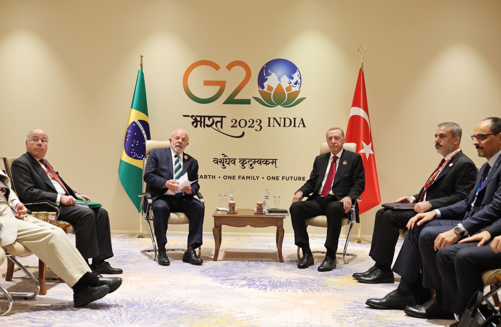 Cumhurbaşkanı Erdoğan, Bharat Mandapam Uluslararası Fuar ve Kongre Merkezi'nde "Tek Dünya" temasıyla gerçekleştirilen oturumun ardından Brezilya Devlet Başkanı Luiz Inacio Lula da Silva ile görüştü.