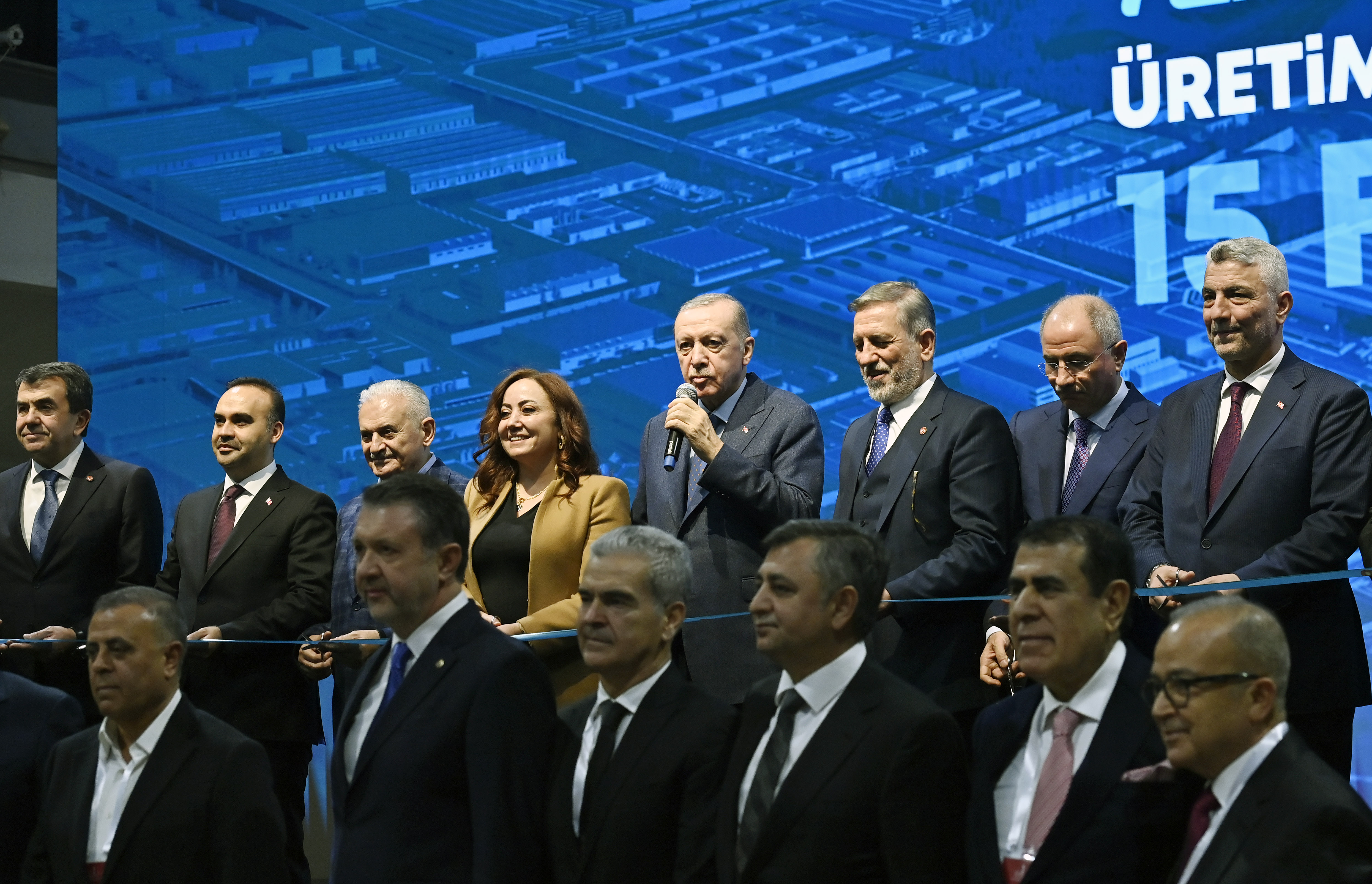 Cumhurbaşkanı Erdoğan, Osmanlı'nın sembolü çınar ağacının kendisine hediye olarak takdim edilmesinin ardından beraberindekilerle TEKNOSAB'da üretime başlayan 15 yeni firma için kurdele kesti.