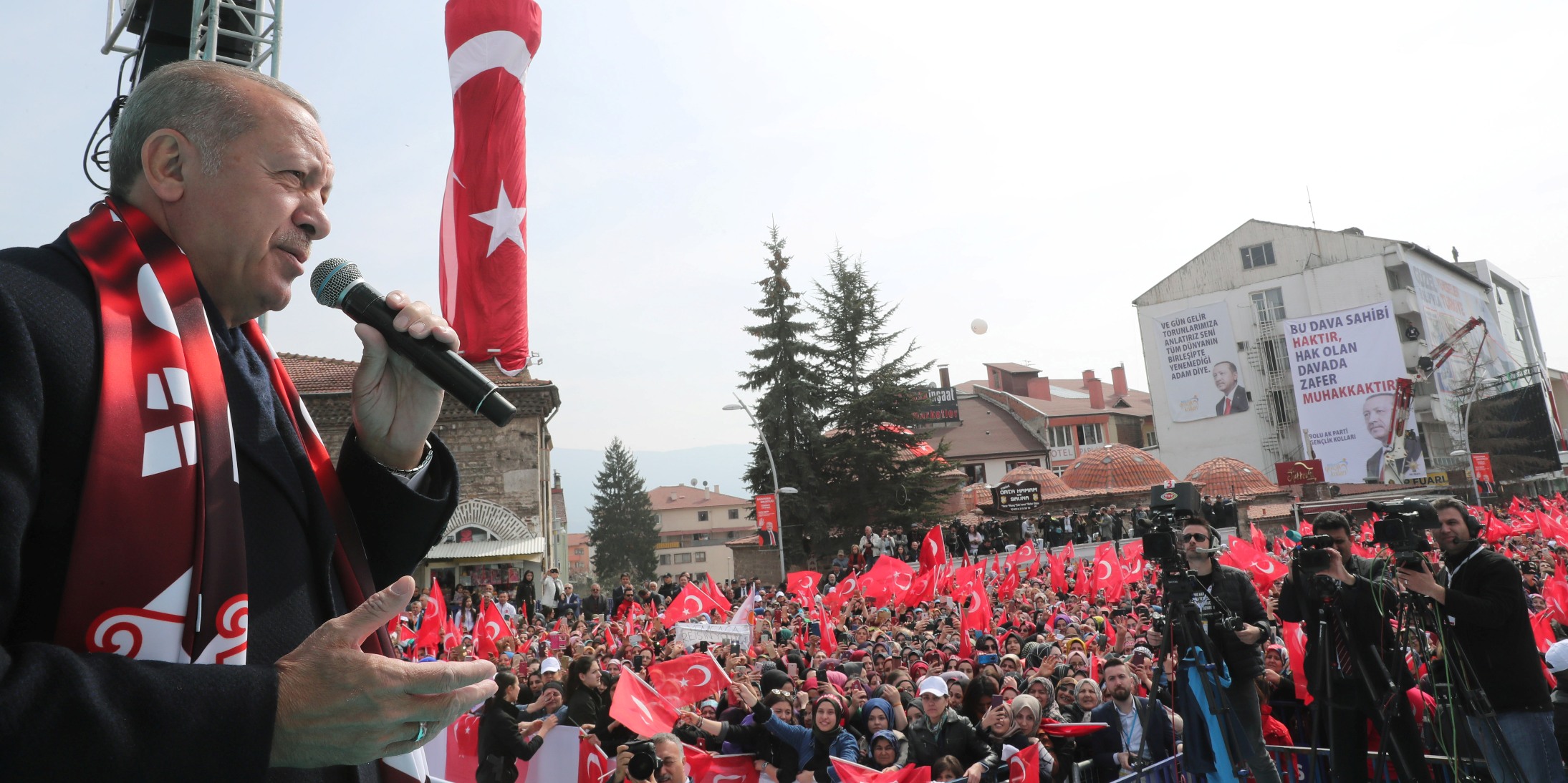"Bolulu kardeşlerimizle kavlimizi yenilemek istiyoruz ama öyle bir cevap verin ki sesi Pensilvanya'dan, Kandil'den, Suriye'nin kuzeyinden ve Avrupa Parlamentosundan duyulsun. Öyle bir gürleyin ki Gazze'deki, Filistin'de, Yemen'deki, Yeni Zelanda'daki kardeşlerimizin yaralı gönüllerine şifa olsun." diyen Erdoğan, mitinge katılanlara yönelttiği, "Bolu, 31 Mart'ta sandığa sahip çıkıyor musun? Bolu, 31 Mart'ta demokrasiye sahip çıkıyor muyuz? Bolu, 31 Mart'ta gönül belediyeciliğine 'Evet' diyor muyuz? Bolu, 31 Mart'ta mührü 'AK Parti'ye vuruyor muyuz? sorularına, "Evet" yanıtını aldı.
