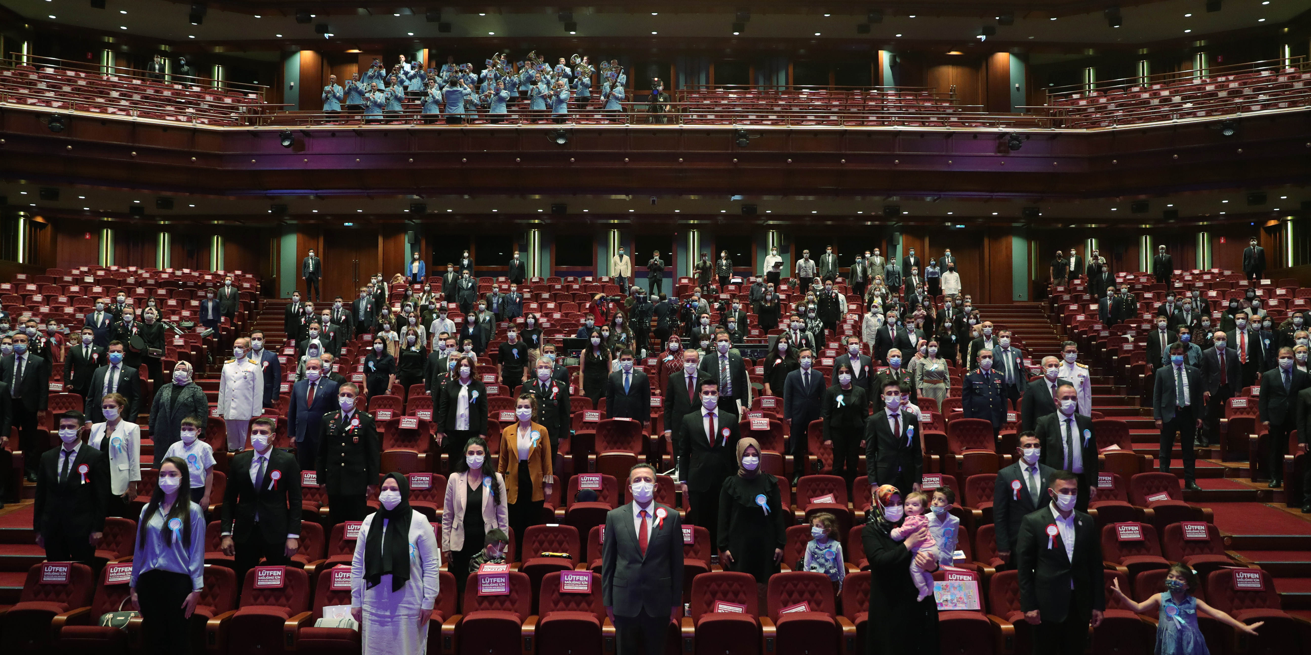 Ülkeleri için gözlerini kırpmadan ölüme yürüyen şehitlerin yakınları ile gazilere devlet övünç madalyası ve beratı takdim etmek üzere bir araya gelindiğini anımsatan Erdoğan, burada sadece Ankara'daki 77 şehit yakını ve gaziye ödül verileceğini, diğer şehirlerde ikamet eden şehit yakını ve gazilere de kendisi adına takdim edileceğini söyledi.