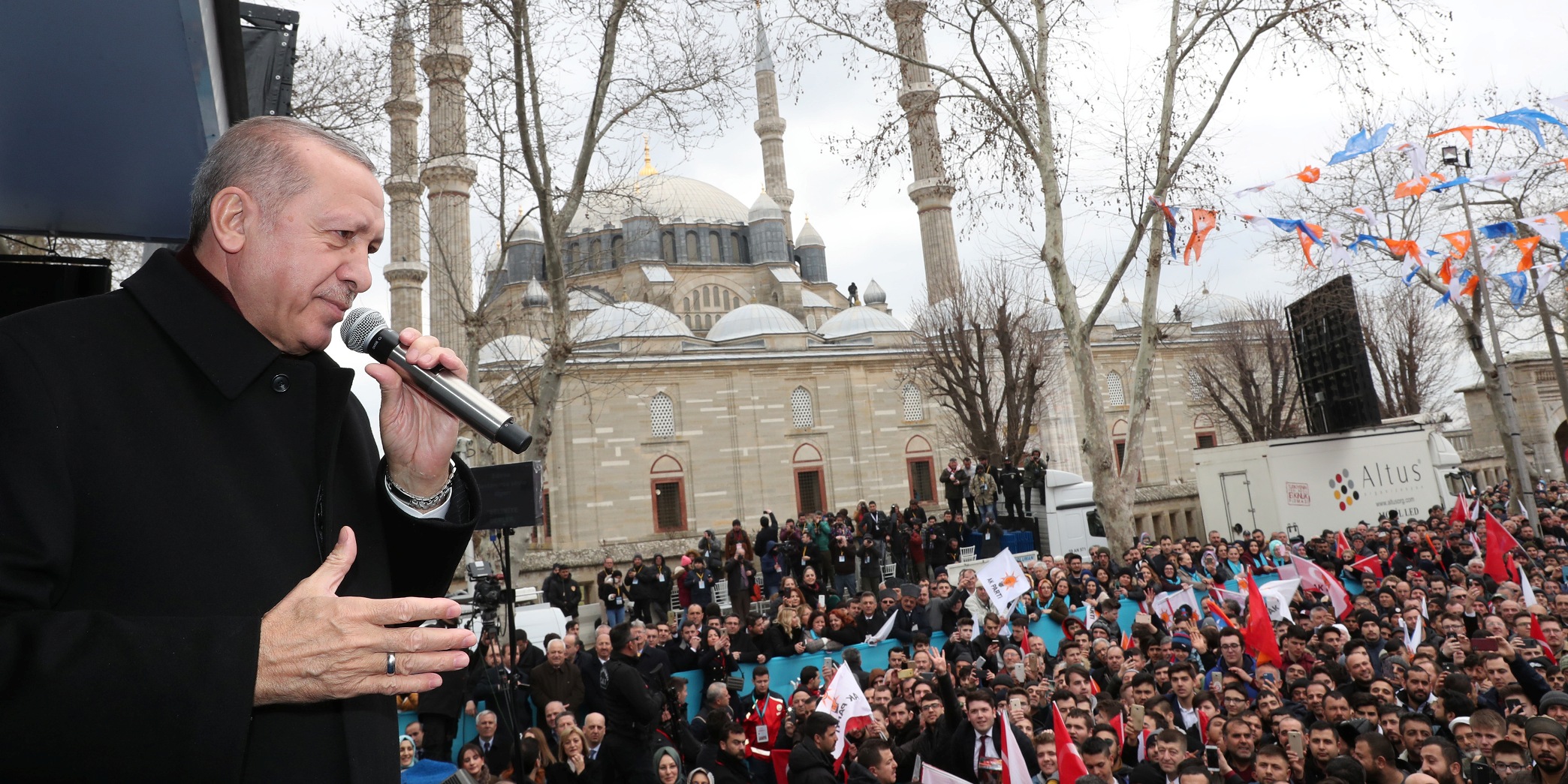 "Edirne'den tüm Trakya'ya, tüm Ege'ye, tüm Türkiye'ye sesleniyorum: Bu ülke tüm renkleriyle, tüm zenginlikleriyle, tüm farklılıklarıyla 82 milyon vatandaşımızın ortak vatanıdır. Bu ülkede herkes, diğerlerinin hakkına, hukukuna saygılı olmak şartıyla dilediği gibi inanabilir, dilediği gibi yaşayabilir, dilediği gibi iş yapabilir, dilediği gibi düşüncelerini ifade edebilir. Altını çizerek ifade ediyorum, diğerlerinin hakkına, hukukuna, devlet bütünlüğüne milletin birlik beraberliğine saygılı olma dışında hiçbir sınırlama, hiçbir tehdit yoktur. Varsa aksi yönde bir muameleye maruz kalan Cumhurbaşkanı olarak bizzat yanında ben varım. Türkiye'yi artık bu yaşam tarzı, laiklik istismarından kurtarmanın vakti gelmiştir. İnşallah 31 Mart seçimleri, belediye hizmetleriyle birlikte bu bakımdan da tarihi bir değişime, dönüşüme hizmet edecektir."