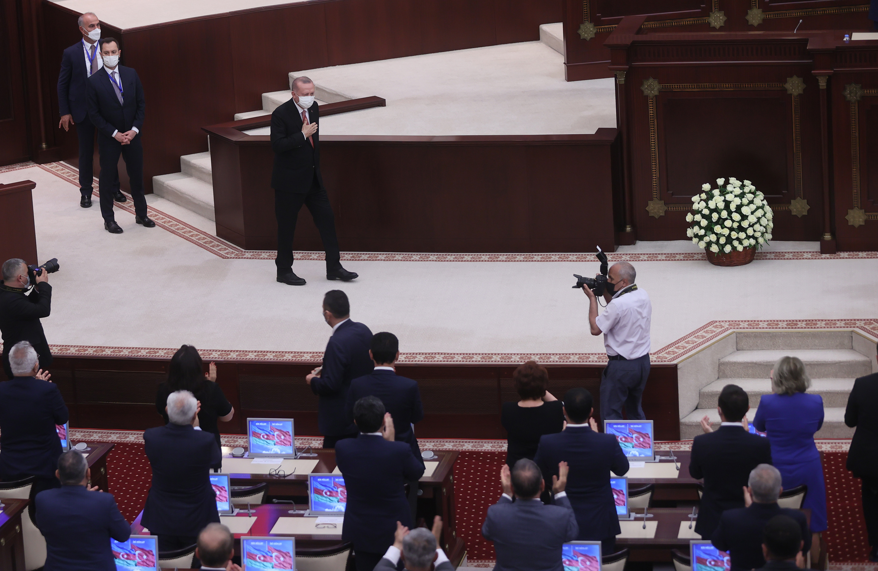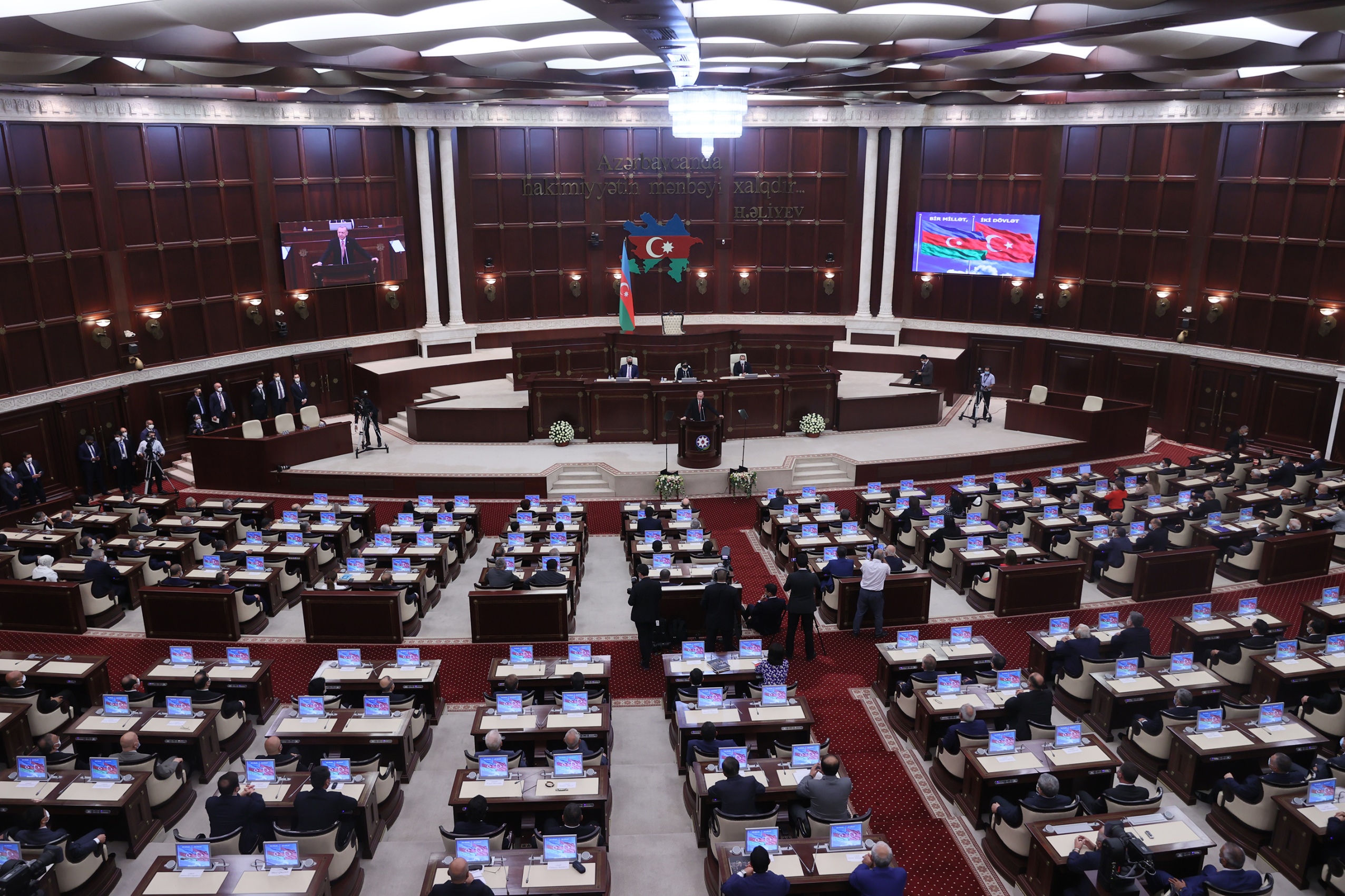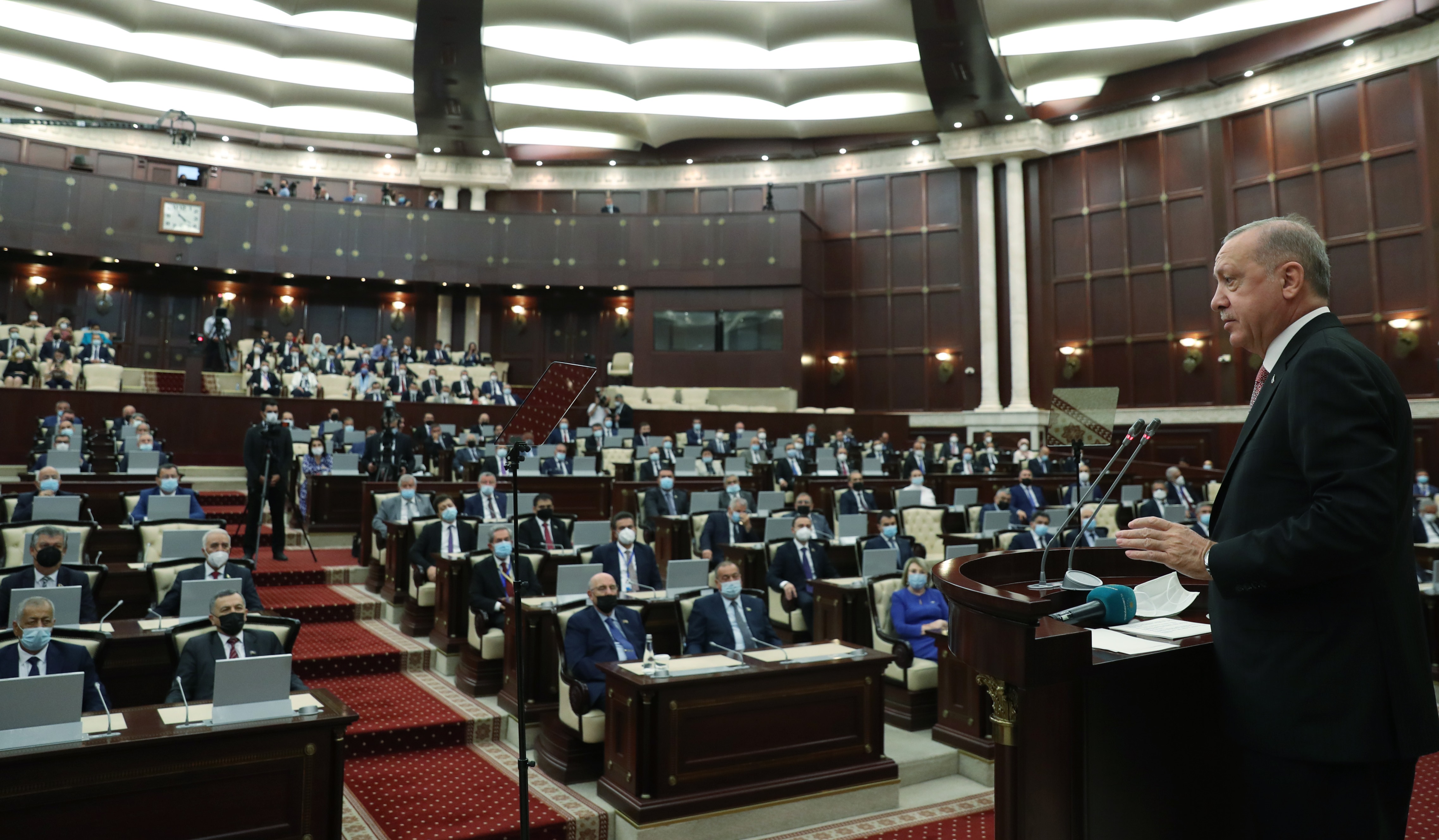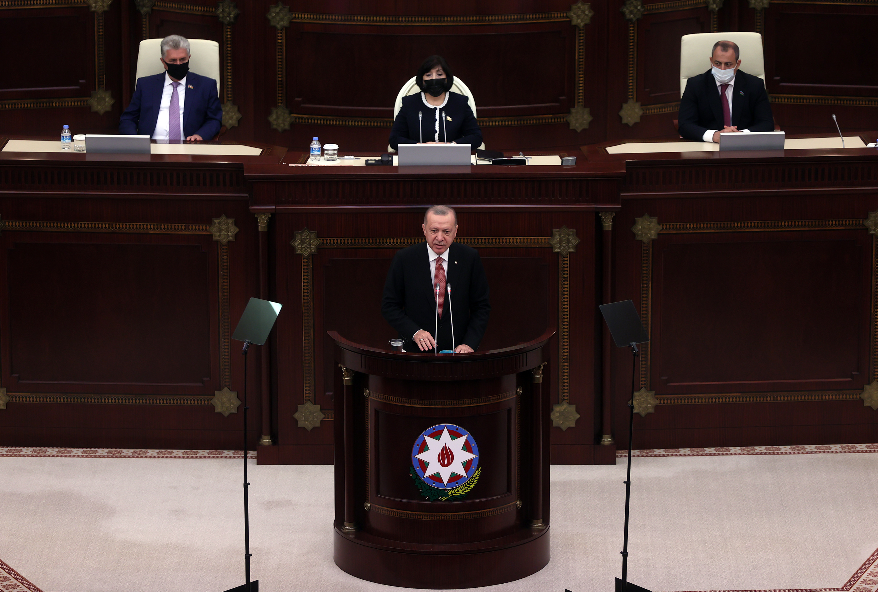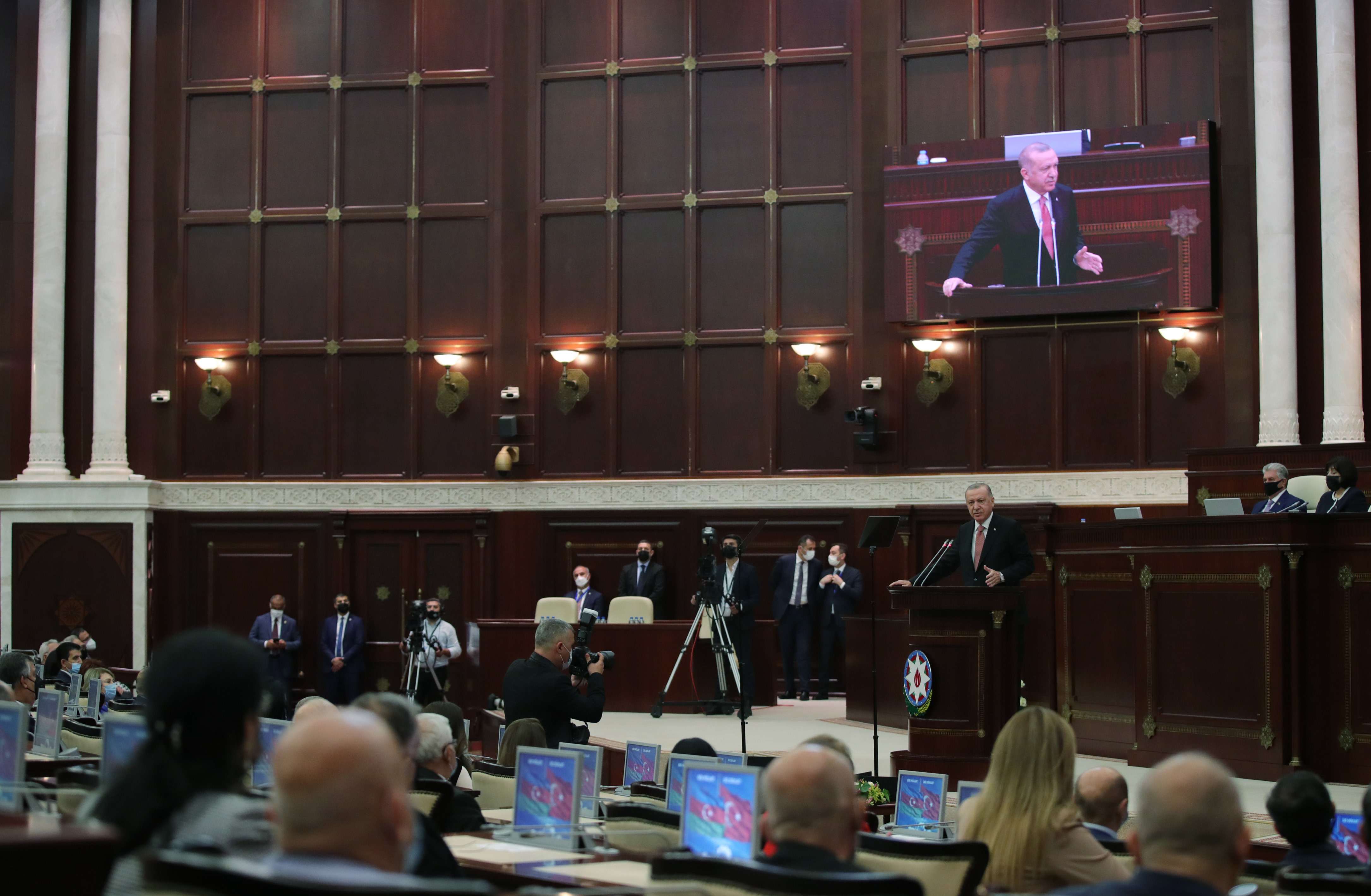 Cumhurbaşkanı Erdoğan, Azerbaycan Millî Meclisi'nde yaptığı konuşmasına, muzaffer Azerbaycan Milli Meclisi'nin üyelerini, 84 milyon Türk vatandaşı adına selamlayarak başladı.