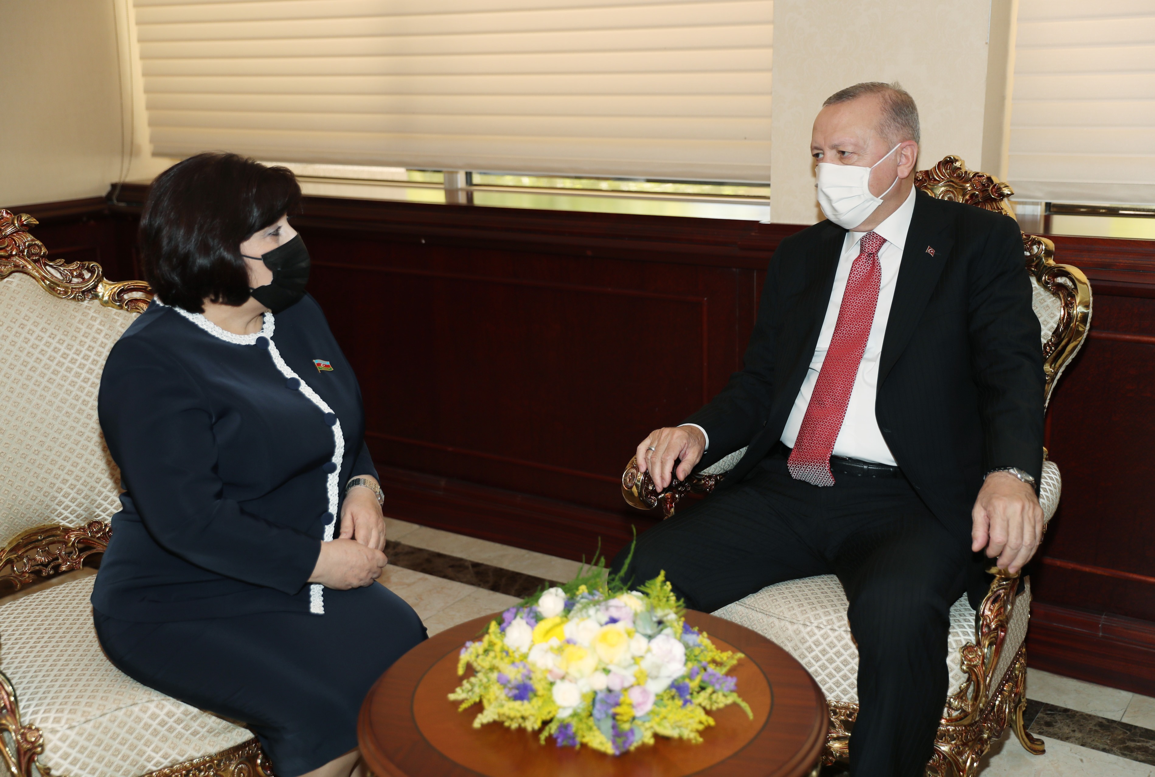 Cumhurbaşkanı Erdoğan, Azerbaycan Milli Meclisi'ni ziyareti kapsamında Azerbaycan Milli Meclisi Başkanı Sahiba Gafarova ile de bir araya geldi.