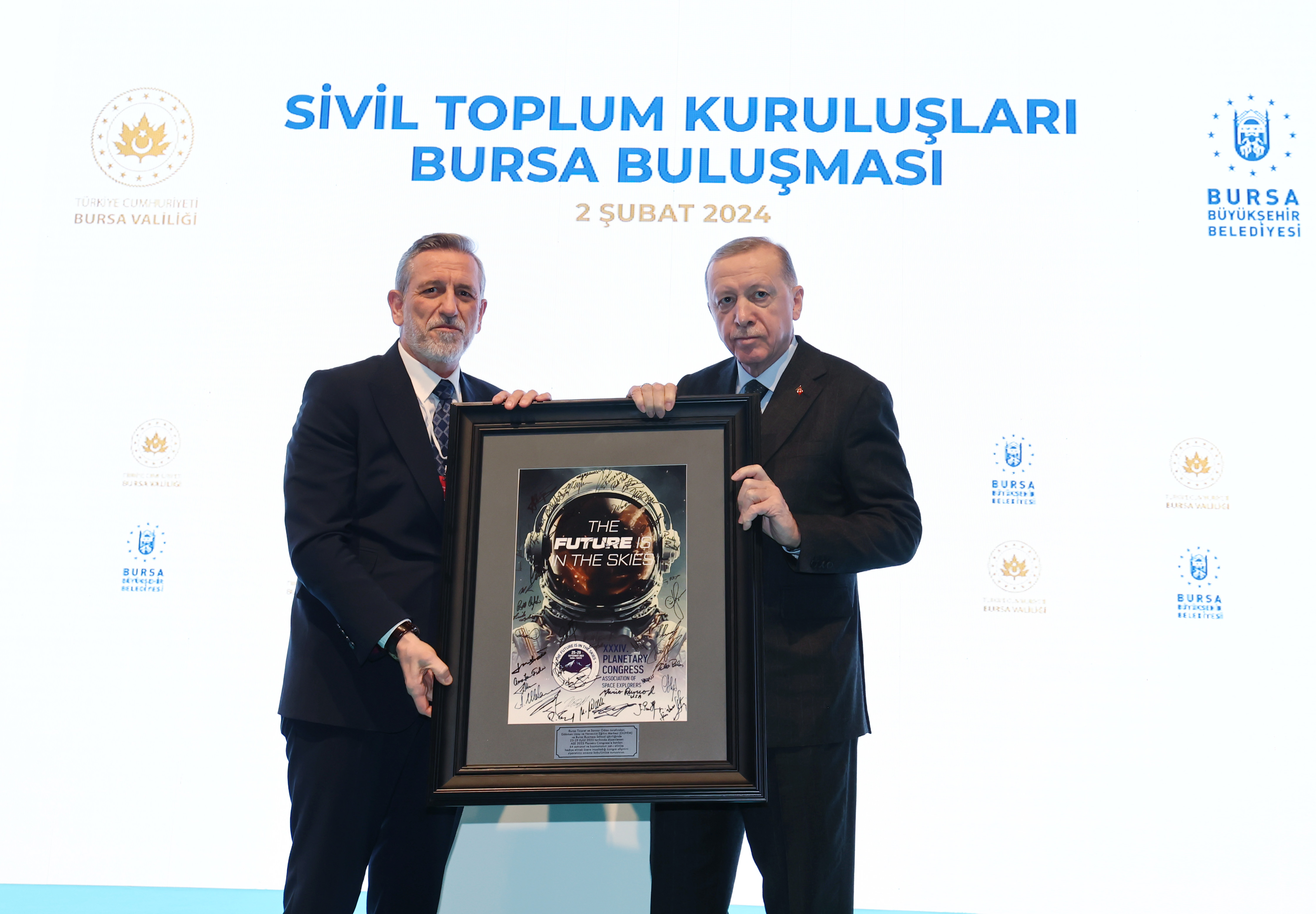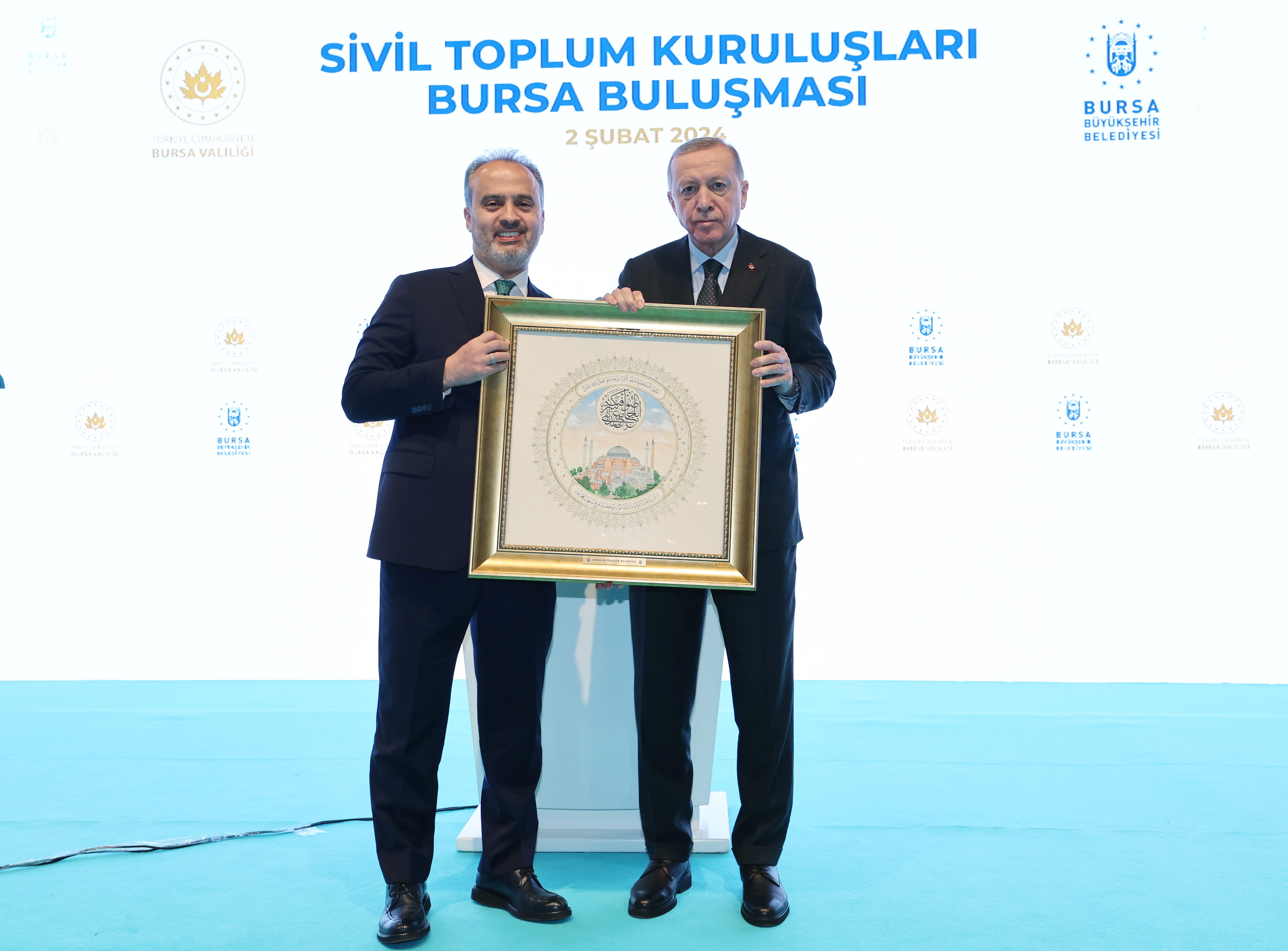 Programda Cumhurbaşkanı Erdoğan'a, Bursa Büyükşehir Belediye Başkanı Alinur Aktaş, Bursa Ticaret ve Sanayi Odası Başkanı İbrahim Burkay ve Bursa Ticaret Borsası Yönetim Kurulu Başkanı Özer Matlı hediye takdim etti.
