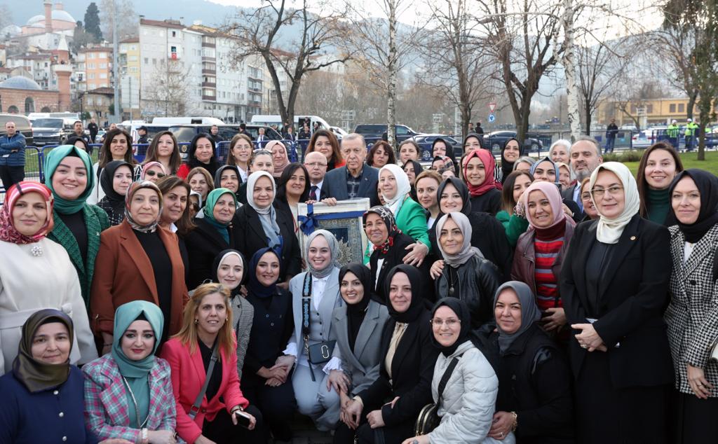 Alanda asılan bir pankartta "Gücüne güç katmaya geldik." yazdığına değinen Cumhurbaşkanı Erdoğan, "Ben de sizden güç almaya geldim. Kadim şehrin AK kadınları yol boyu bizimle oldu. Aramızdaki bu sevgiden, bu aşktan, bu gönül bağından aldığımız güçle inşallah önce 2023 imtihanını başarıyla vereceğiz. Ardından da ülkemizi dünyada hak ettiği yere çıkaracak yeni atılımlara yöneleceğiz." ifadesini kullandı.