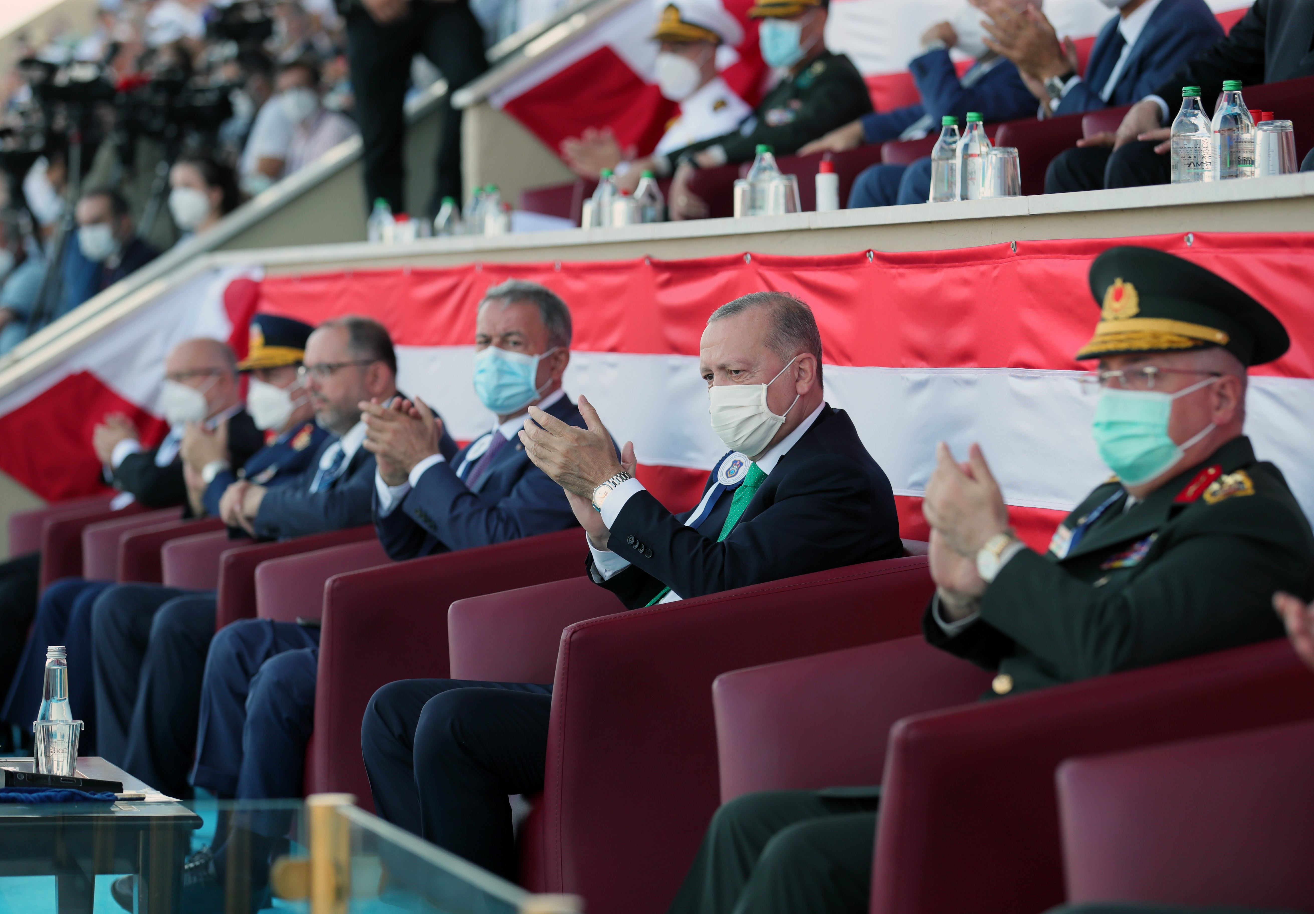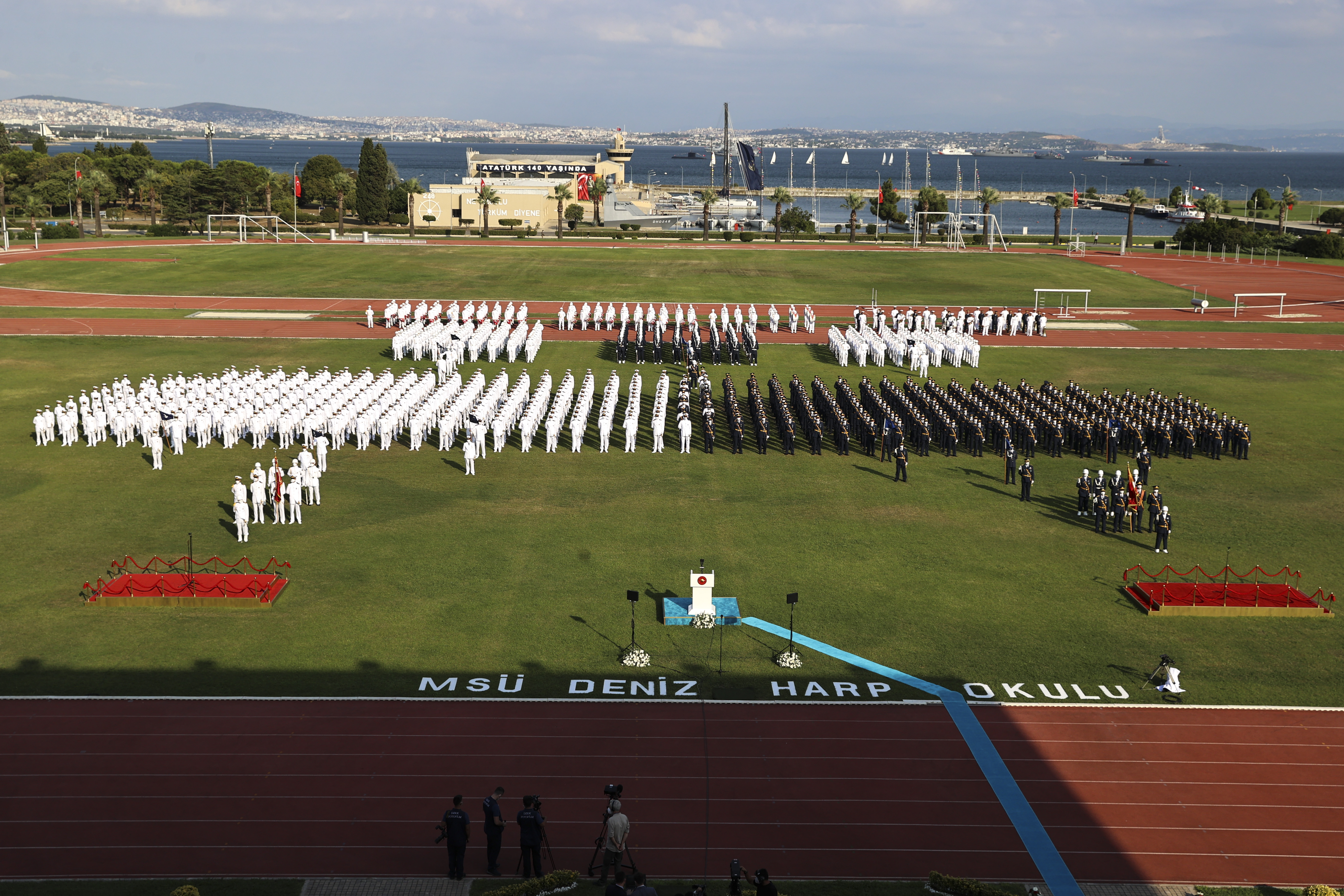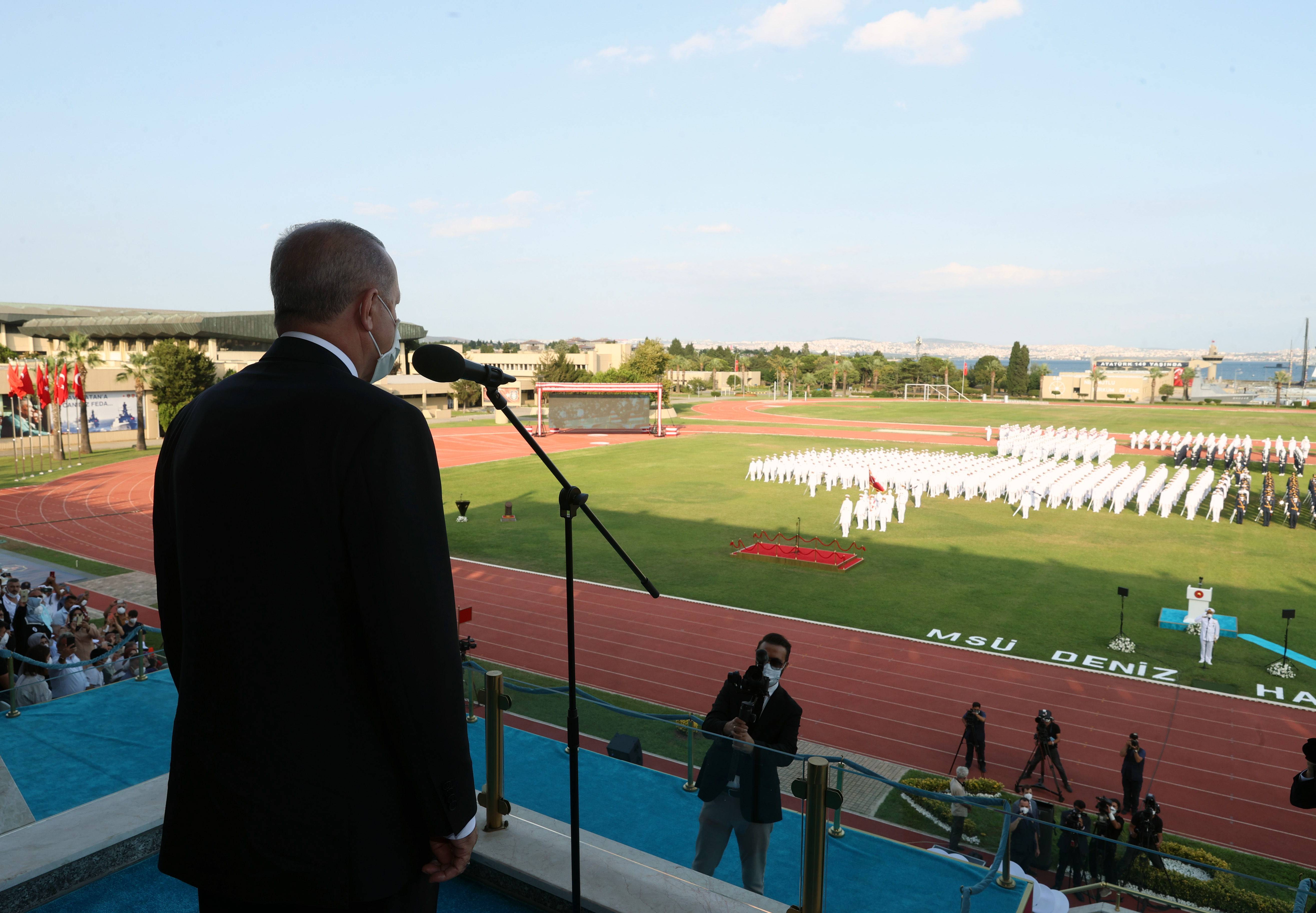 Cumhurbaşkanı Erdoğan, denizcilere ve havacılara hitap ederek, "Denizciler! Geçtiğimiz günlerde 950. yıl dönümüne ulaştığımız Malazgirt Zaferi'nin hemen ardından Çaka Bey'le başlayan denizlerdeki hakimiyetimizi güçlendirmemize sizler de katkıda bulunacaksınız. Havacılar! Dünyanın ilk askerî havacılık teşkilatlarından olan ve 1911'den beri semalarımızı koruyan hava kuvvetlerimizin artık çok geniş bir alana yayılan faaliyetlerine sizler destek vereceksiniz. Millî Savunma Üniversitemizin yeni yapısı ve kadrosuyla faaliyete geçmesinin ardından, 4 yıllık eğitimlerini tamamlayarak mezun olan teğmenlerimizle Türk Silahlı Kuvvetlerimiz artık daha güçlüdür, daha kabiliyetlidir ve daha özgüvenlidir." şeklinde konuştu.