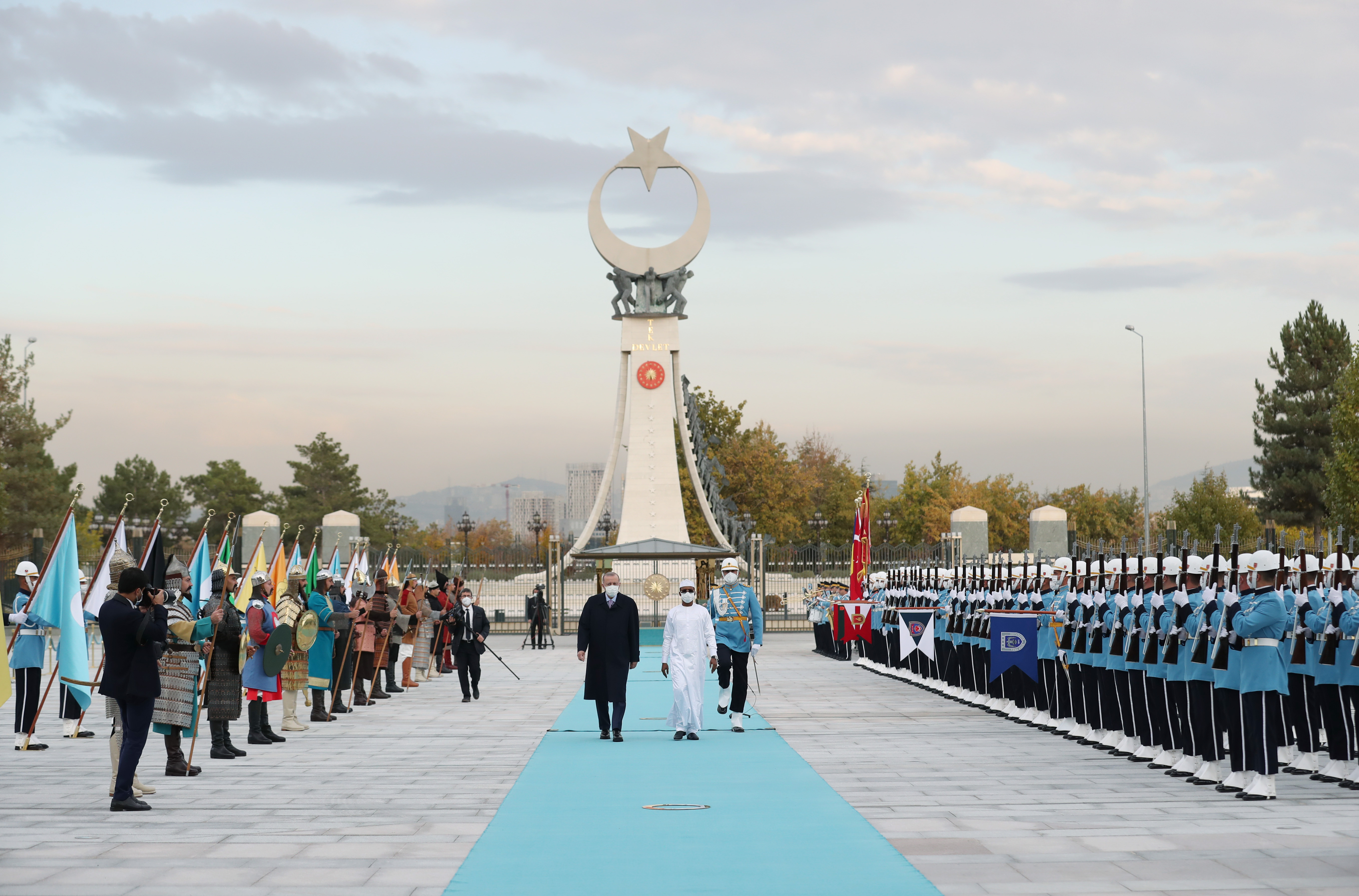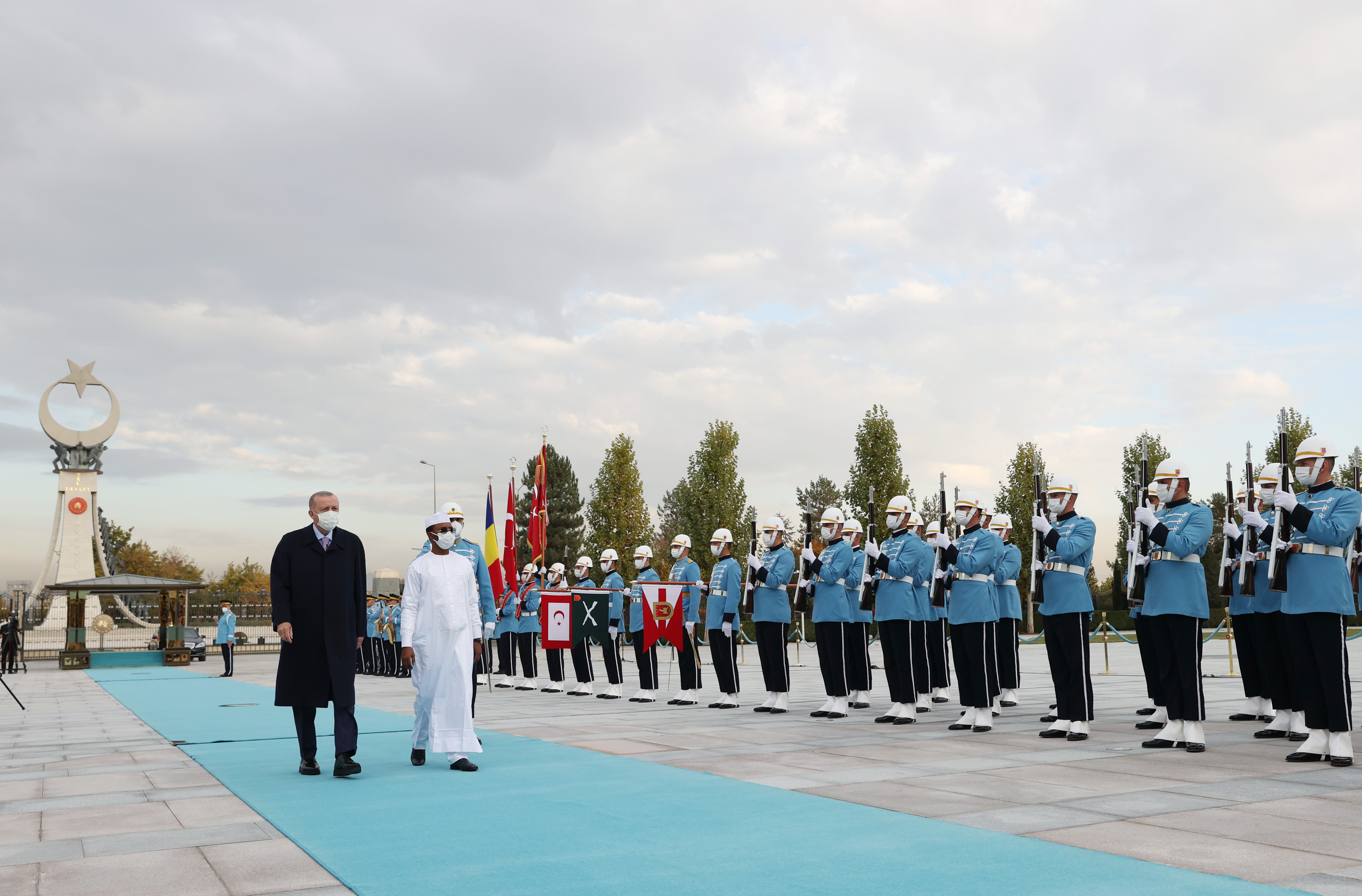 Cumhurbaşkanı Erdoğan ve Çad Geçiş Dönemi Devlet Başkanı Itno'nun tören alanındaki yerlerini almalarının ardından, 21 pare top atışı eşliğinde iki ülkenin milli marşları çalındı. Çad Geçiş Dönemi Devlet Başkanı Itno, Muhafız Alayı Tören Kıtası'nı selamladı. Törende, tarihte kurulan 16 Türk devletini temsil eden bayraklar ve askerler de yer aldı.