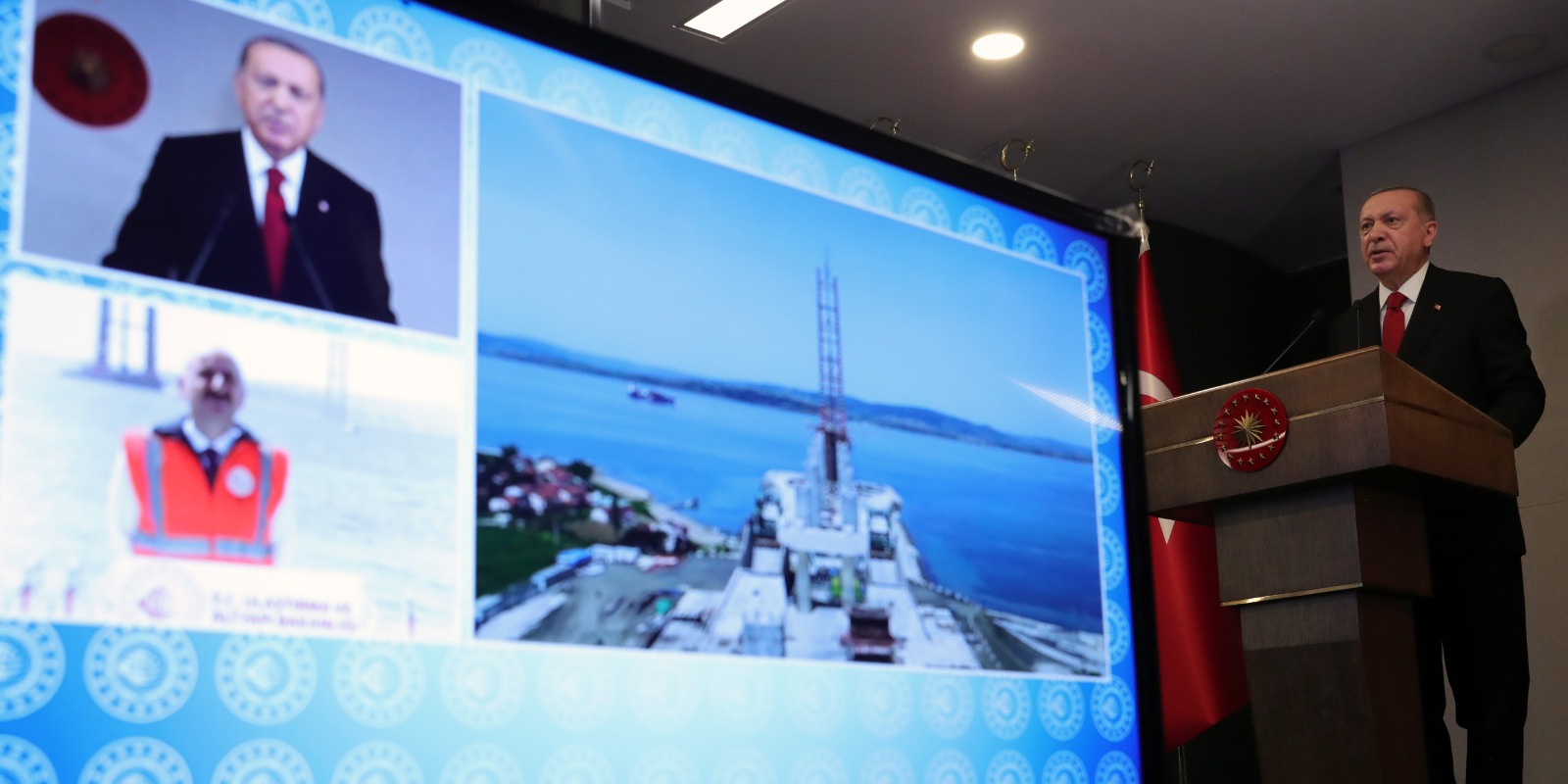 Cumhurbaşkanı Recep Tayyip Erdoğan, 1915 Çanakkale Köprüsü'nün 318 metrelik çelik kulelerinin son blokunun yerleştirilmesi dolayısıyla düzenlenen törene, video konferans ile katıldı.