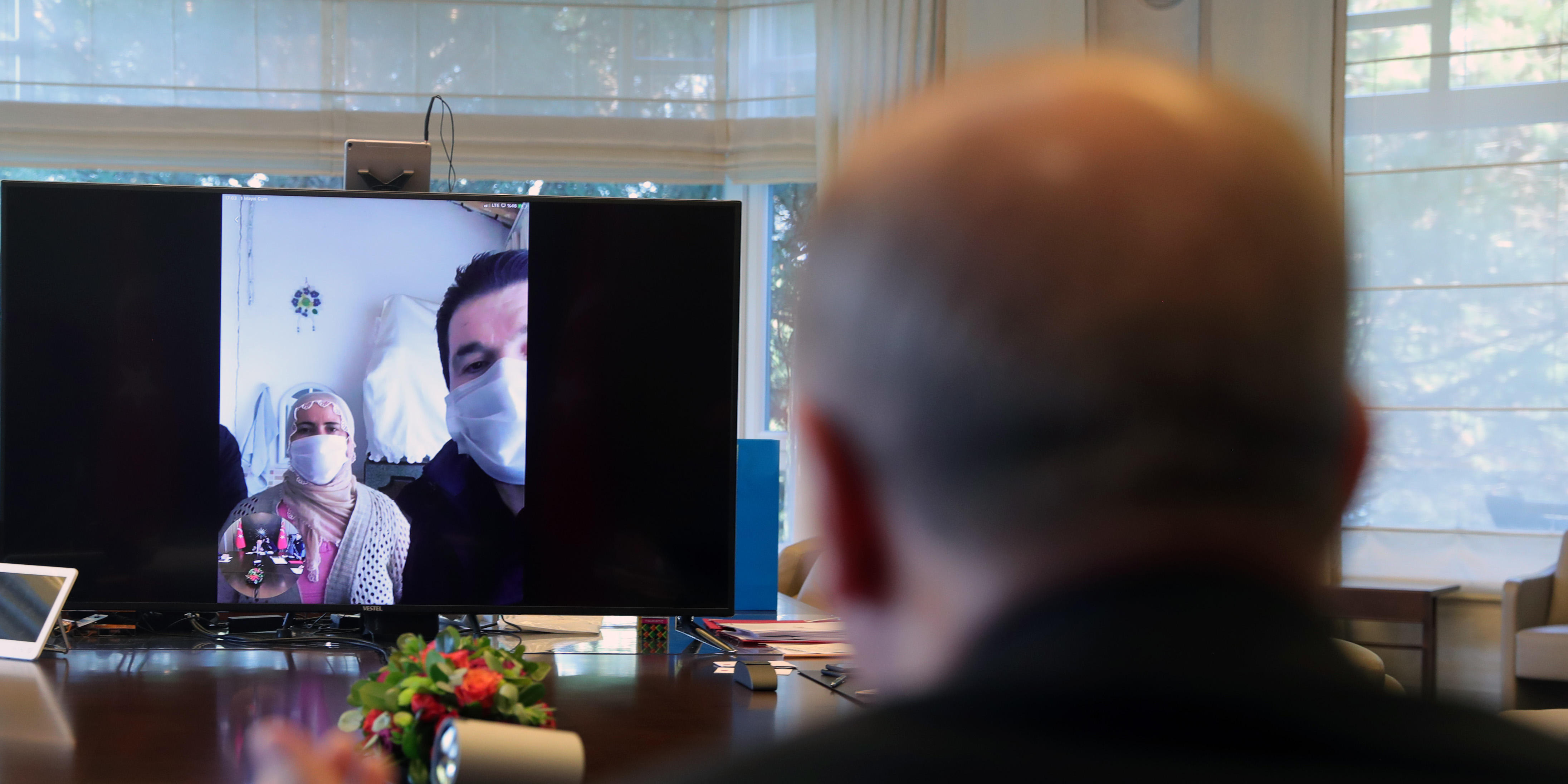 Cumhurbaşkanı Erdoğan, yeni tip koronavirüs (Kovid-19) salgınından kurtulma temennisinde bulunan aile bireylerine, "Tabii sizin başınızdaki dert çok daha farklı bir dert. İnşallah Rabb'im yavrunuza da en kısa zamanda kavuşmayı nasip eder." dedi.