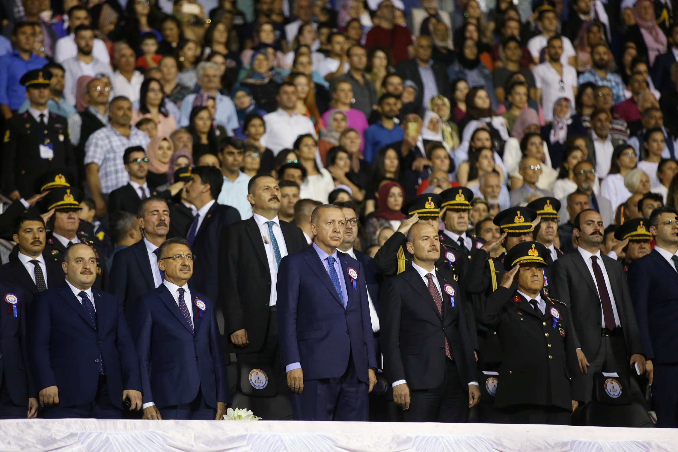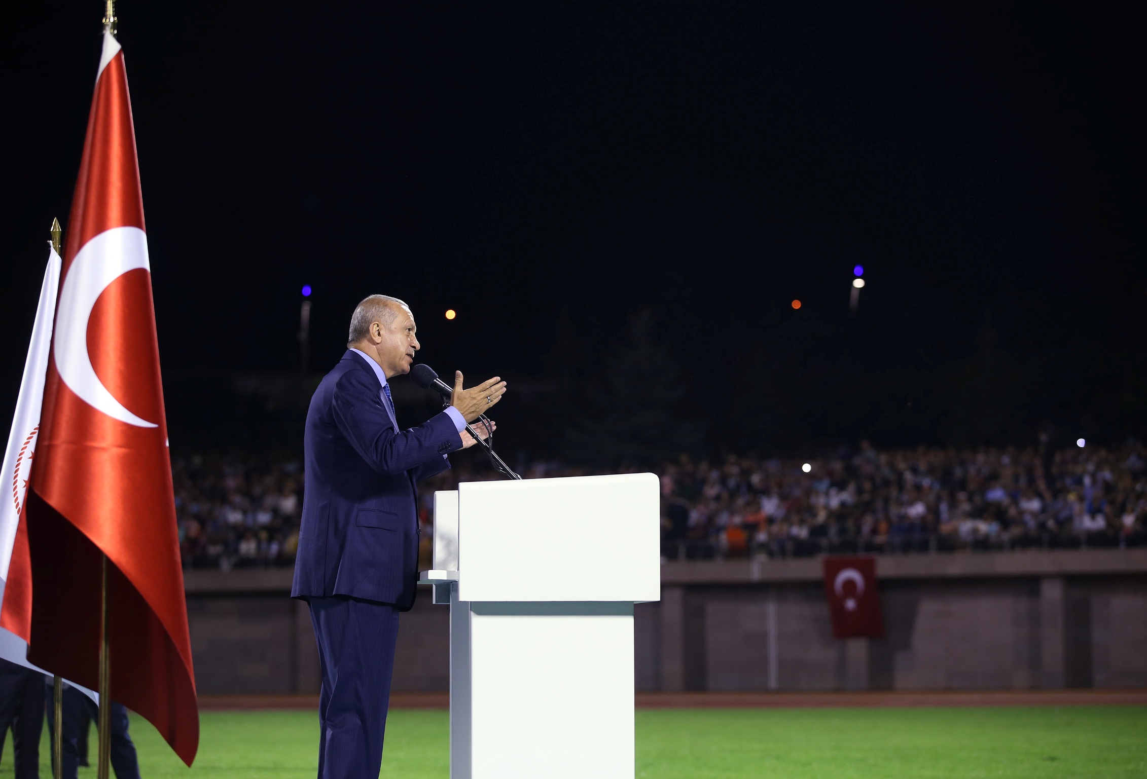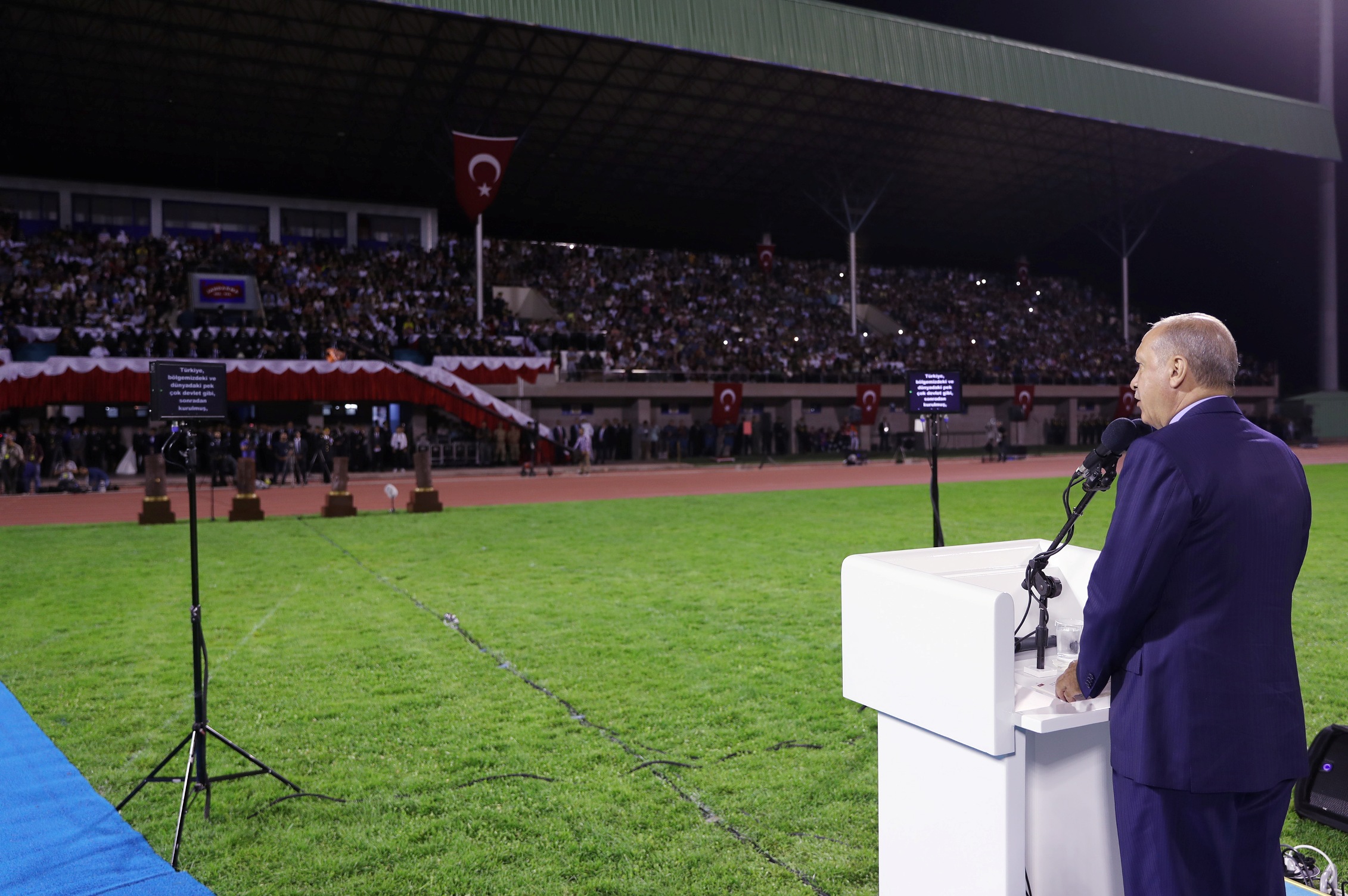 "Bizim tek hedefimiz var. Şu anda bu stadyumun içerisinde biz tek millet, tek bayrak, tek vatan, tek devlet olarak geleceğe yürüyoruz. Tek bir yürek olarak çarptığında 82 milyona güçleri yetmediği için bu milleti etnik ve mezhep ayrımı yanında siyasi, sosyal, kültürel, ekonomik bahanelerle mümkün olduğu kadar çok ve küçük parçalara ayırmanın peşindeler ama başaramayacaklar. Bu milletin kardeşliğine halel getiremeyecekler. Bayrağını indiremedikleri, ezanını susturamadıkları, vatanımızı bölemedikleri, devletimizi yıkamadıkları bu millet, günü geldiğinde elbette onları da yola getirecektir. Tarihte bu millete kötülük edip, ihanet edip, yüreğini kanatıp da iflah olmuş kimse yoktur."