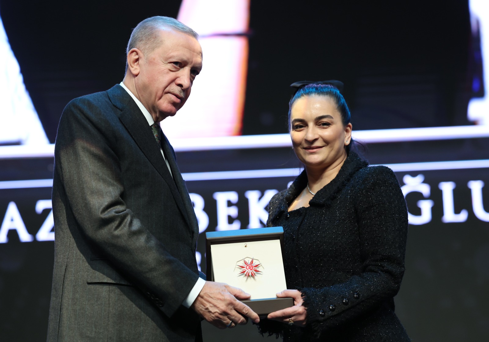 Edebiyat ödülünün, hikâye, deneme, roman ve incelemelerden oluşan onlarca eseriyle geçmişten bugüne köprüler kurmuş bir yazara, Nazan Bekiroğlu'na takdim edildiğini belirten Cumhurbaşkanı Erdoğan, şunları kaydetti: