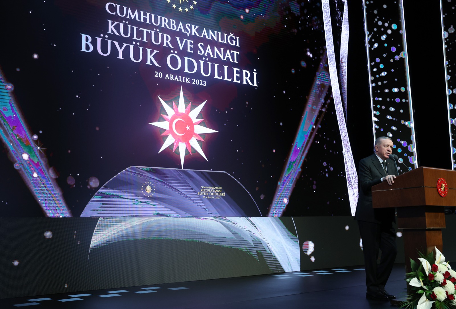 Bu kutlu yolda en büyük desteği kültür-sanat insanlarından beklediklerini dile getiren Cumhurbaşkanı Erdoğan, "Kültür-sanat insanlarımızın ruhunu biçimlendirmediği, gönlünü kıpırdatmadığı, kalp atışını hızlandırmadığı bir kalkınma programı, sadece şekilden, yani cesetten ibaret kalır. Sizlerden alacağımız güçle, dünyaya Türkiye Yüzyılı'nın mührünü, ruhu ve bedeniyle bir bütün olarak vuracağımıza yürekten inanıyorum. Bu duygularla, 2023 yılı Cumhurbaşkanlığı Kültür ve Sanat Büyük Ödüllerini takdim ettiğimiz sanatçılarımızı ve temsilcilerini bir kez daha tebrik ediyor, milletim adına kendilerine şükranlarımı sunuyorum." dedi.